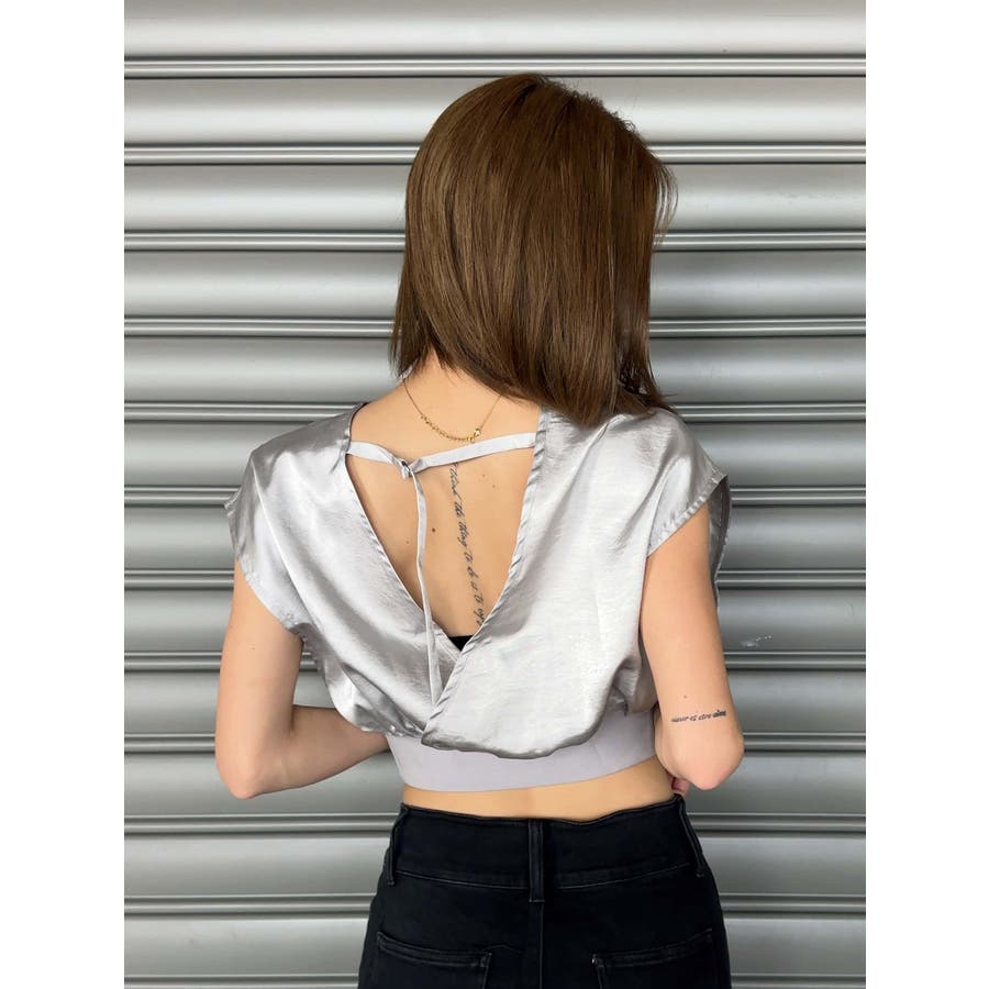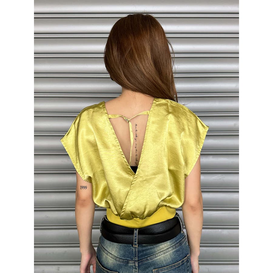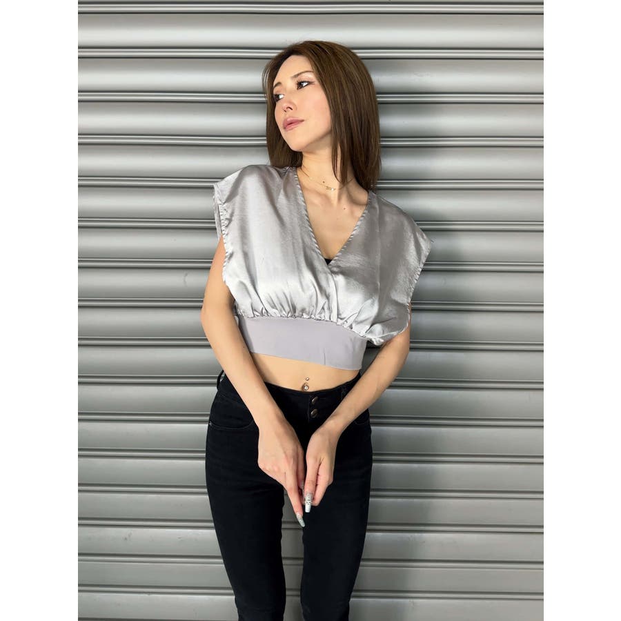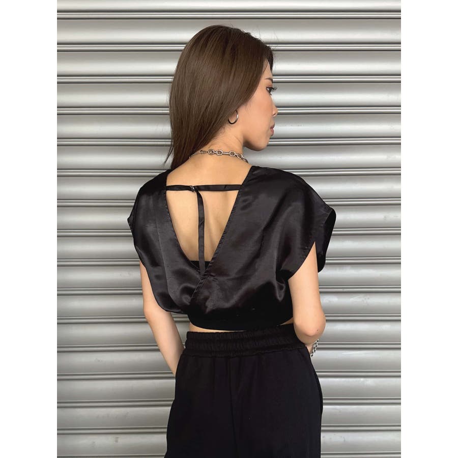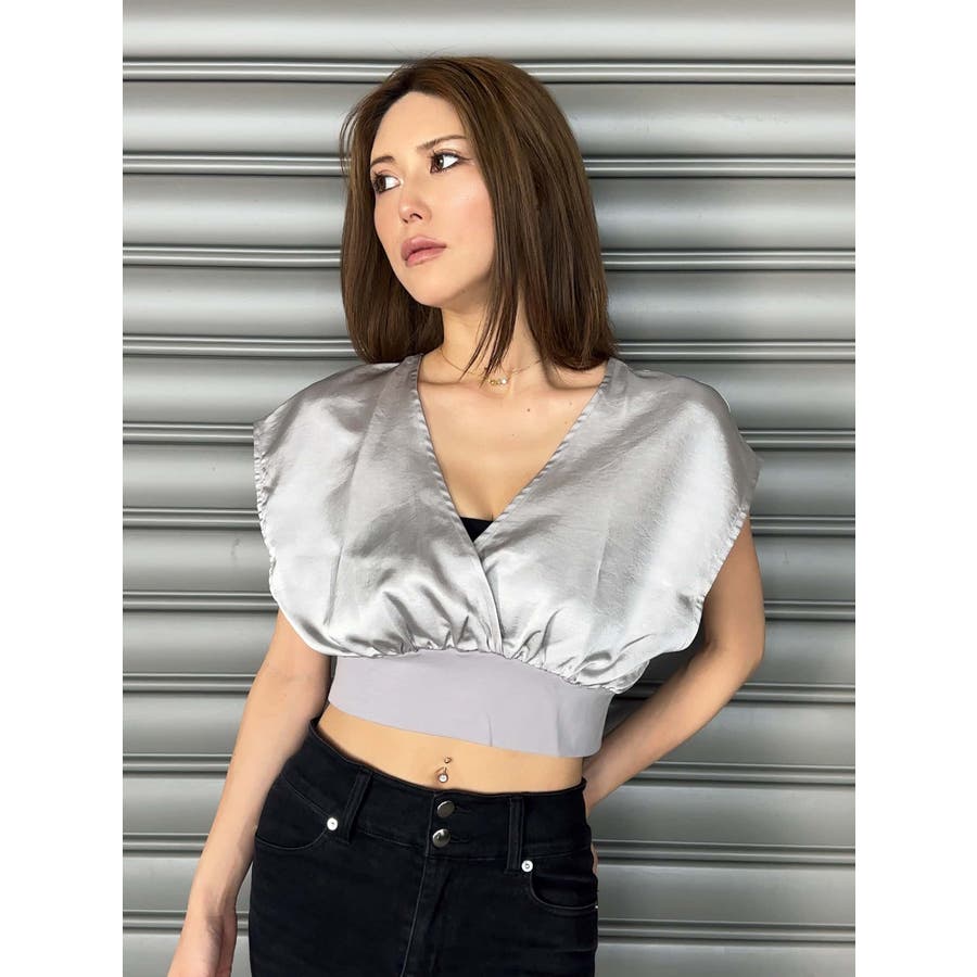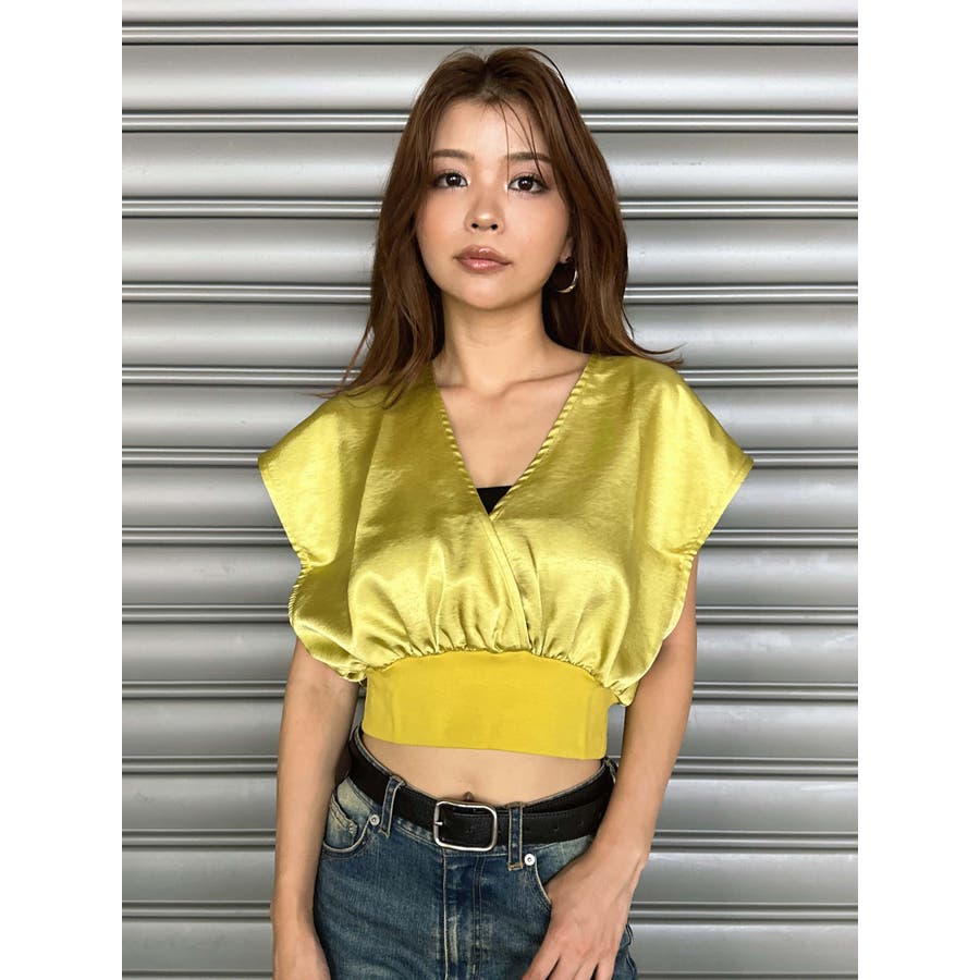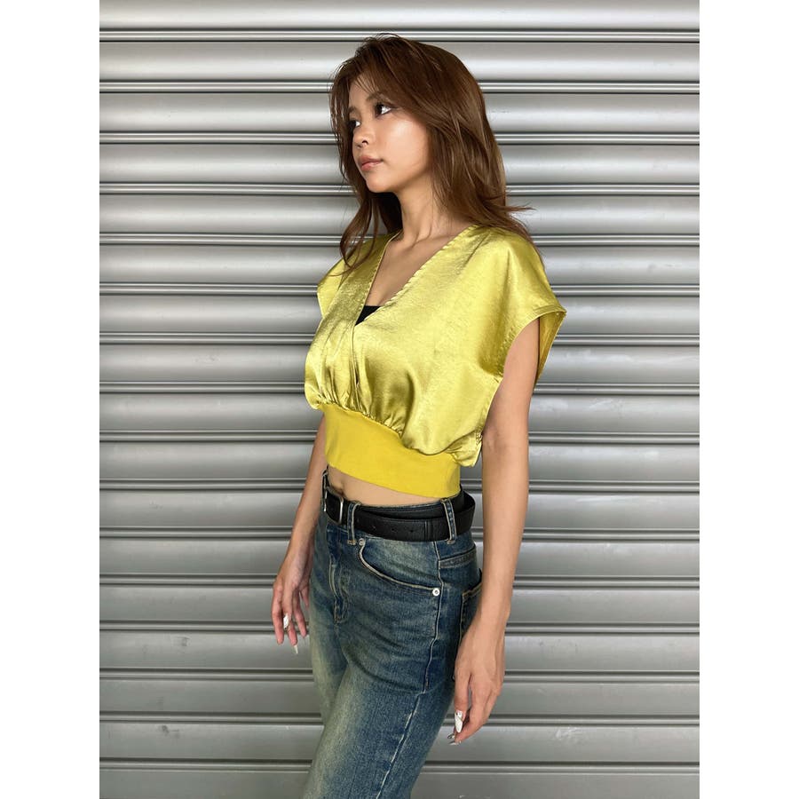 サテン素材の光沢がトレンド感漂うショート丈トップス。前後カシュクール仕様ですが、Backは肩の開き具合とズレ落ち防止のため調整ストラップが付いています。脇はウエストのリブ付近まで開いているのでインナーを見せるレイヤードコーデが楽しめます。バスト上はゆったりですがウエストのリブでタイトに引き締めているので、ボトムのジャンルは選ばすにメリハリあるスタイリングが組めます。気になる二の腕周りを隠しつつ動きやすいデザインです。