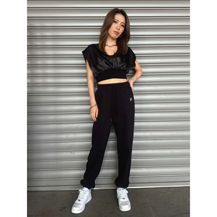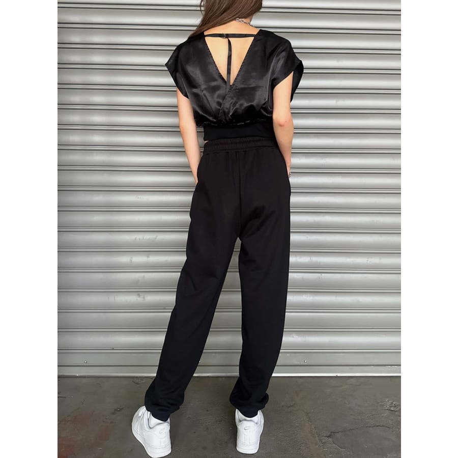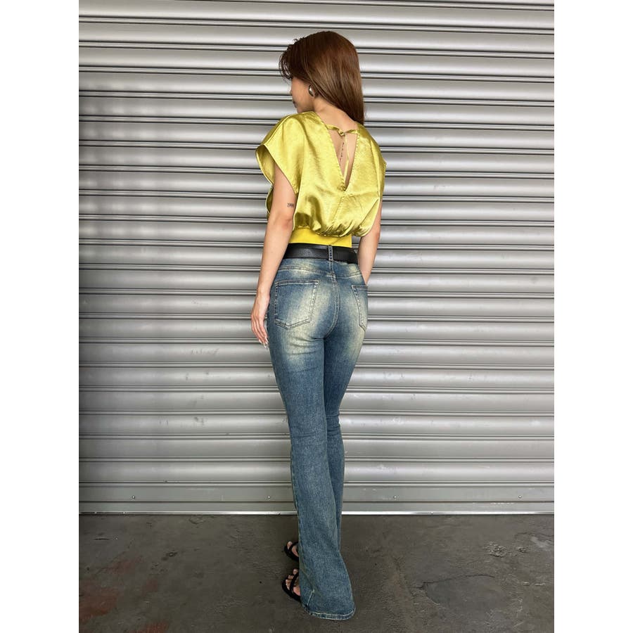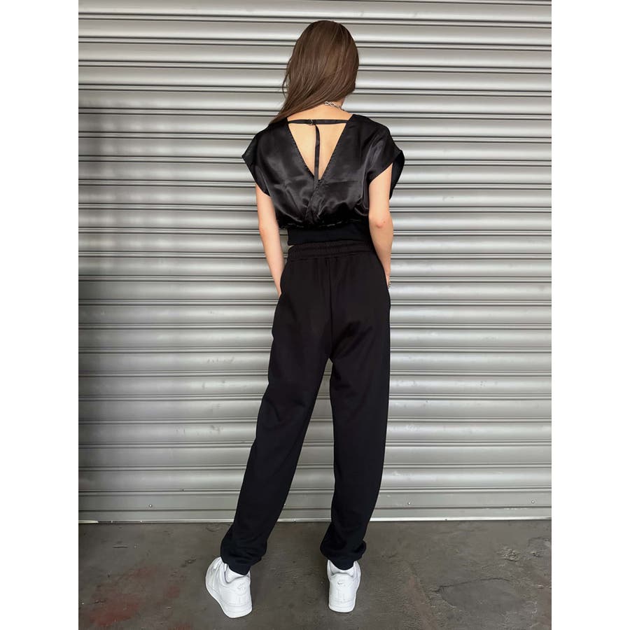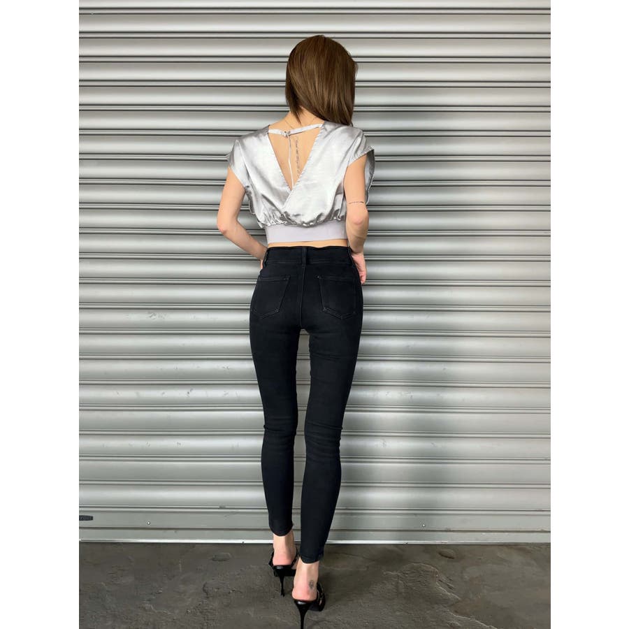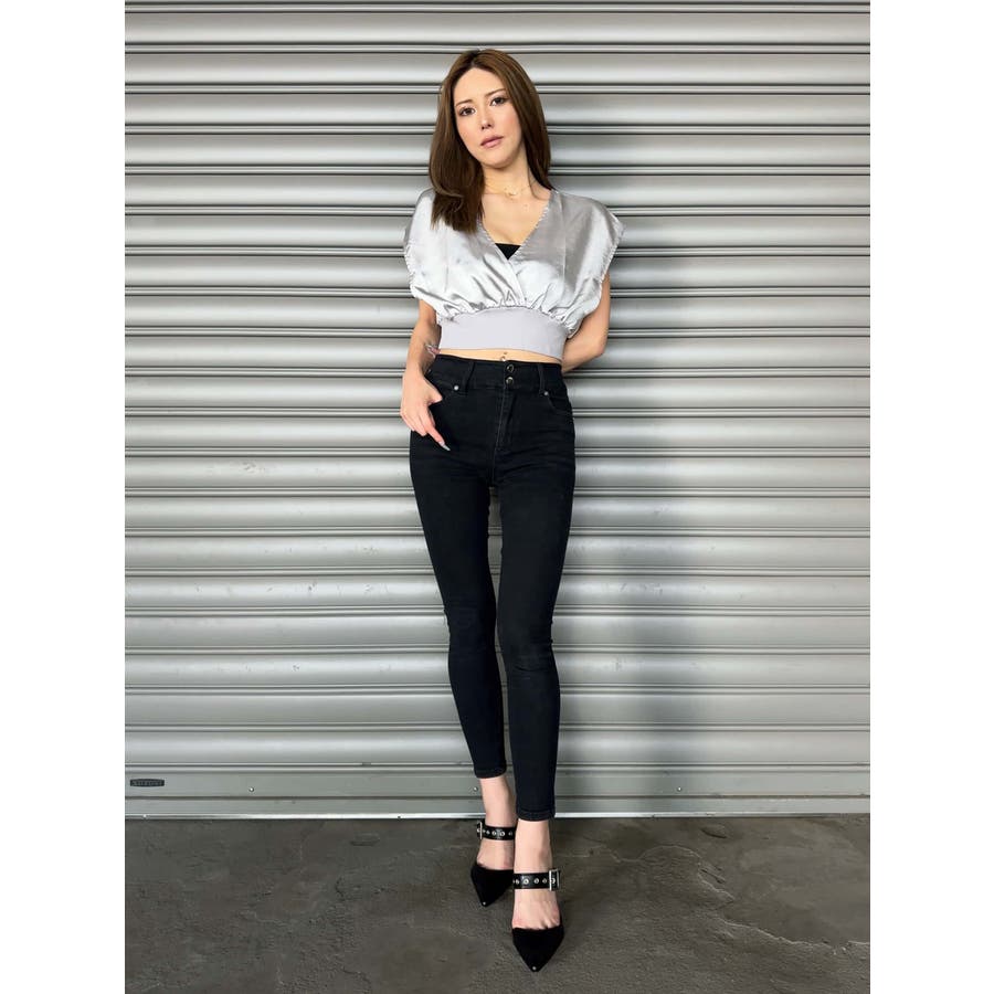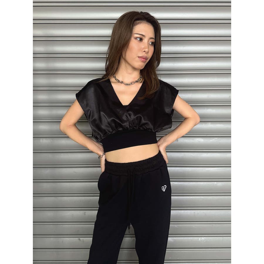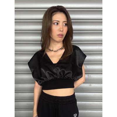 サテン素材の光沢がトレンド感漂うショート丈トップス。前後カシュクール仕様ですが、Backは肩の開き具合とズレ落ち防止のため調整ストラップが付いています。脇はウエストのリブ付近まで開いているのでインナーを見せるレイヤードコーデが楽しめます。バスト上はゆったりですがウエストのリブでタイトに引き締めているので、ボトムのジャンルは選ばすにメリハリあるスタイリングが組めます。気になる二の腕周りを隠しつつ動きやすいデザインです。