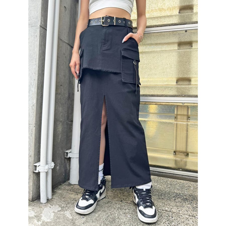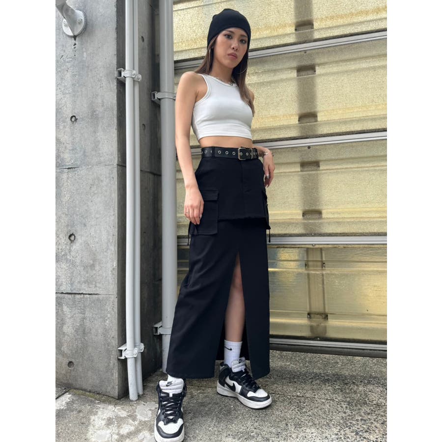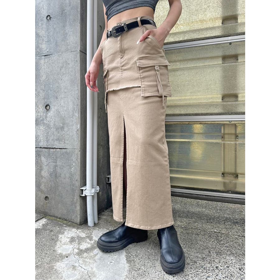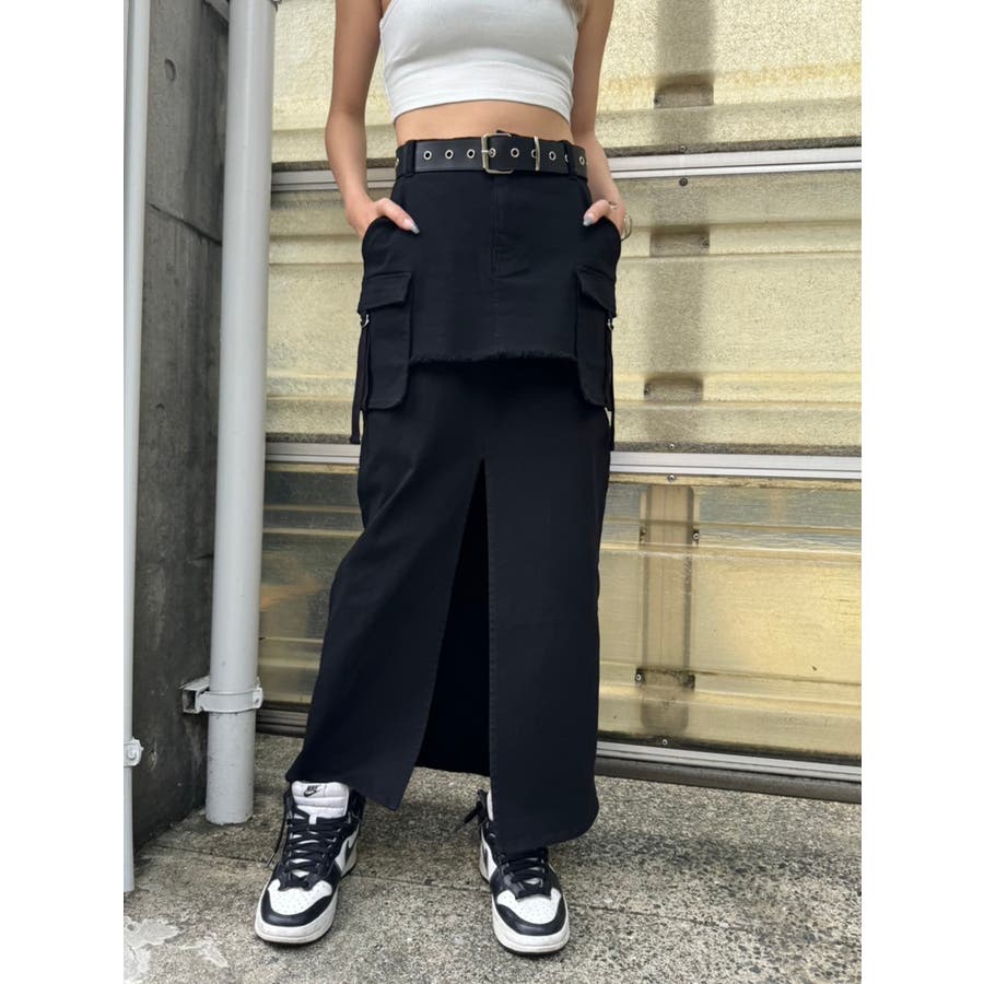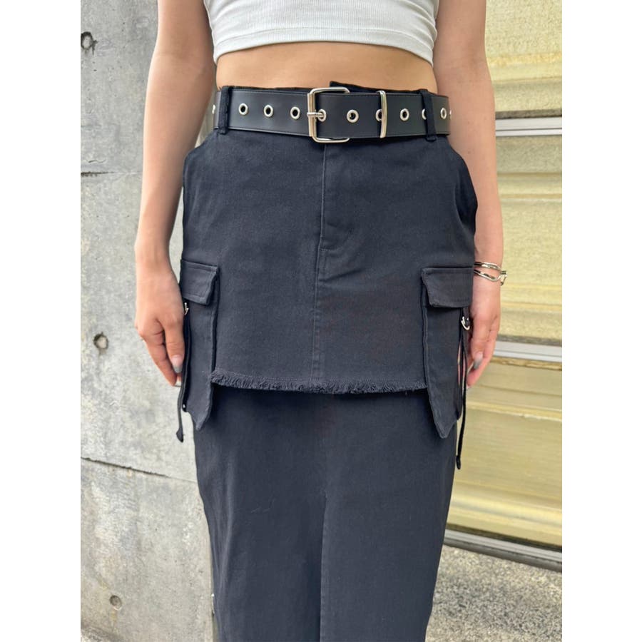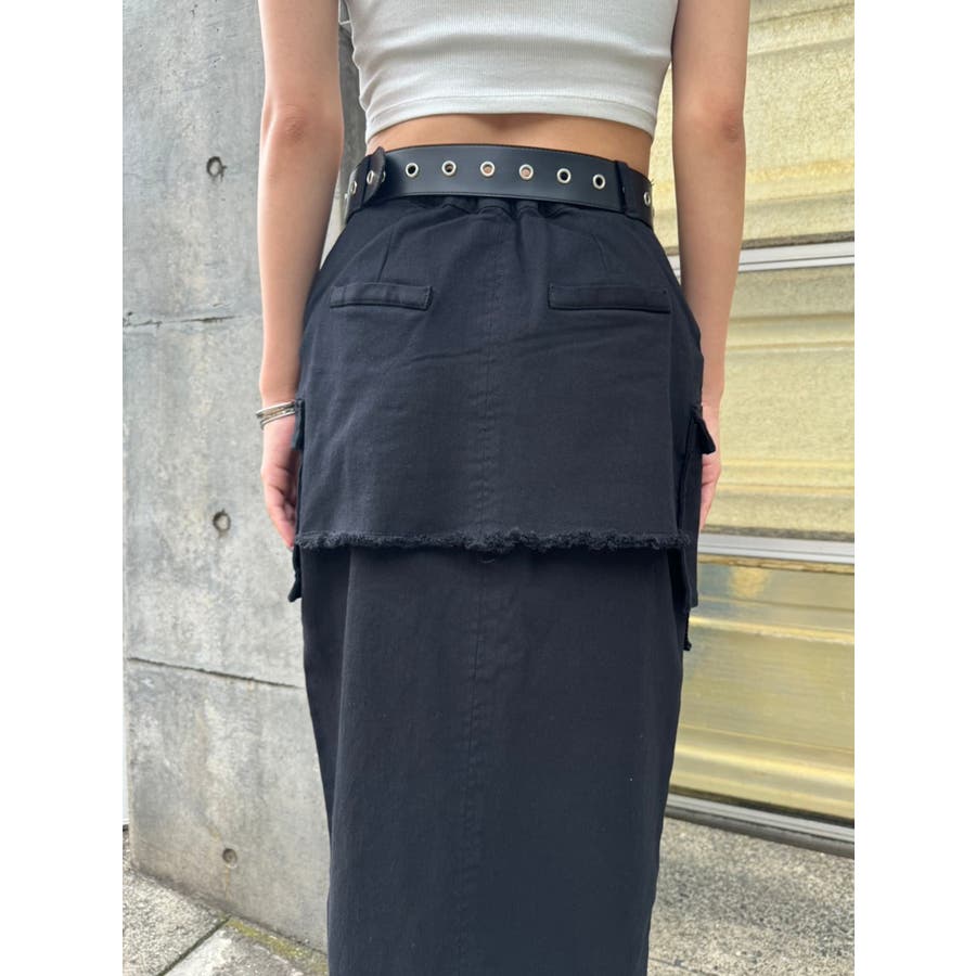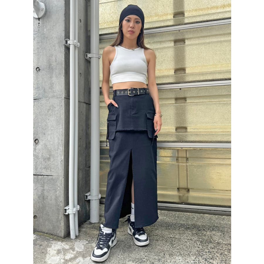カーゴミニスカートにロングスカートをレイヤードしているようなシーズンレスで活躍するタイトロングスカート。ストレッチが効いている生地なのでタイトラインでも気にせずアクティブに過ごせます。ミニスカートと重ねたロングスカートとの着丈バランスを調整しスタイルアップを計算したシルエット。それぞれの裾始末を変えてよりレイヤード感を出し、フロントに深く入れたスリットで抜け感とヘルシーな肌見せをプラスしました。重なっている部分は厚手にならないよう生地を薄いものにと着心地にも拘っています。バックウエストのみゴム仕様。