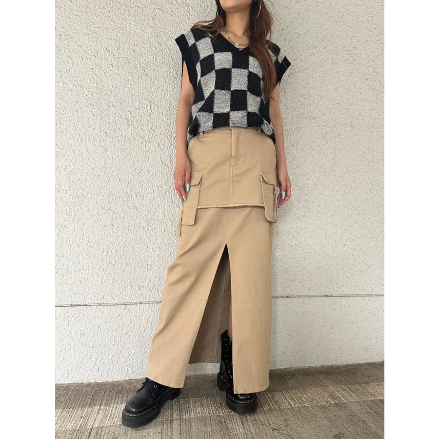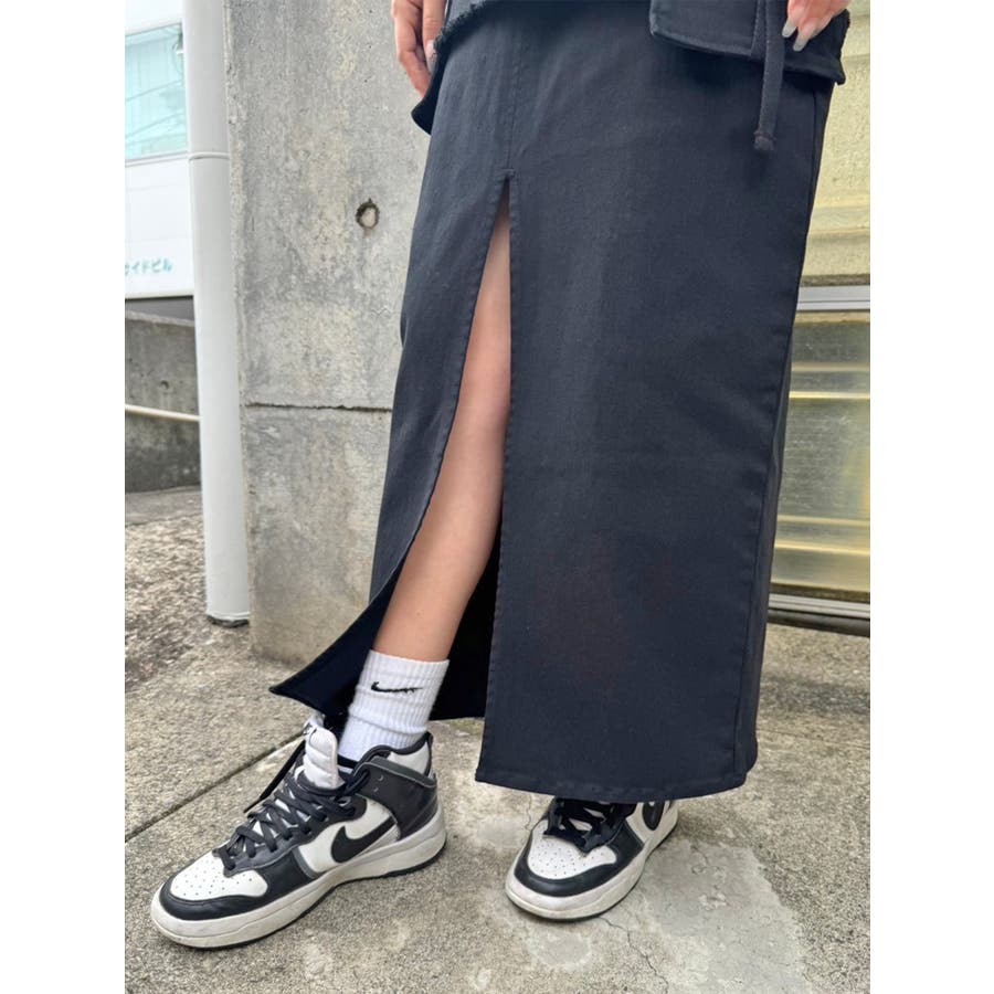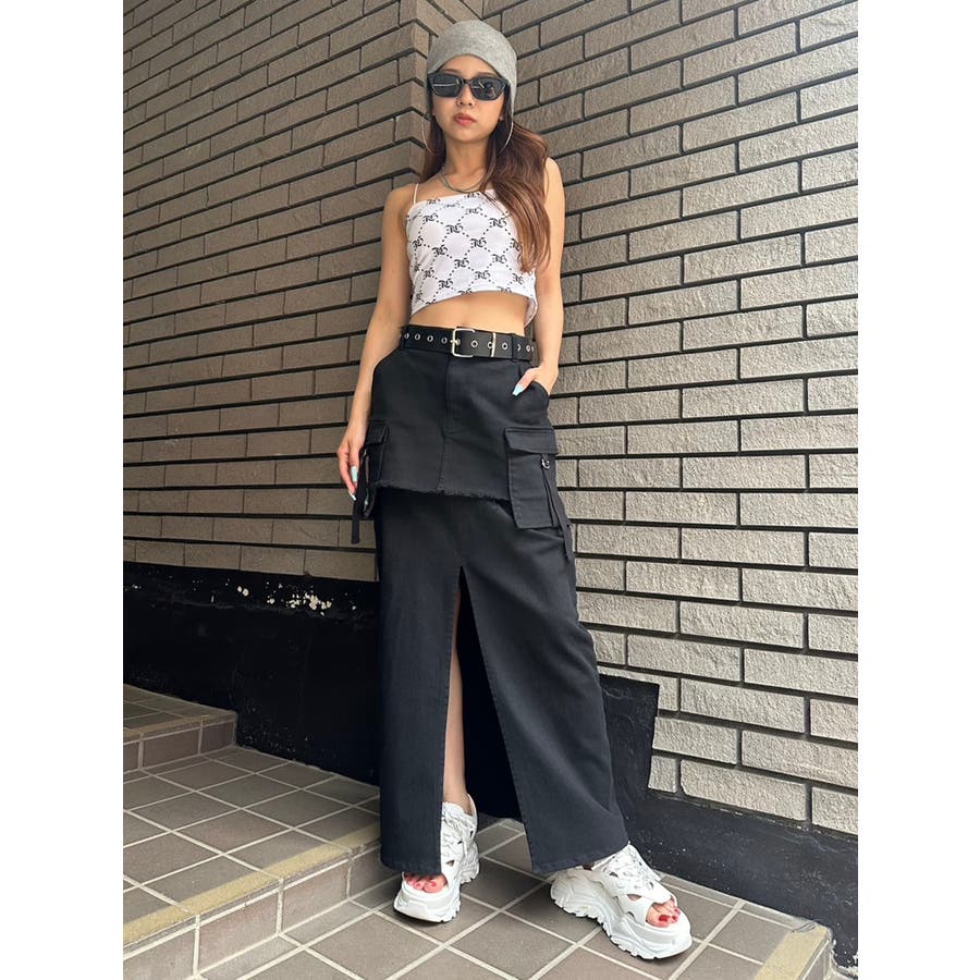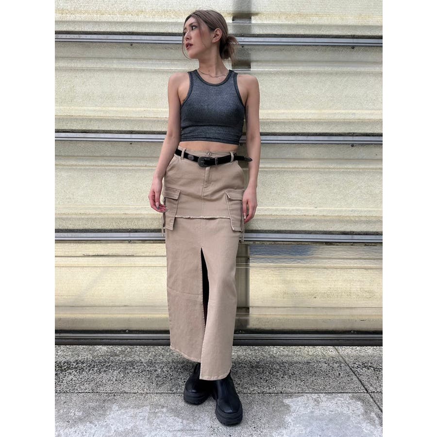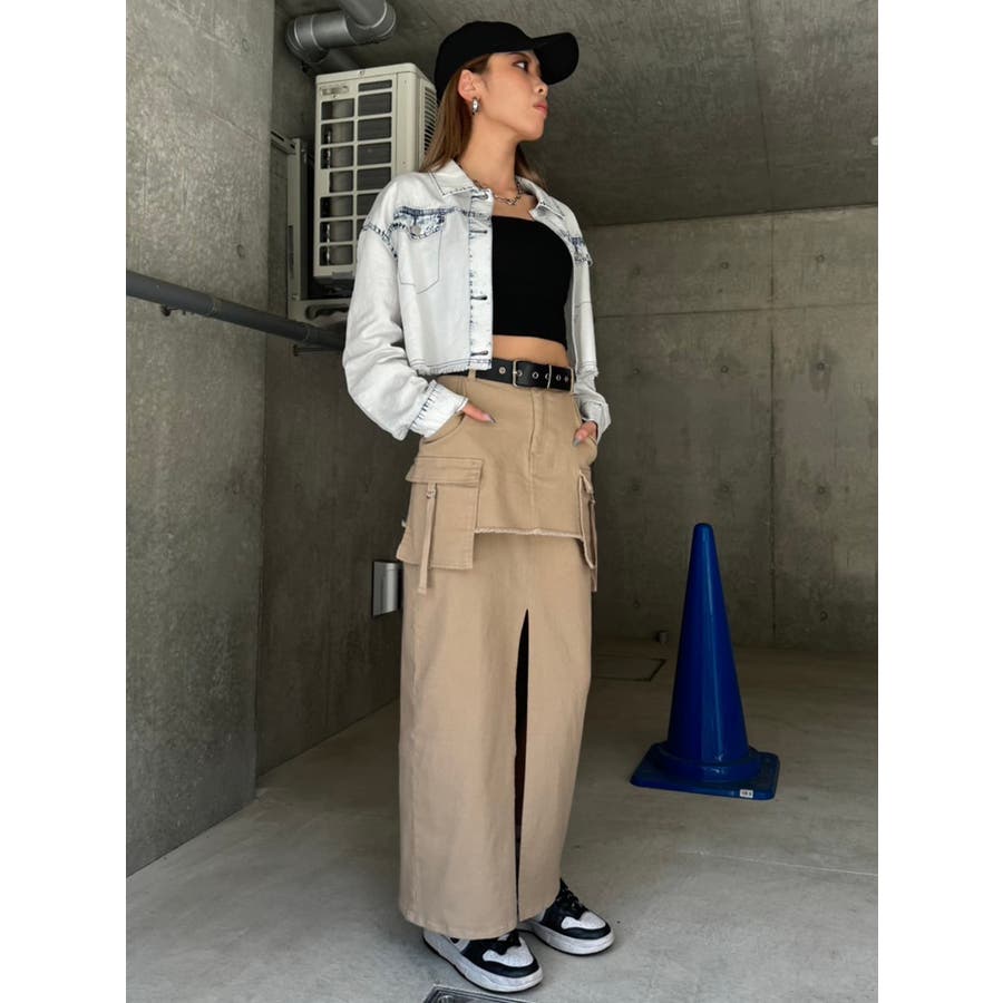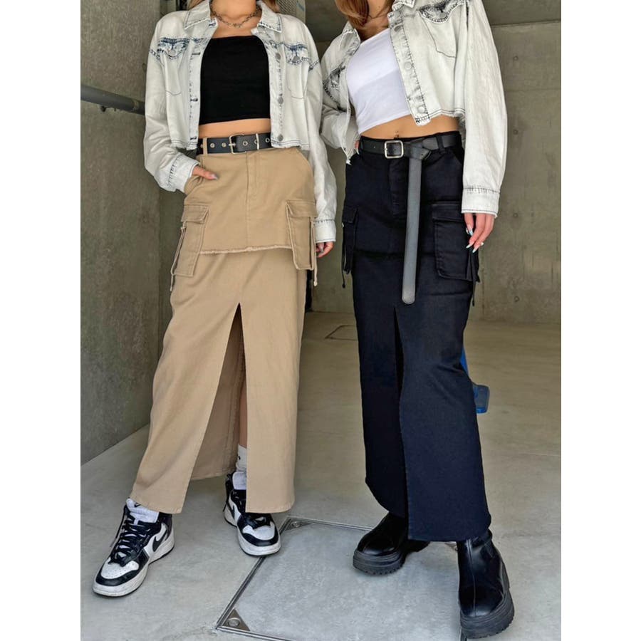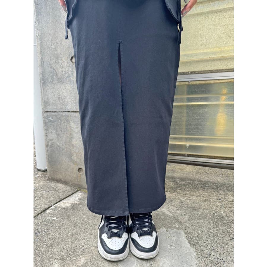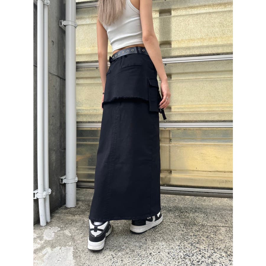 カーゴミニスカートにロングスカートをレイヤードしているようなシーズンレスで活躍するタイトロングスカート。ストレッチが効いている生地なのでタイトラインでも気にせずアクティブに過ごせます。ミニスカートと重ねたロングスカートとの着丈バランスを調整しスタイルアップを計算したシルエット。それぞれの裾始末を変えてよりレイヤード感を出し、フロントに深く入れたスリットで抜け感とヘルシーな肌見せをプラスしました。重なっている部分は厚手にならないよう生地を薄いものにと着心地にも拘っています。バックウエストのみゴム仕様。
