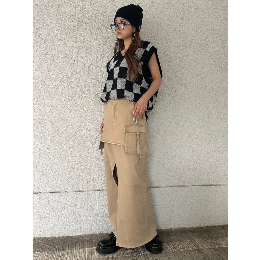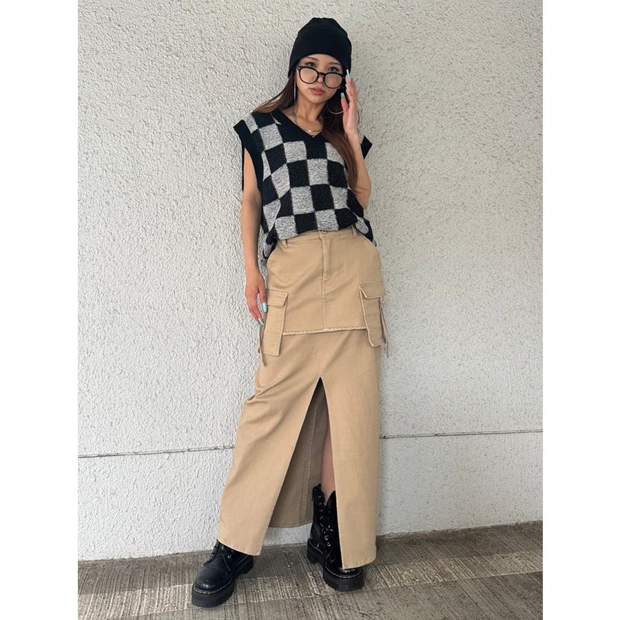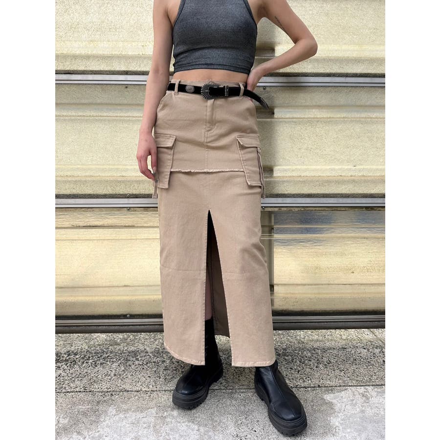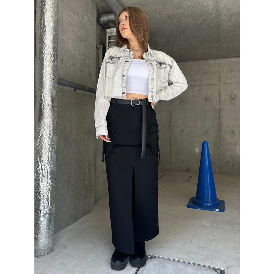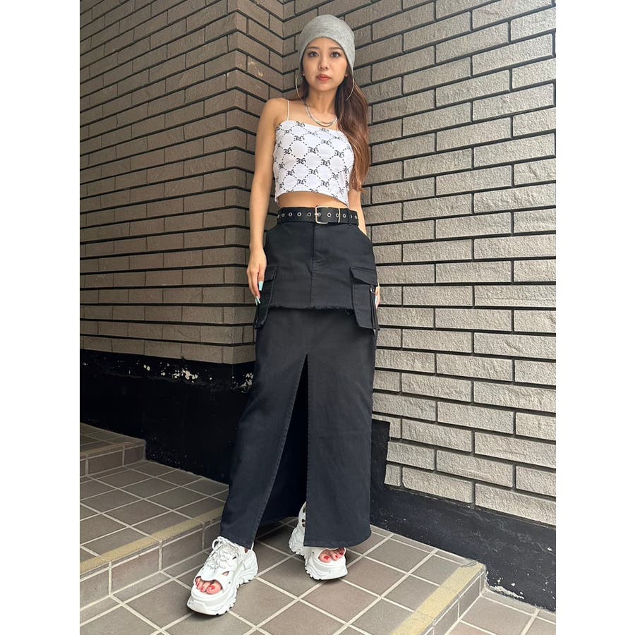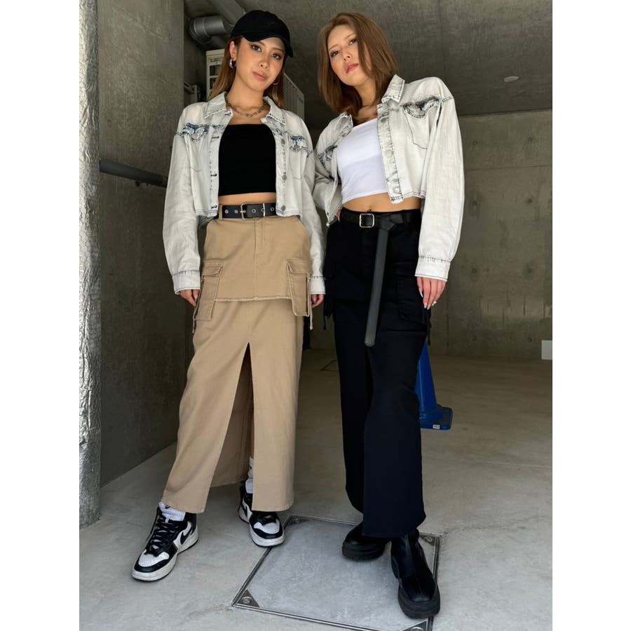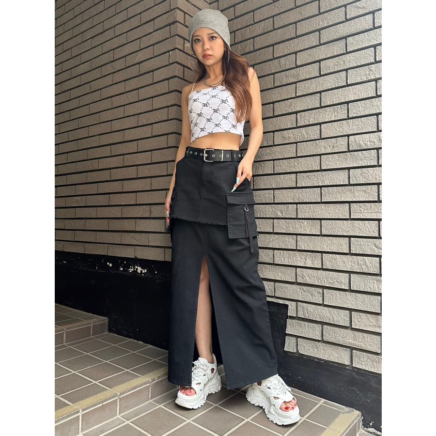 カーゴミニスカートにロングスカートをレイヤードしているようなシーズンレスで活躍するタイトロングスカート。ストレッチが効いている生地なのでタイトラインでも気にせずアクティブに過ごせます。ミニスカートと重ねたロングスカートとの着丈バランスを調整しスタイルアップを計算したシルエット。それぞれの裾始末を変えてよりレイヤード感を出し、フロントに深く入れたスリットで抜け感とヘルシーな肌見せをプラスしました。重なっている部分は厚手にならないよう生地を薄いものにと着心地にも拘っています。バックウエストのみゴム仕様。