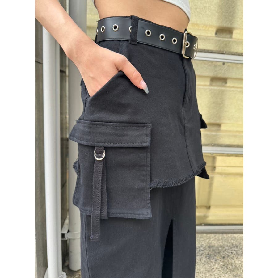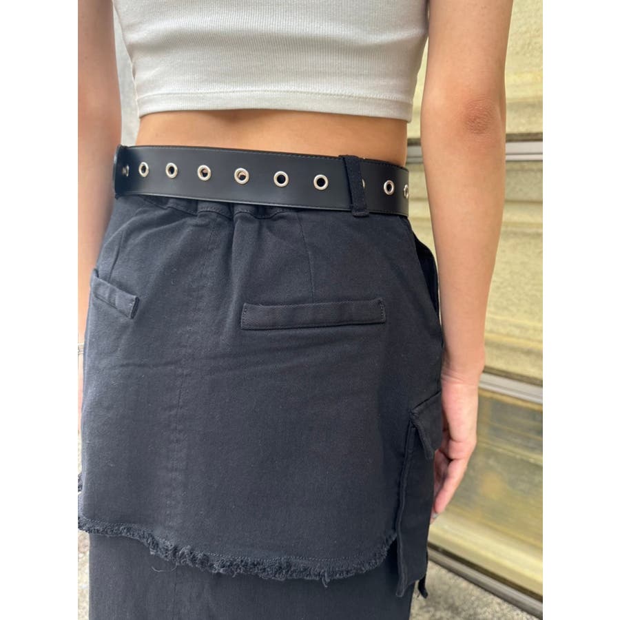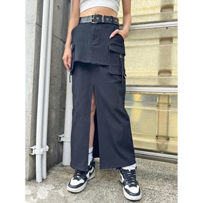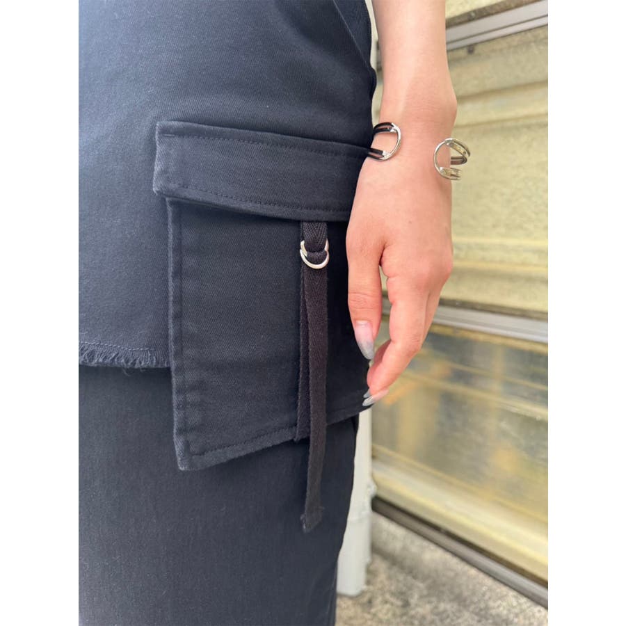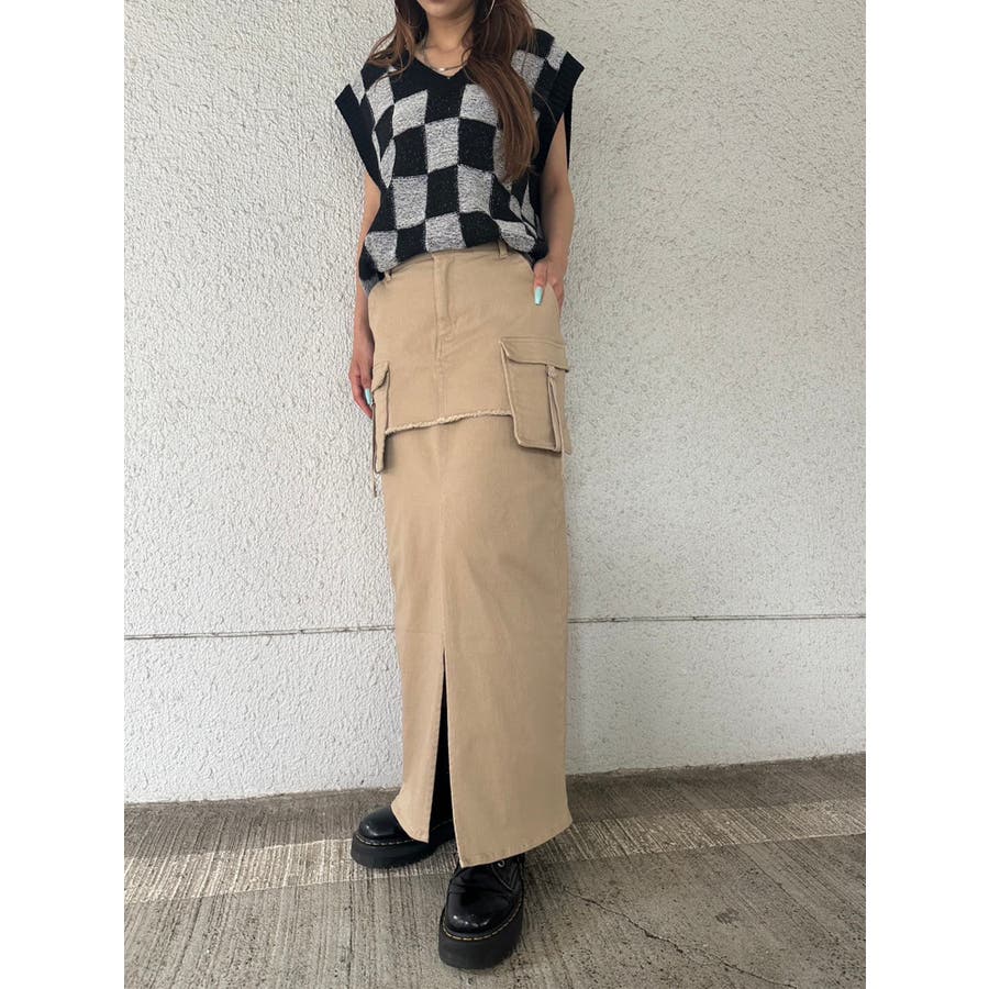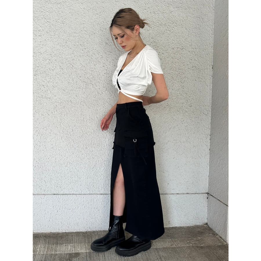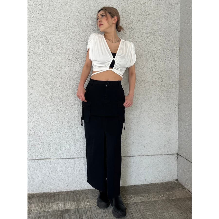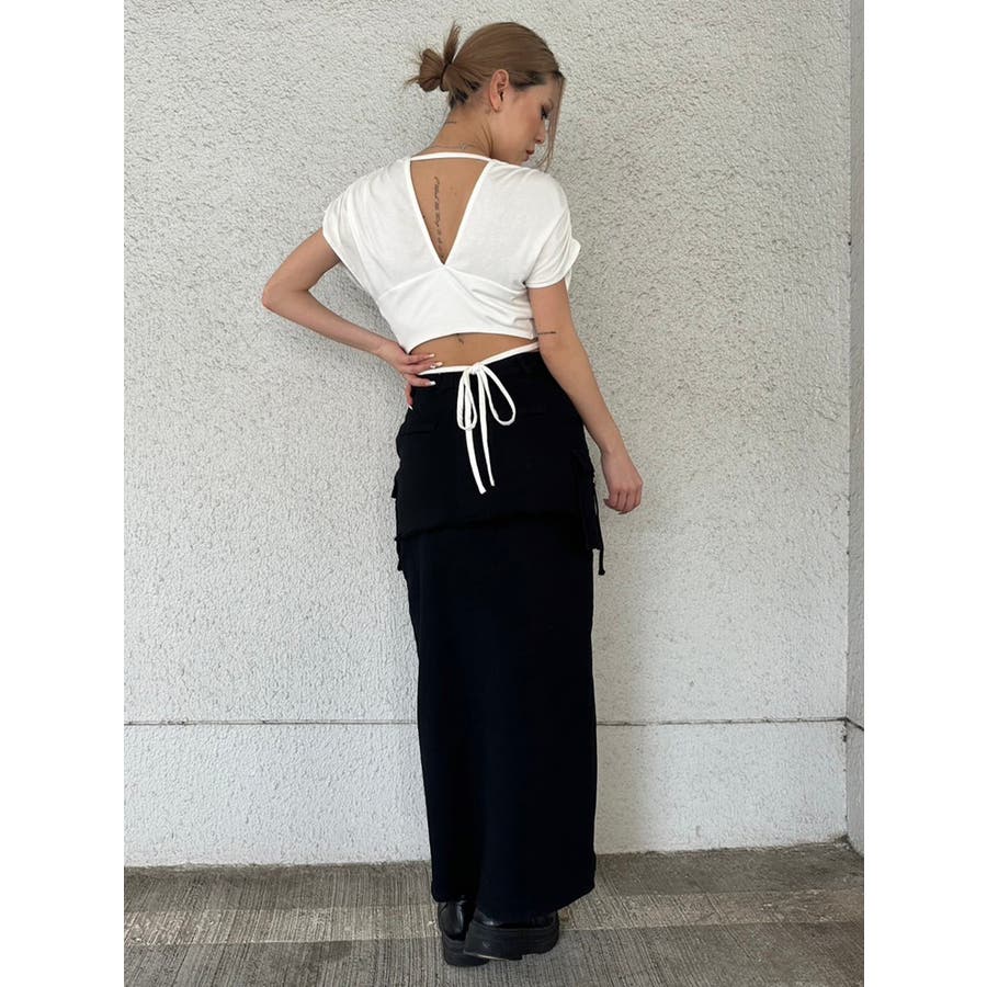 カーゴミニスカートにロングスカートをレイヤードしているようなシーズンレスで活躍するタイトロングスカート。ストレッチが効いている生地なのでタイトラインでも気にせずアクティブに過ごせます。ミニスカートと重ねたロングスカートとの着丈バランスを調整しスタイルアップを計算したシルエット。それぞれの裾始末を変えてよりレイヤード感を出し、フロントに深く入れたスリットで抜け感とヘルシーな肌見せをプラスしました。重なっている部分は厚手にならないよう生地を薄いものにと着心地にも拘っています。バックウエストのみゴム仕様。