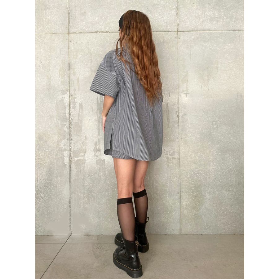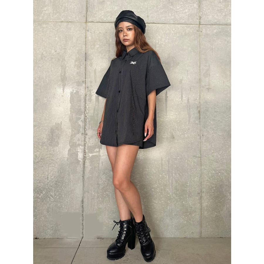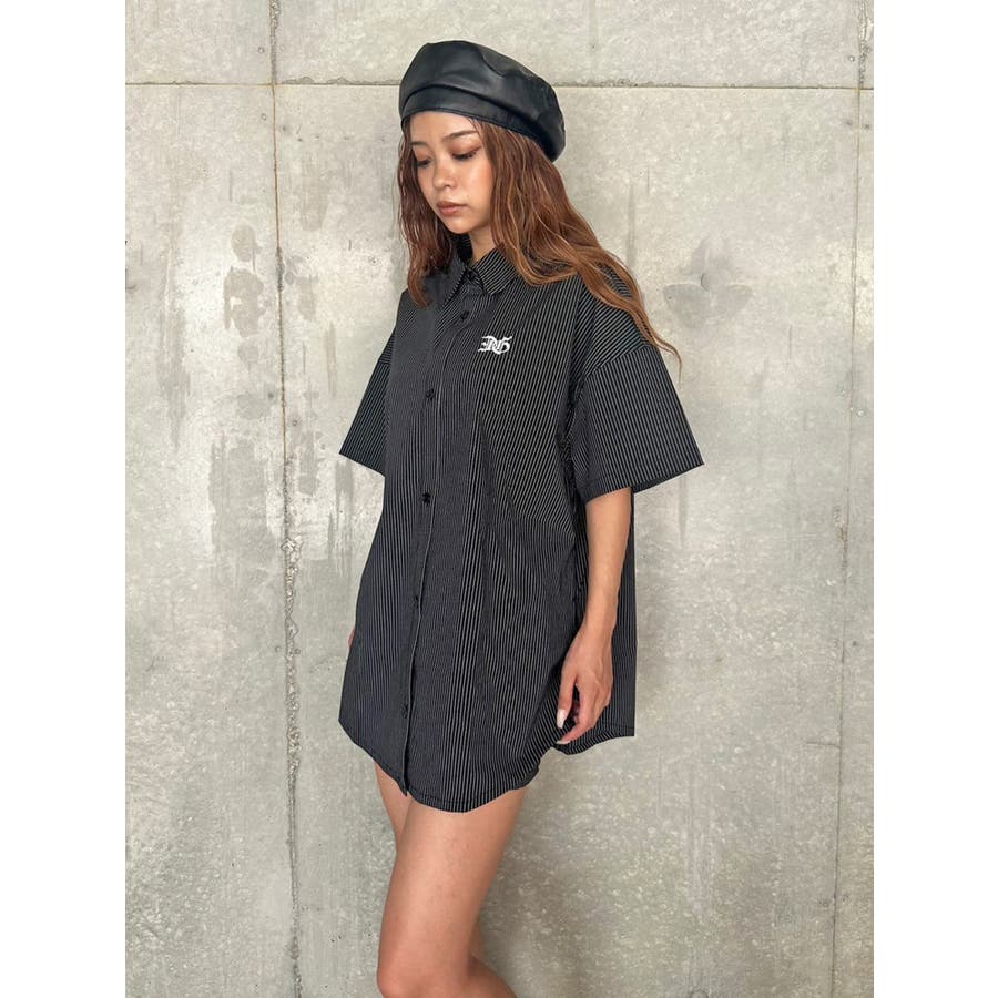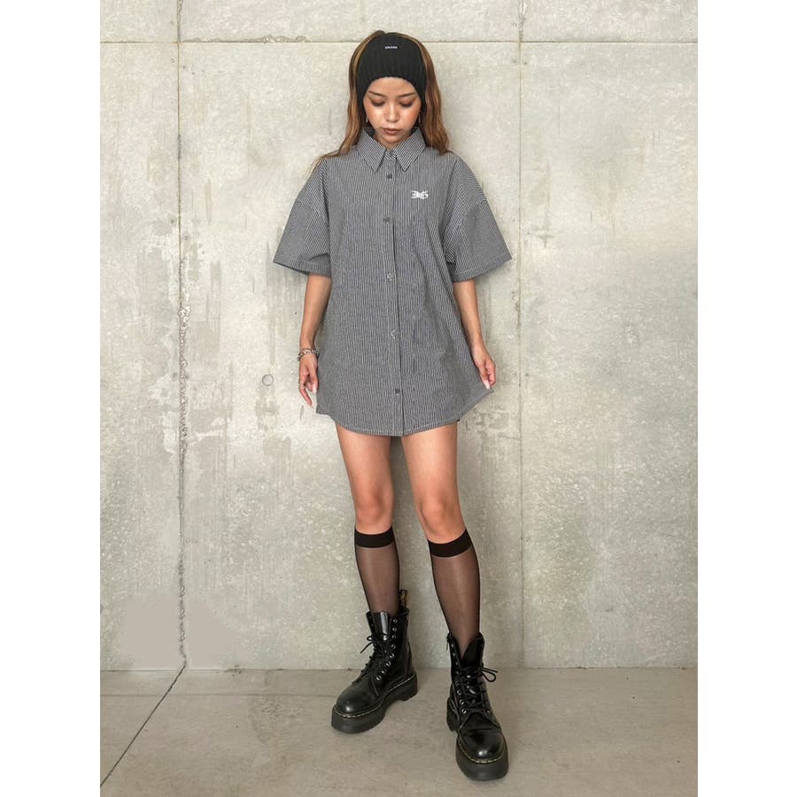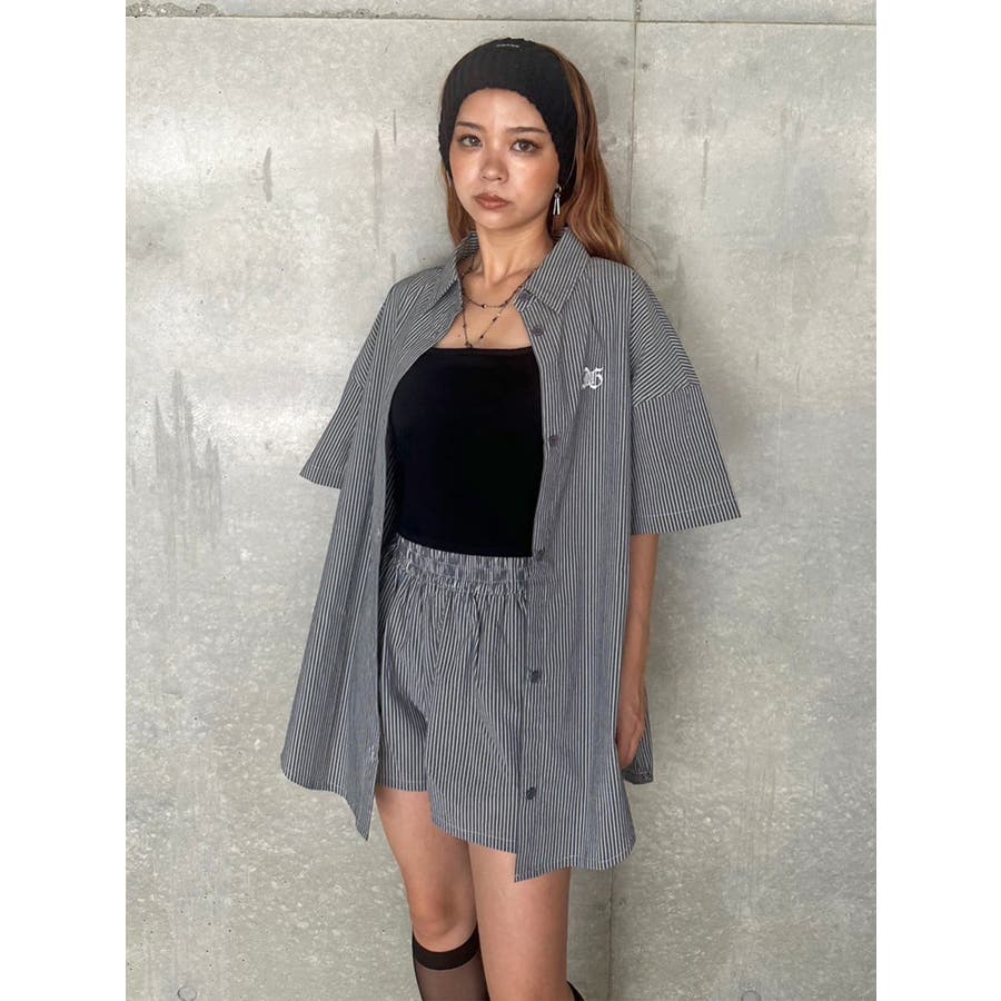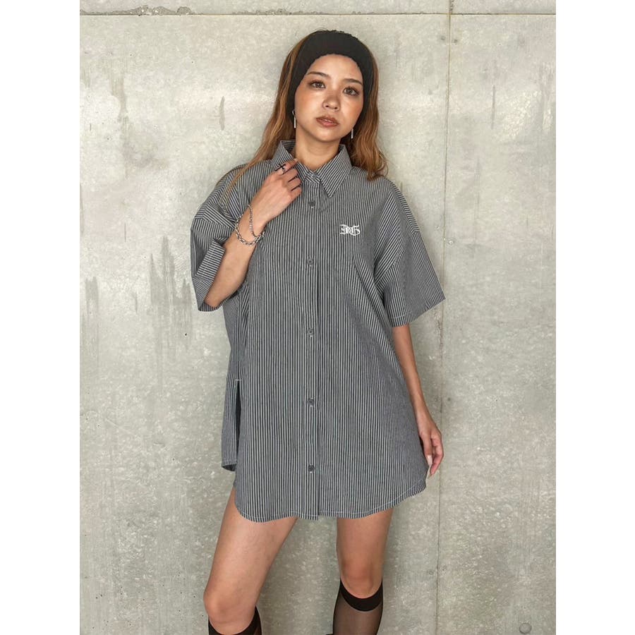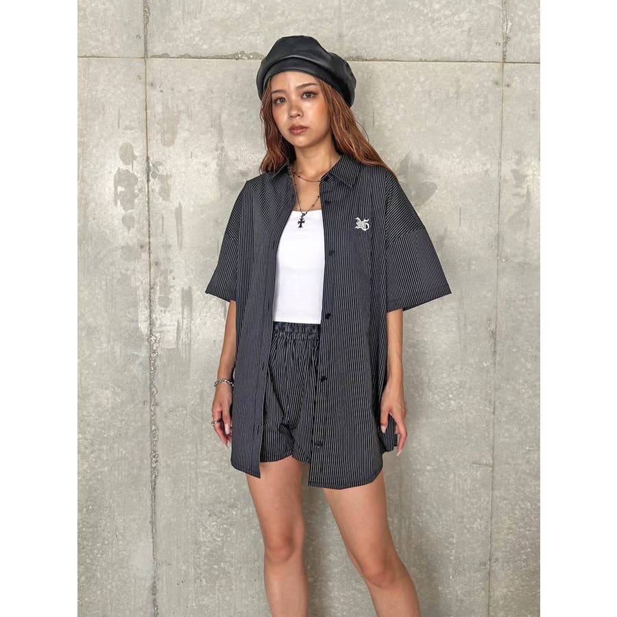 たっぷりとゆとりのあるオーバーなサイズ感が今時な半袖シャツ。ヒップを覆うくらい長めの着丈になっているのでミニボトムも合わせやすいです。左胸に配色ロゴ刺繍を入れオリジナリティのあるデザインに仕上げました。細めのピッチのストライプ柄を選んでいるので主張が強すぎず普段使いしやすいです。透けない程度に程よく薄い生地感は清涼感があり暑い時期にピッタリ。(124078909001とSETUPで着用可)