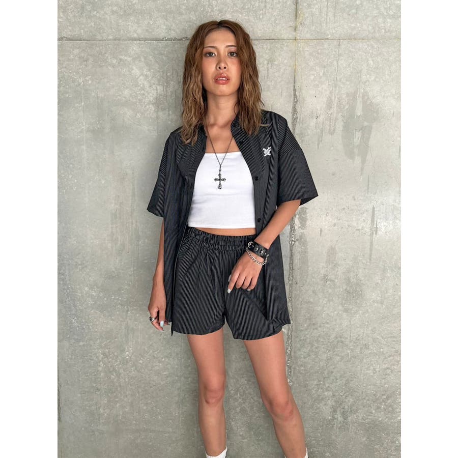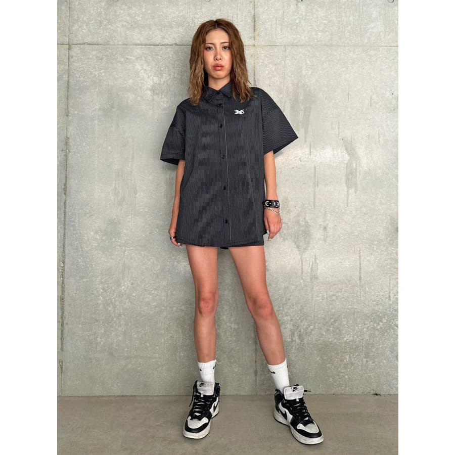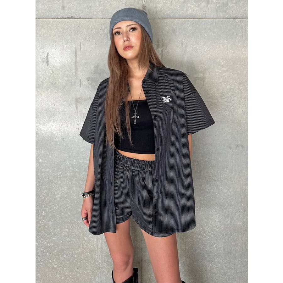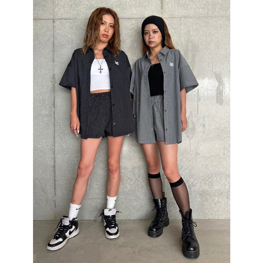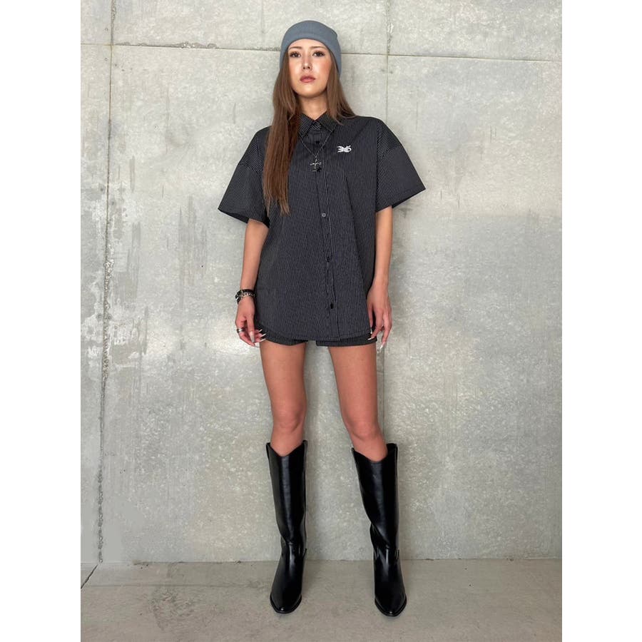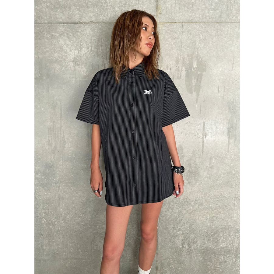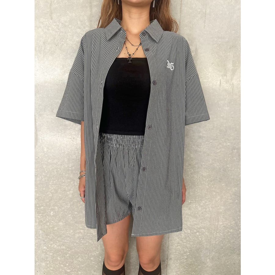 たっぷりとゆとりのあるオーバーなサイズ感が今時な半袖シャツ。ヒップを覆うくらい長めの着丈になっているのでミニボトムも合わせやすいです。左胸に配色ロゴ刺繍を入れオリジナリティのあるデザインに仕上げました。細めのピッチのストライプ柄を選んでいるので主張が強すぎず普段使いしやすいです。透けない程度に程よく薄い生地感は清涼感があり暑い時期にピッタリ。(124078909001とSETUPで着用可)