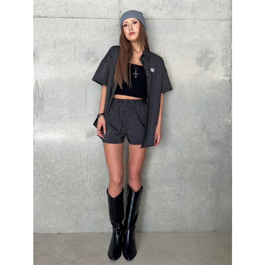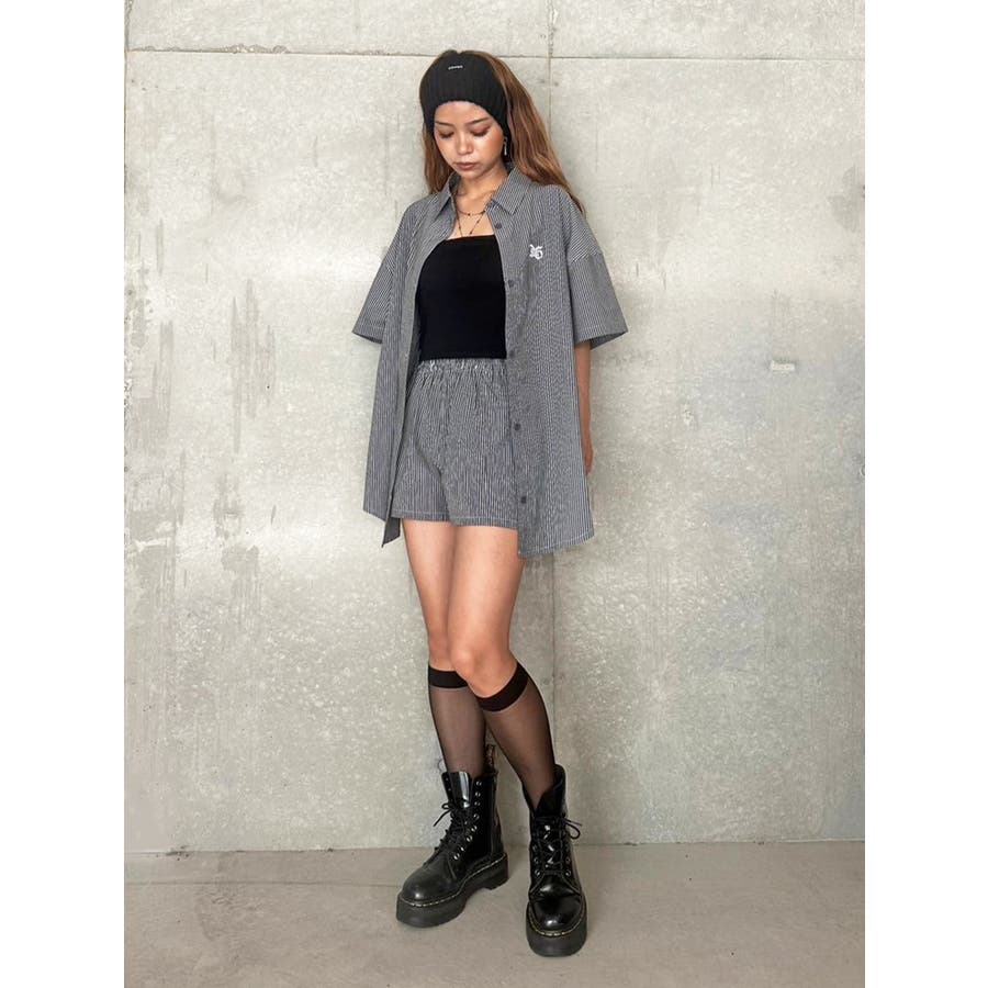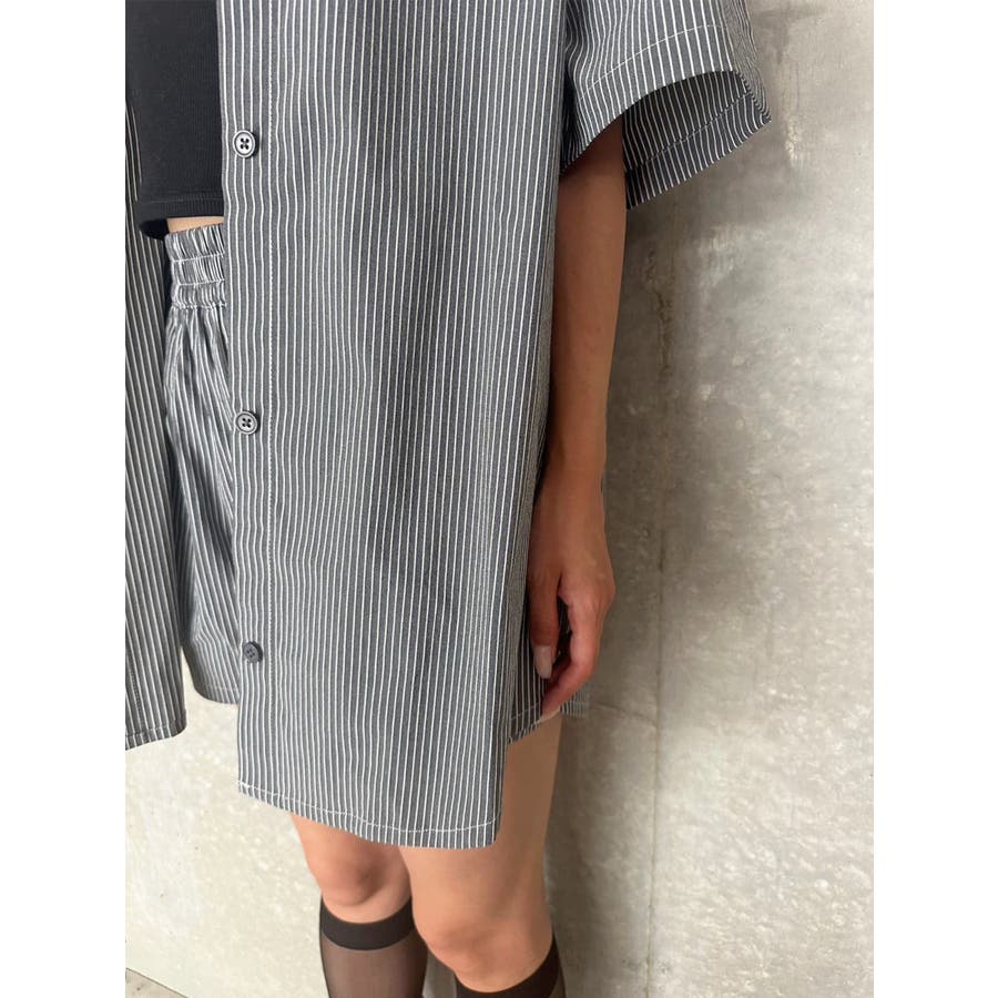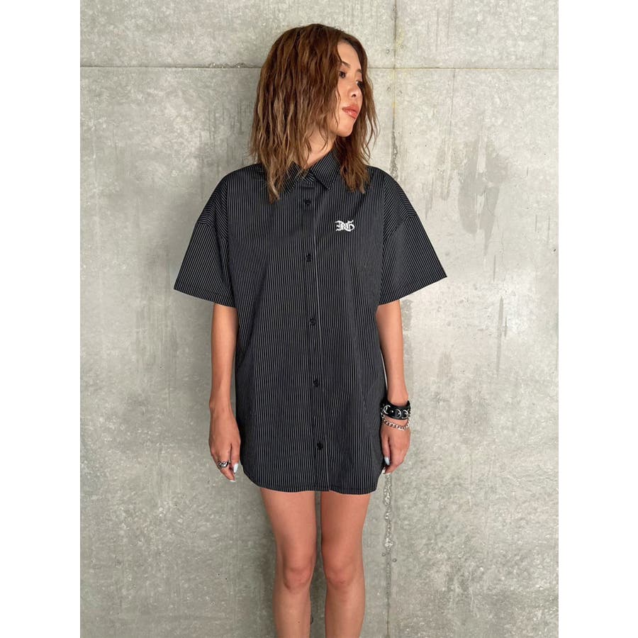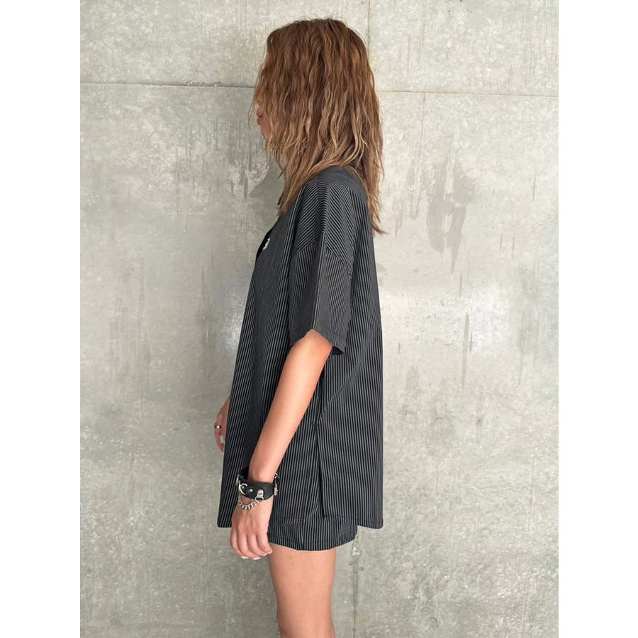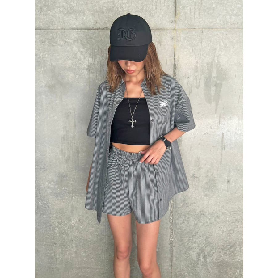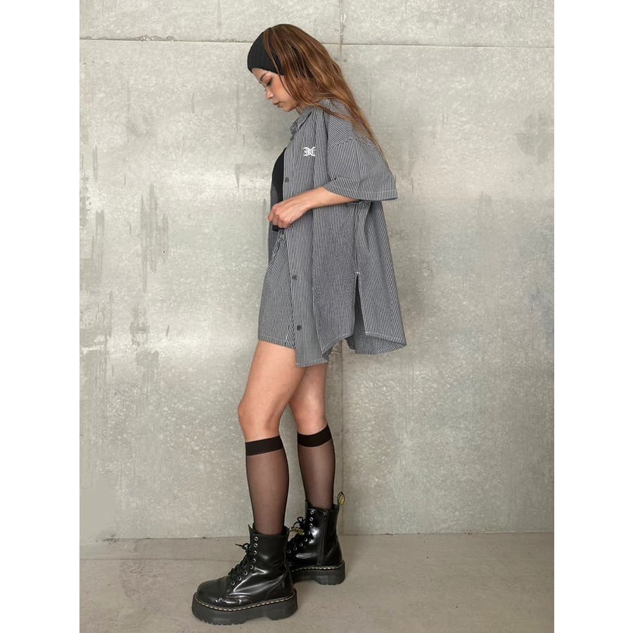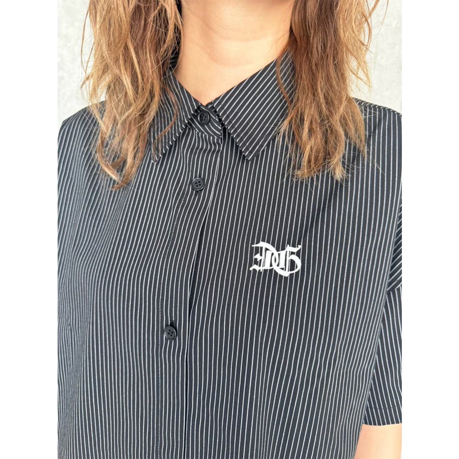 たっぷりとゆとりのあるオーバーなサイズ感が今時な半袖シャツ。ヒップを覆うくらい長めの着丈になっているのでミニボトムも合わせやすいです。左胸に配色ロゴ刺繍を入れオリジナリティのあるデザインに仕上げました。細めのピッチのストライプ柄を選んでいるので主張が強すぎず普段使いしやすいです。透けない程度に程よく薄い生地感は清涼感があり暑い時期にピッタリ。(124078909001とSETUPで着用可)