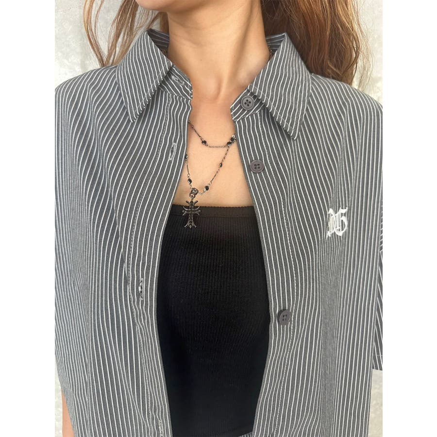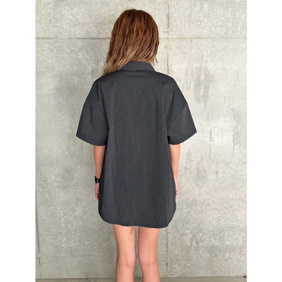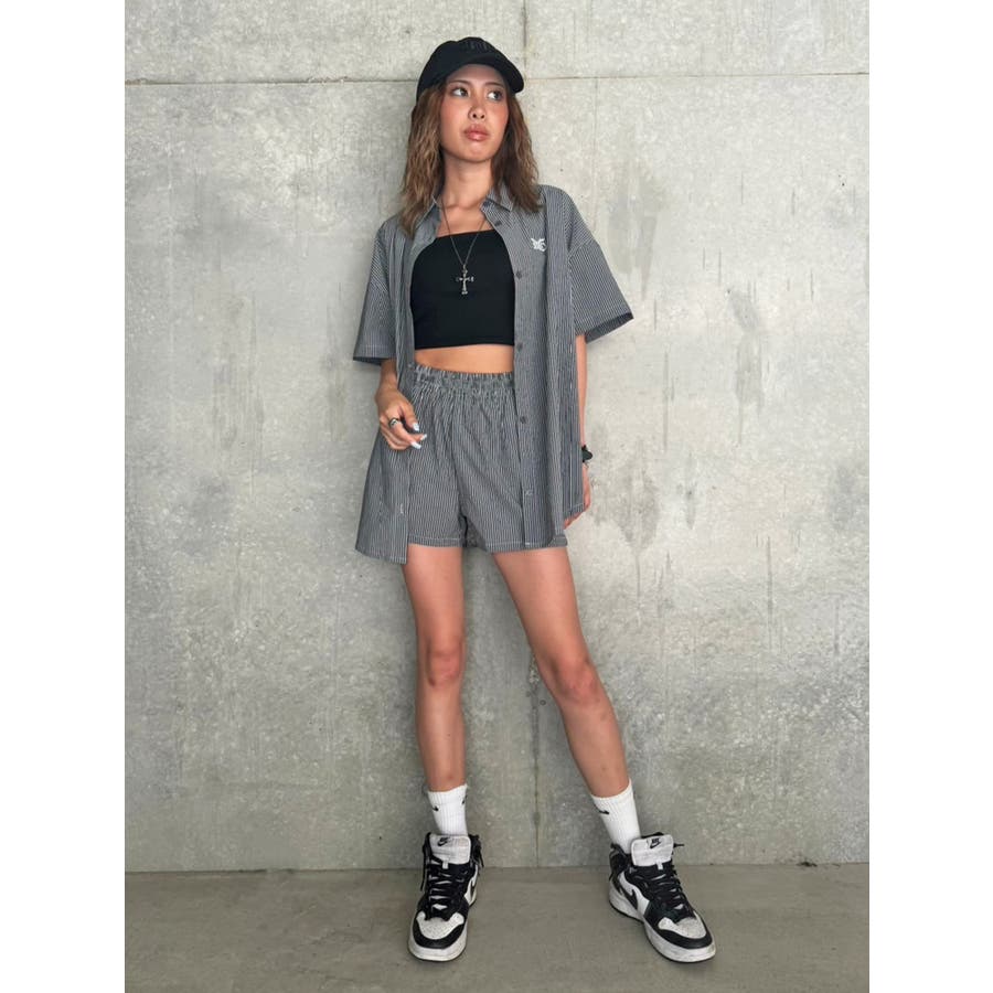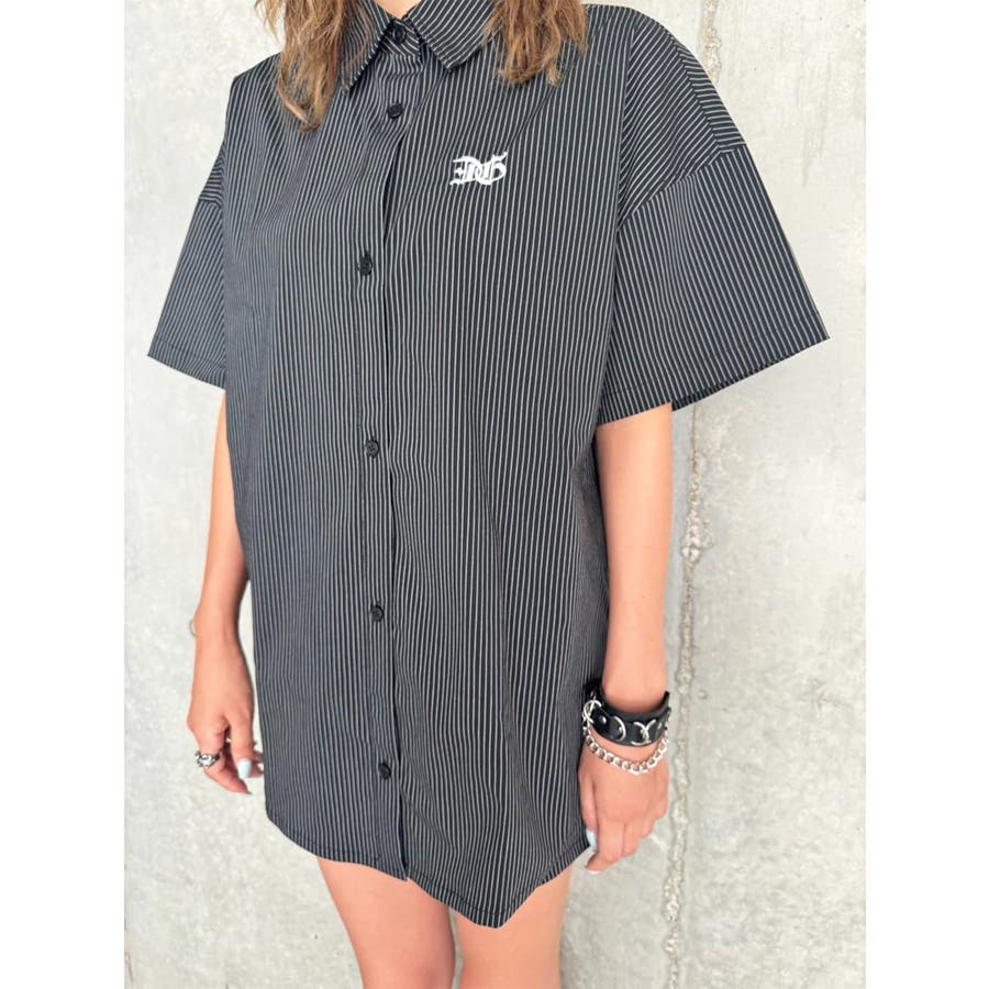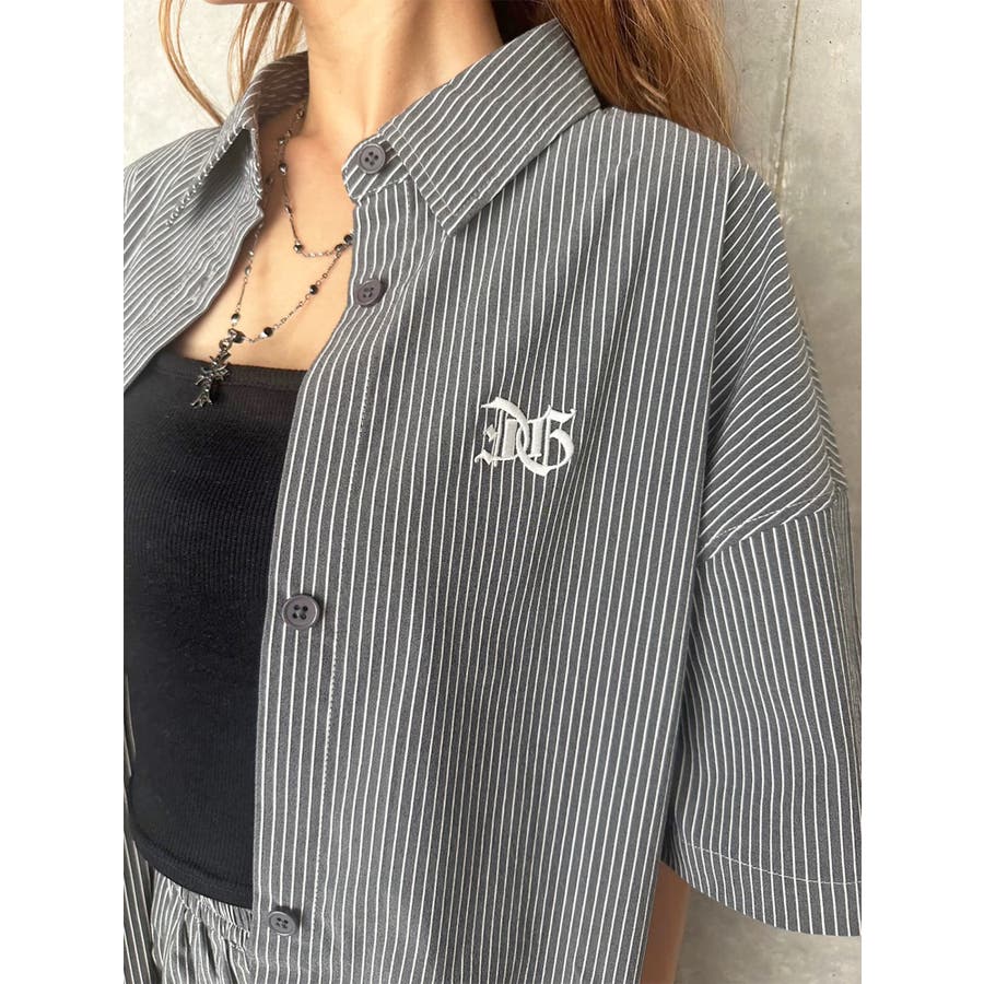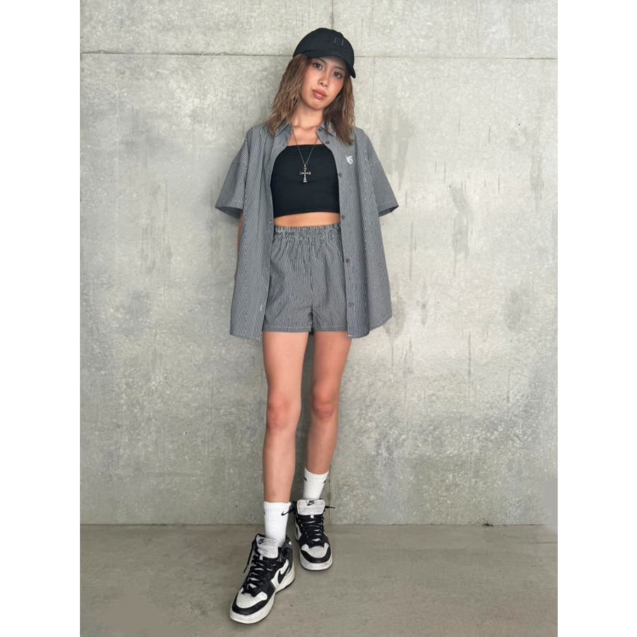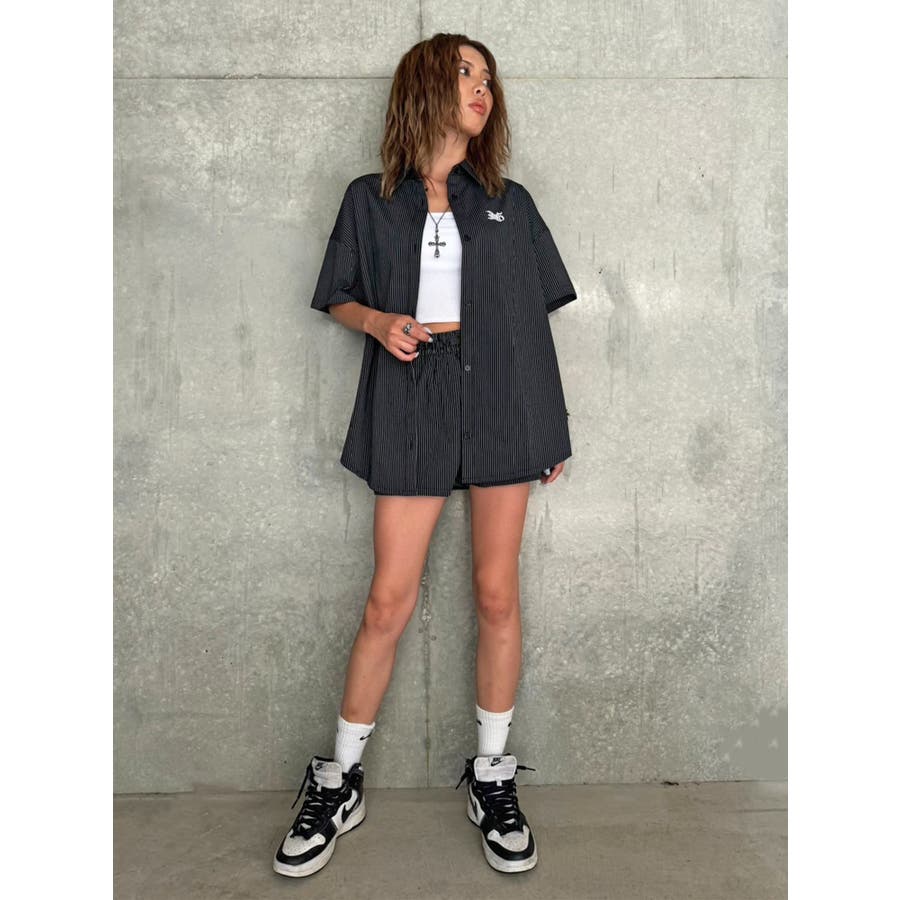 たっぷりとゆとりのあるオーバーなサイズ感が今時な半袖シャツ。ヒップを覆うくらい長めの着丈になっているのでミニボトムも合わせやすいです。左胸に配色ロゴ刺繍を入れオリジナリティのあるデザインに仕上げました。細めのピッチのストライプ柄を選んでいるので主張が強すぎず普段使いしやすいです。透けない程度に程よく薄い生地感は清涼感があり暑い時期にピッタリ。(124078909001とSETUPで着用可)