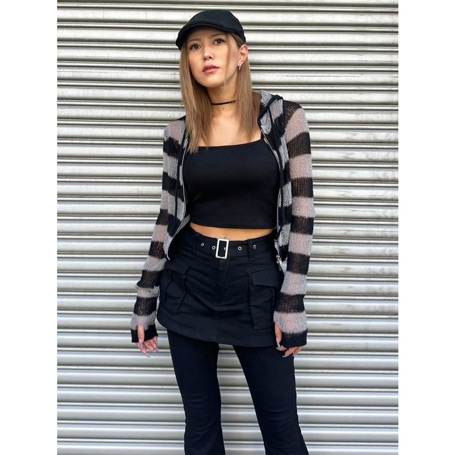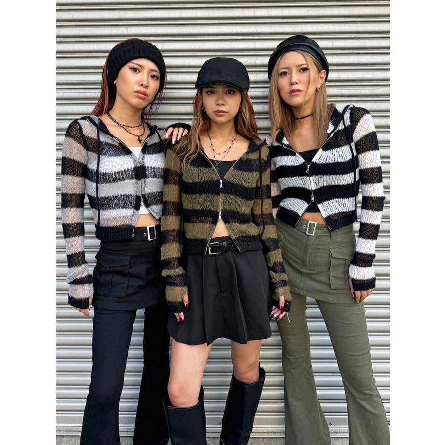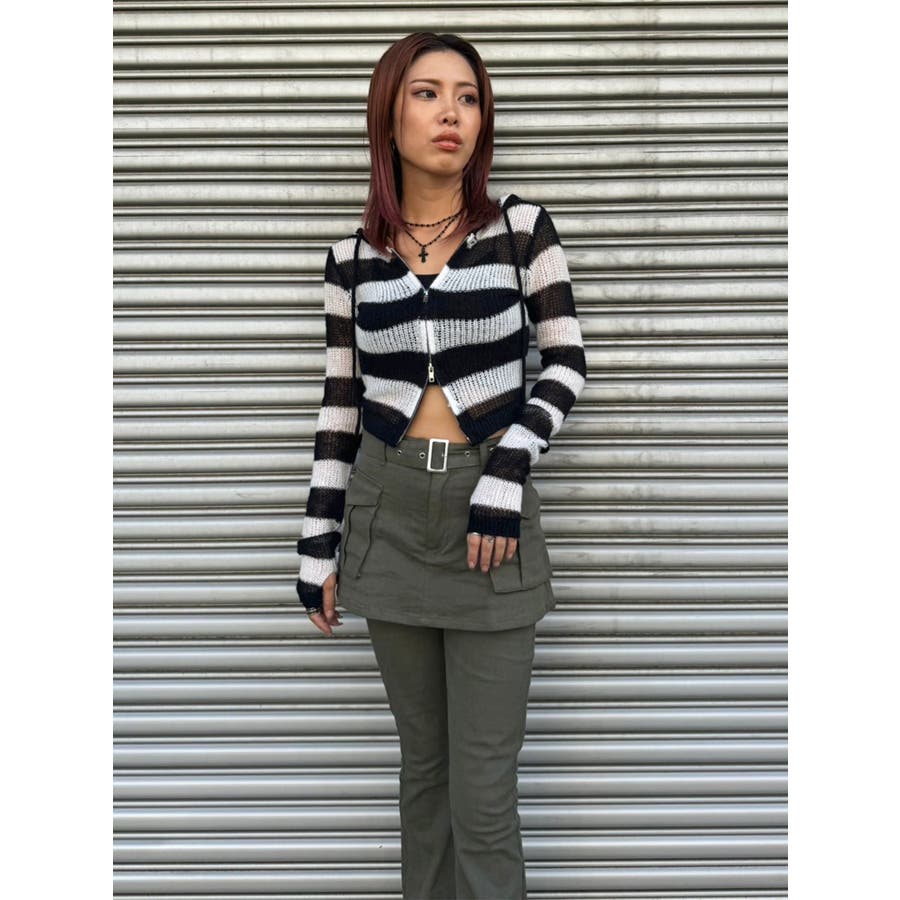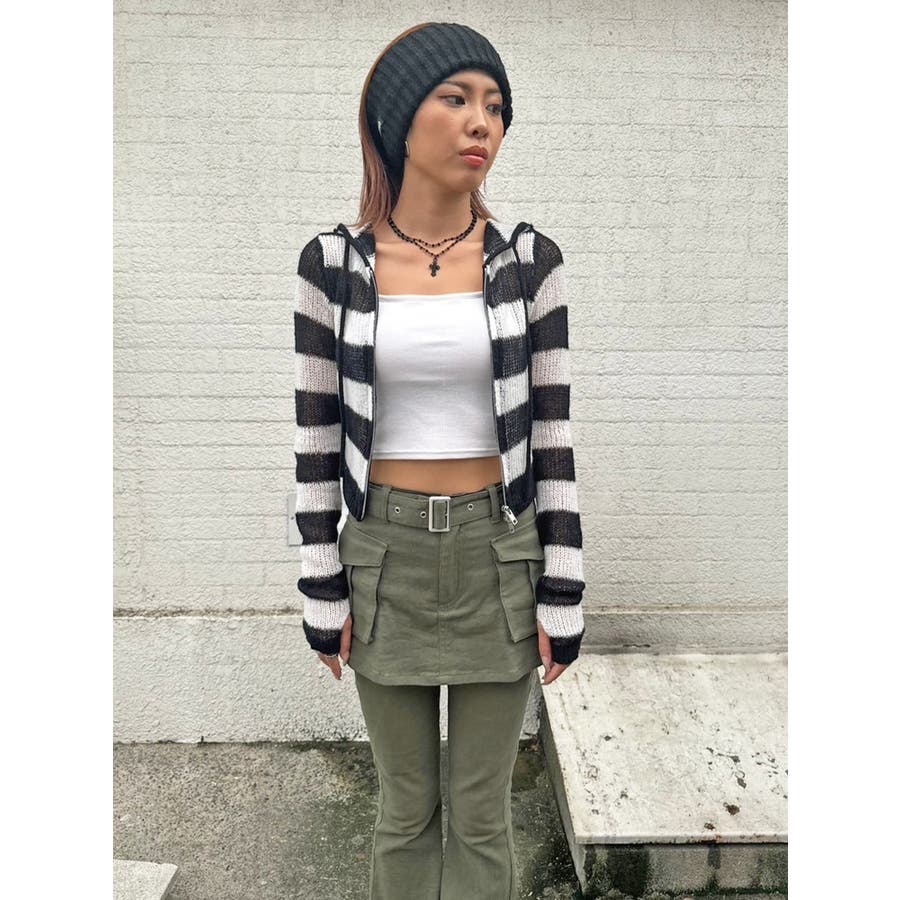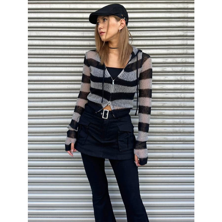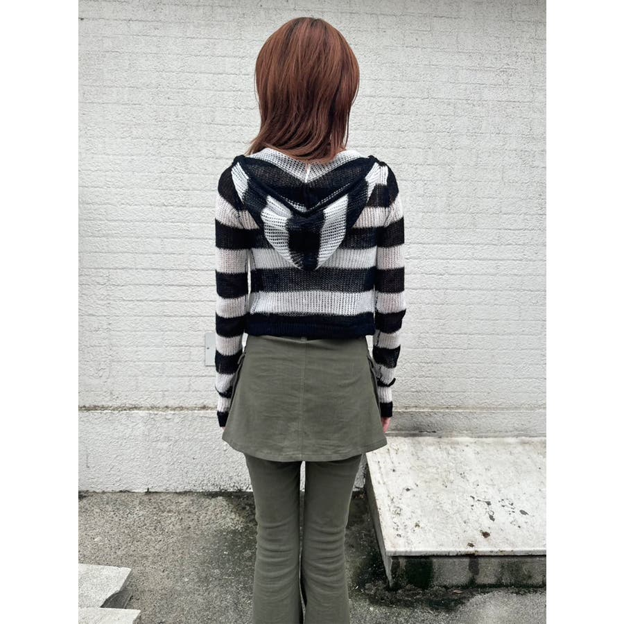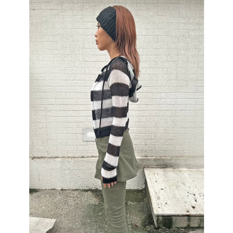 季節感のあるフワッと柔らかい糸を使用した透かし編みニットのフードパーカー。逆開ZIPなので上下ともお好みの開き具合に調整して頂けます。袖口のフィンガーホールと長めの袖丈がトレンド感のある仕上がりに。ワイドなピッチが目を惹くボーダーですが、透かし編みにすることで柄がぼやけ強めな印象を抑えてくれるので着やすくなっています。タイトなシルエットで上半身がすっきりするのでボリュームのあるボトムと合わせ、上下でメリハリを付けるのがオススメ。