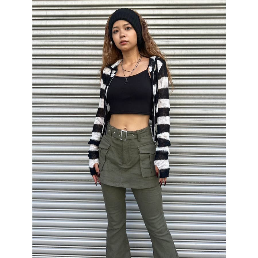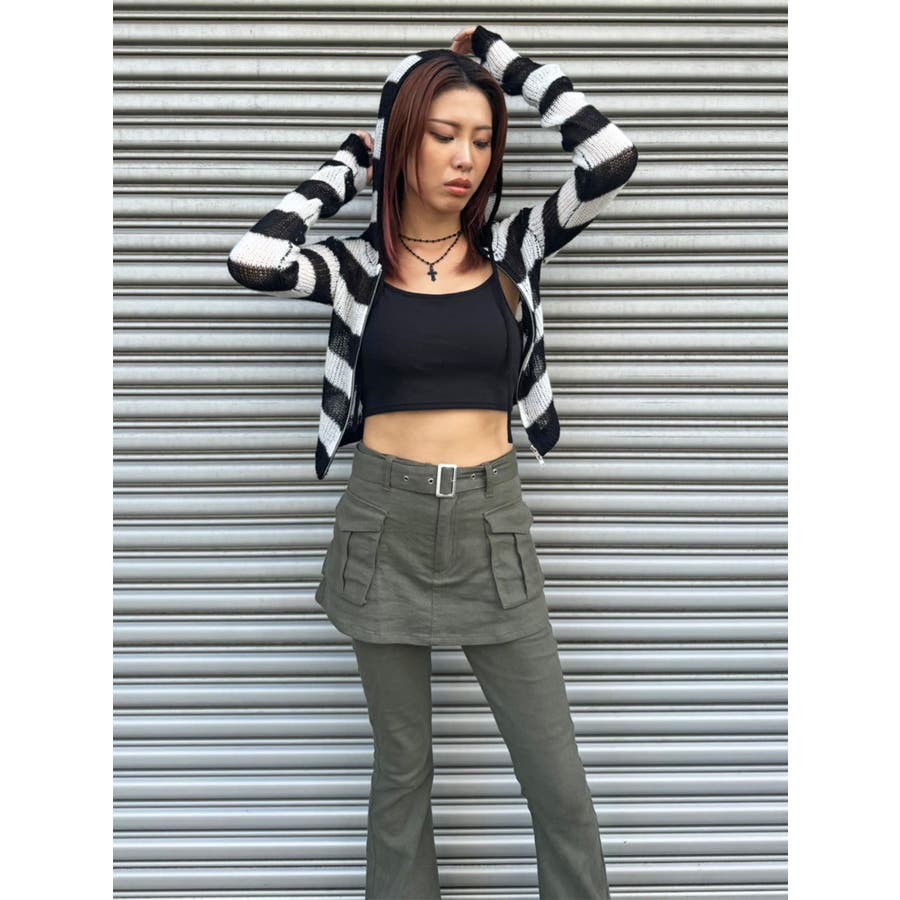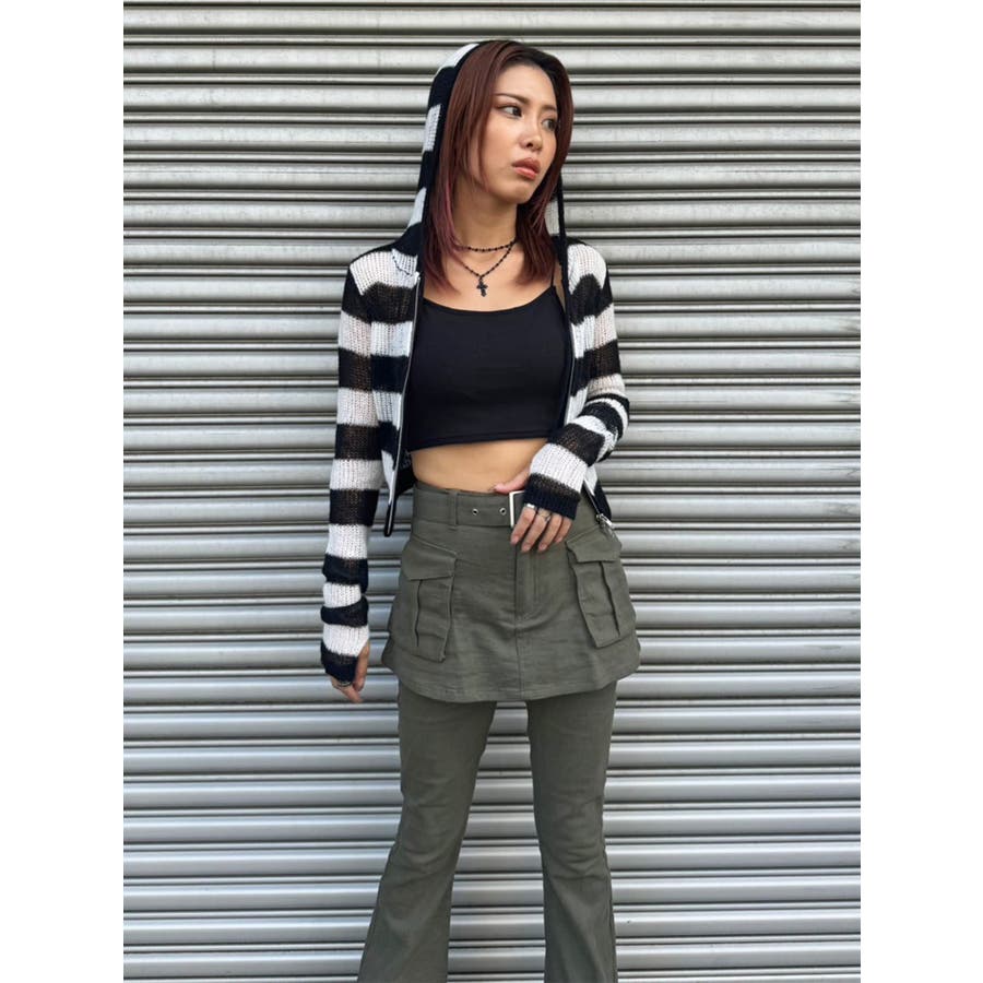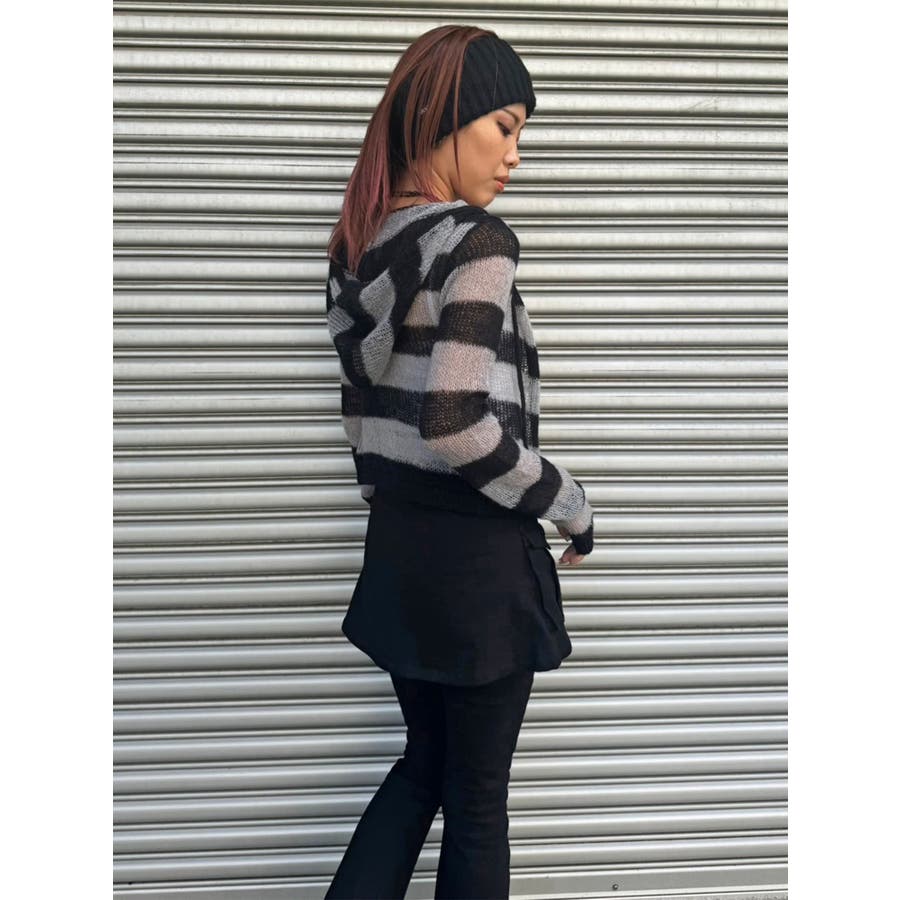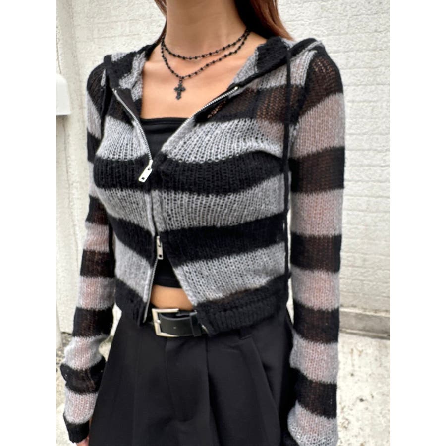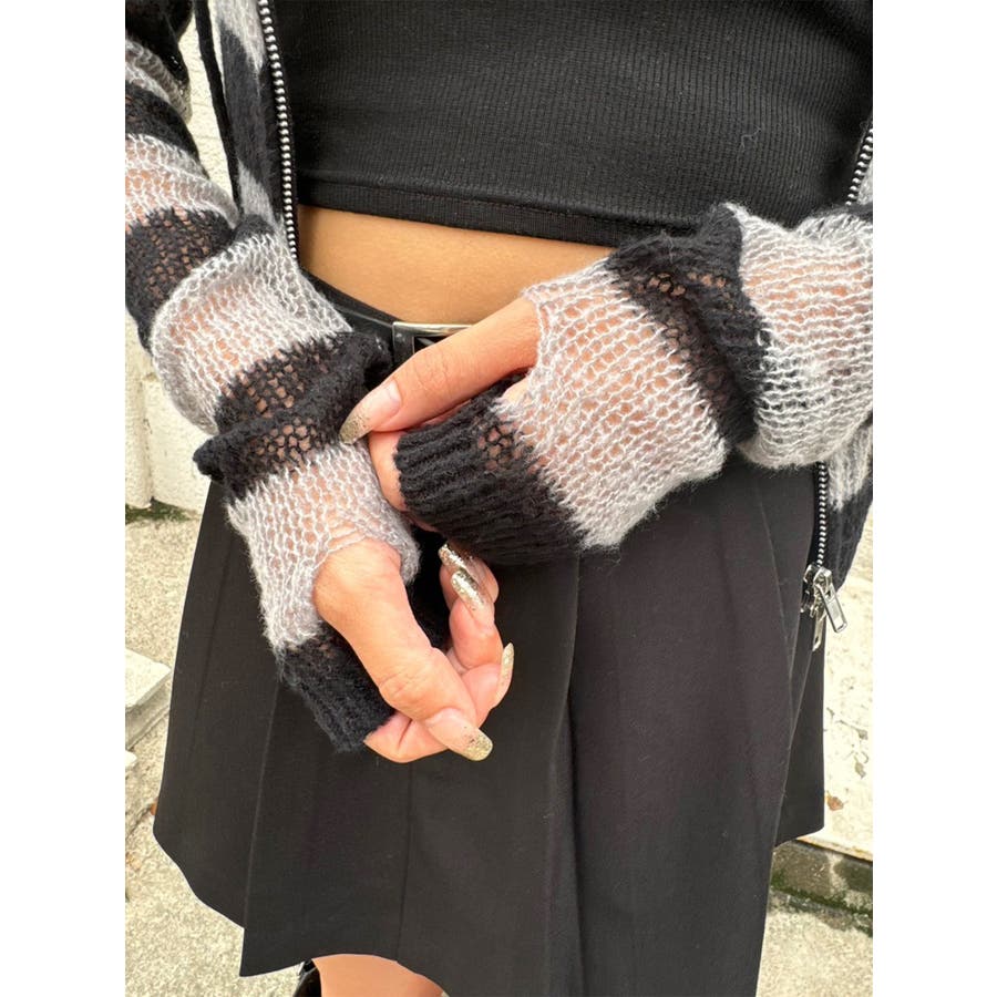 季節感のあるフワッと柔らかい糸を使用した透かし編みニットのフードパーカー。逆開ZIPなので上下ともお好みの開き具合に調整して頂けます。袖口のフィンガーホールと長めの袖丈がトレンド感のある仕上がりに。ワイドなピッチが目を惹くボーダーですが、透かし編みにすることで柄がぼやけ強めな印象を抑えてくれるので着やすくなっています。タイトなシルエットで上半身がすっきりするのでボリュームのあるボトムと合わせ、上下でメリハリを付けるのがオススメ。