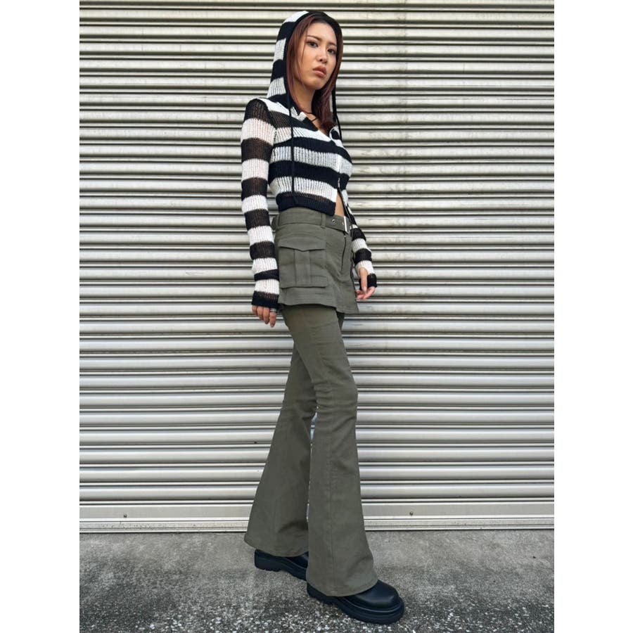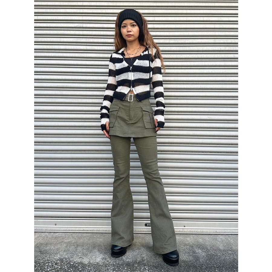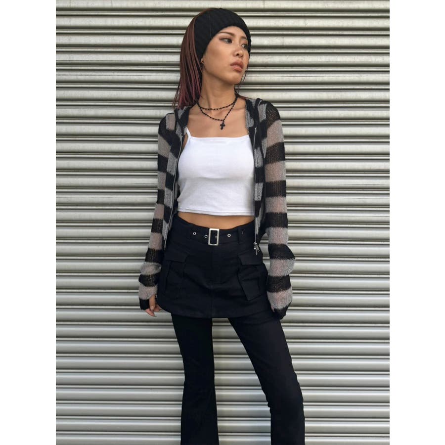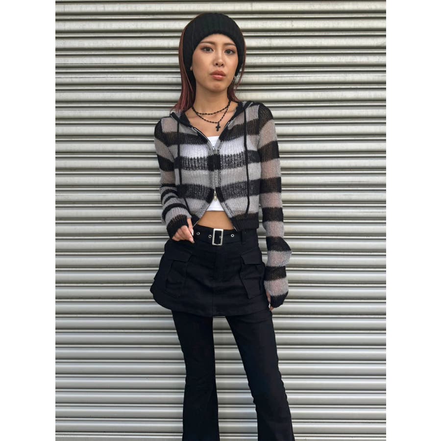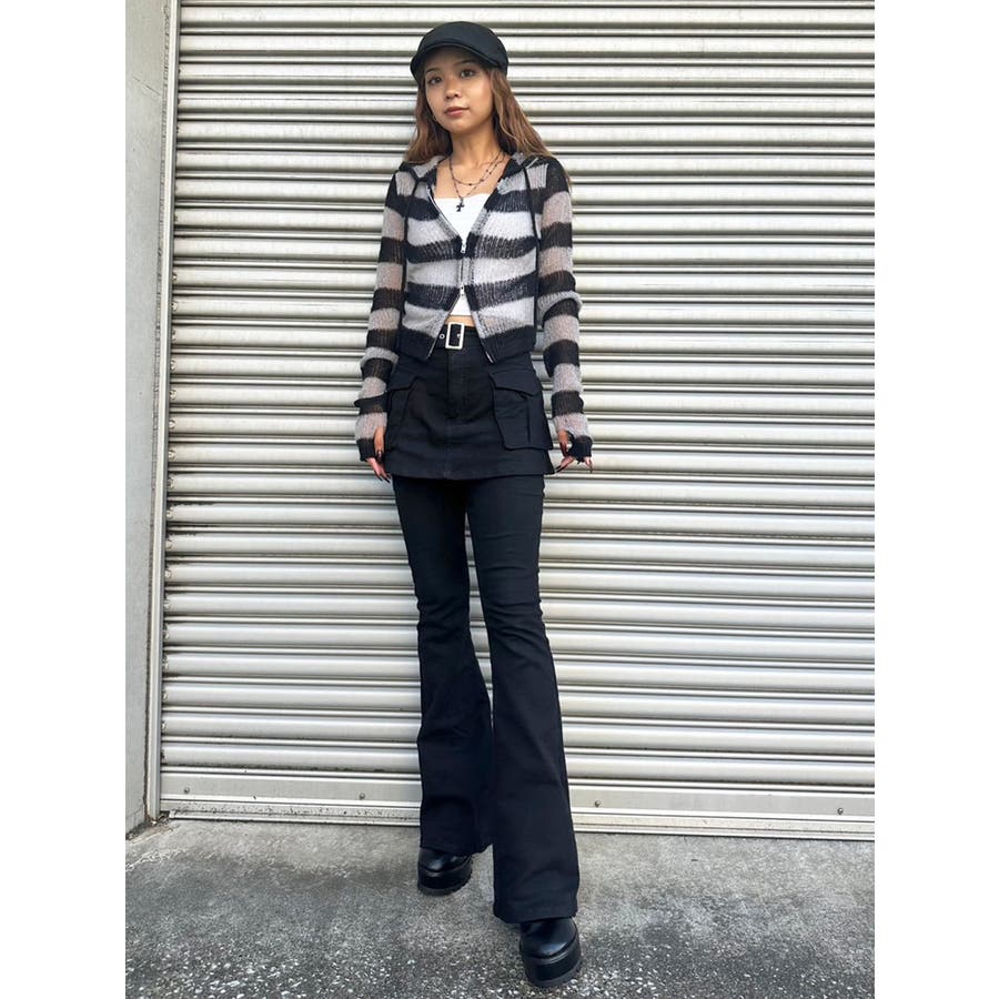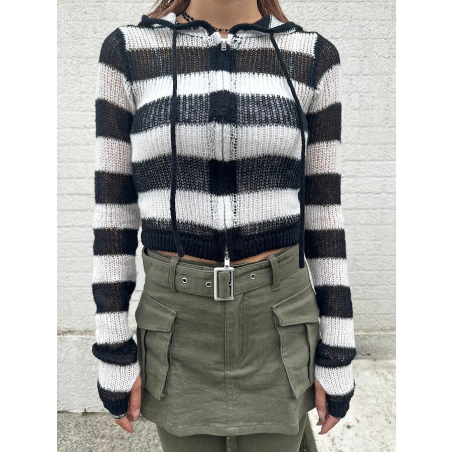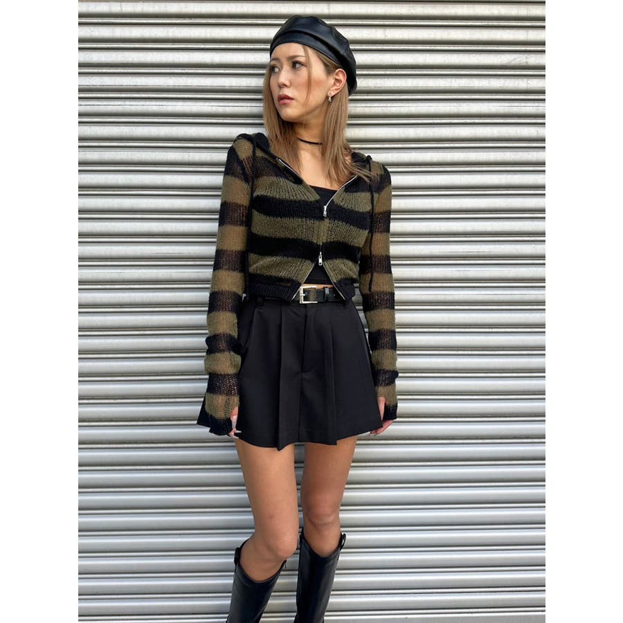 季節感のあるフワッと柔らかい糸を使用した透かし編みニットのフードパーカー。逆開ZIPなので上下ともお好みの開き具合に調整して頂けます。袖口のフィンガーホールと長めの袖丈がトレンド感のある仕上がりに。ワイドなピッチが目を惹くボーダーですが、透かし編みにすることで柄がぼやけ強めな印象を抑えてくれるので着やすくなっています。タイトなシルエットで上半身がすっきりするのでボリュームのあるボトムと合わせ、上下でメリハリを付けるのがオススメ。