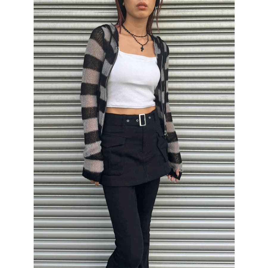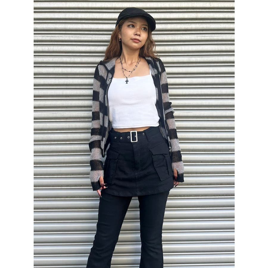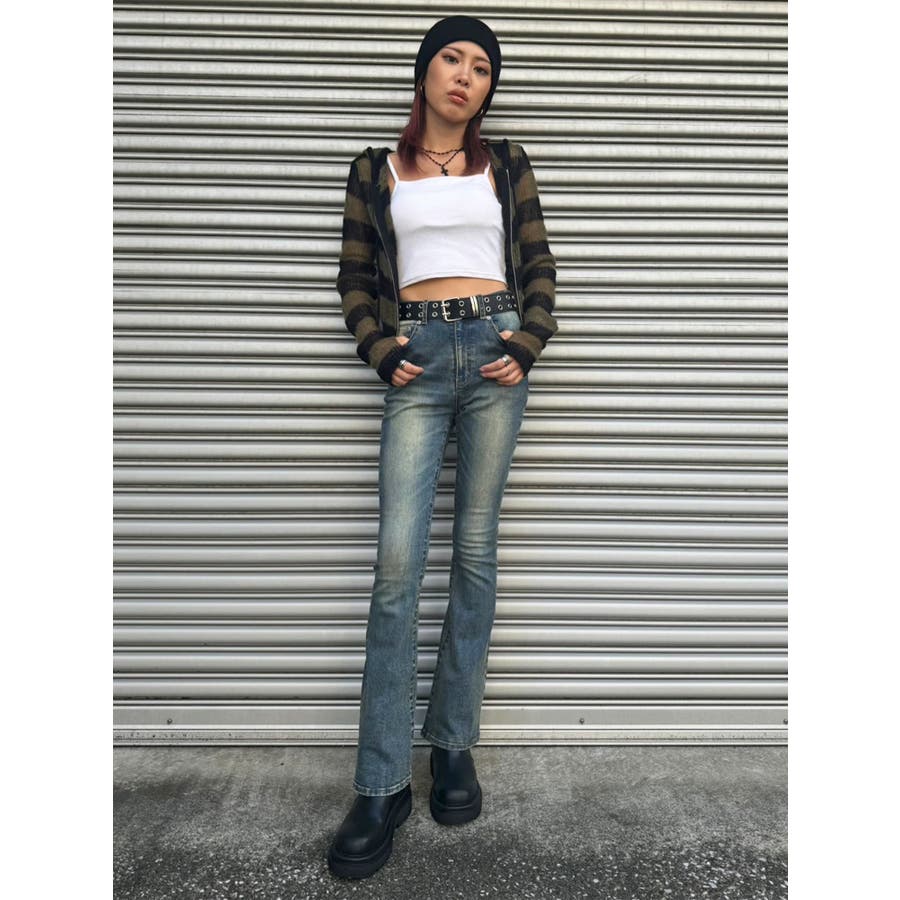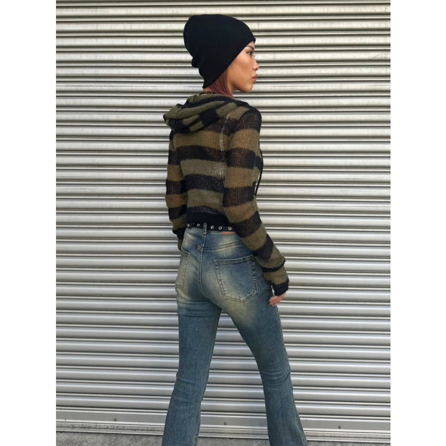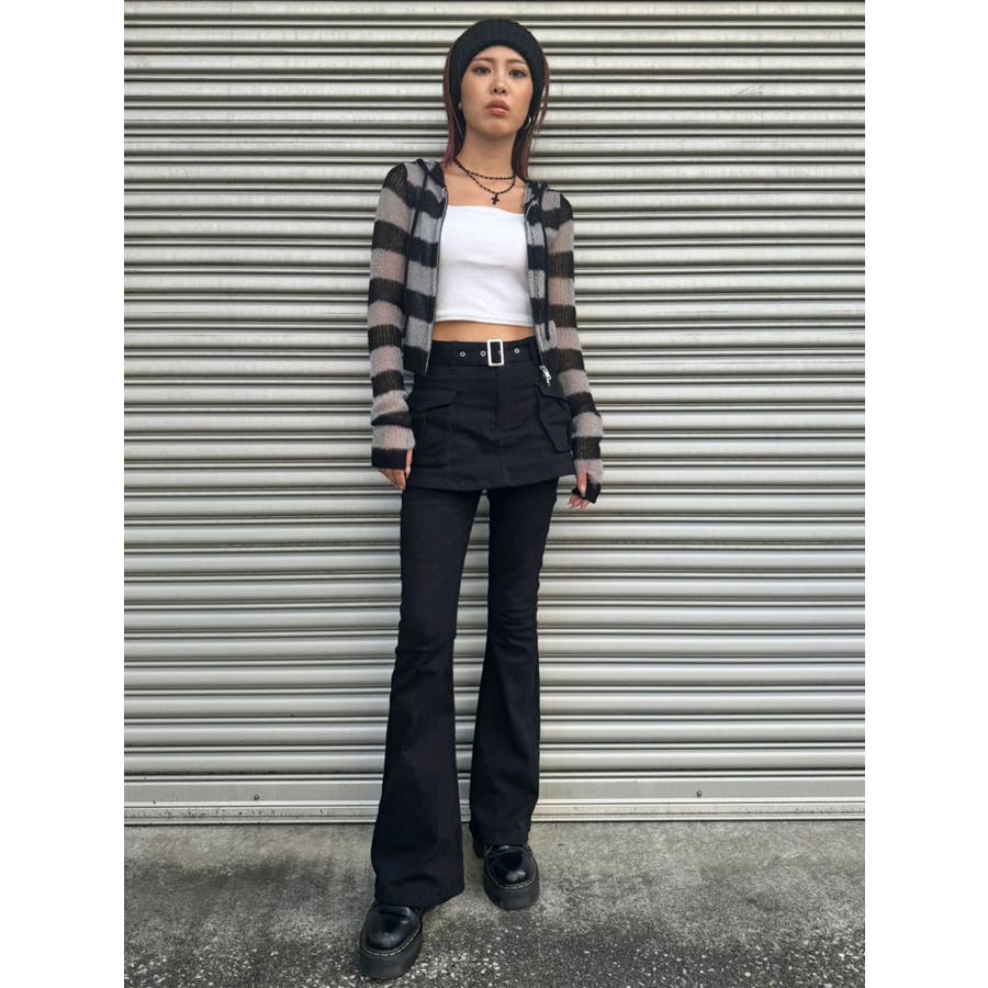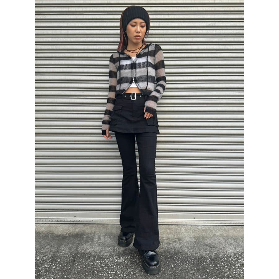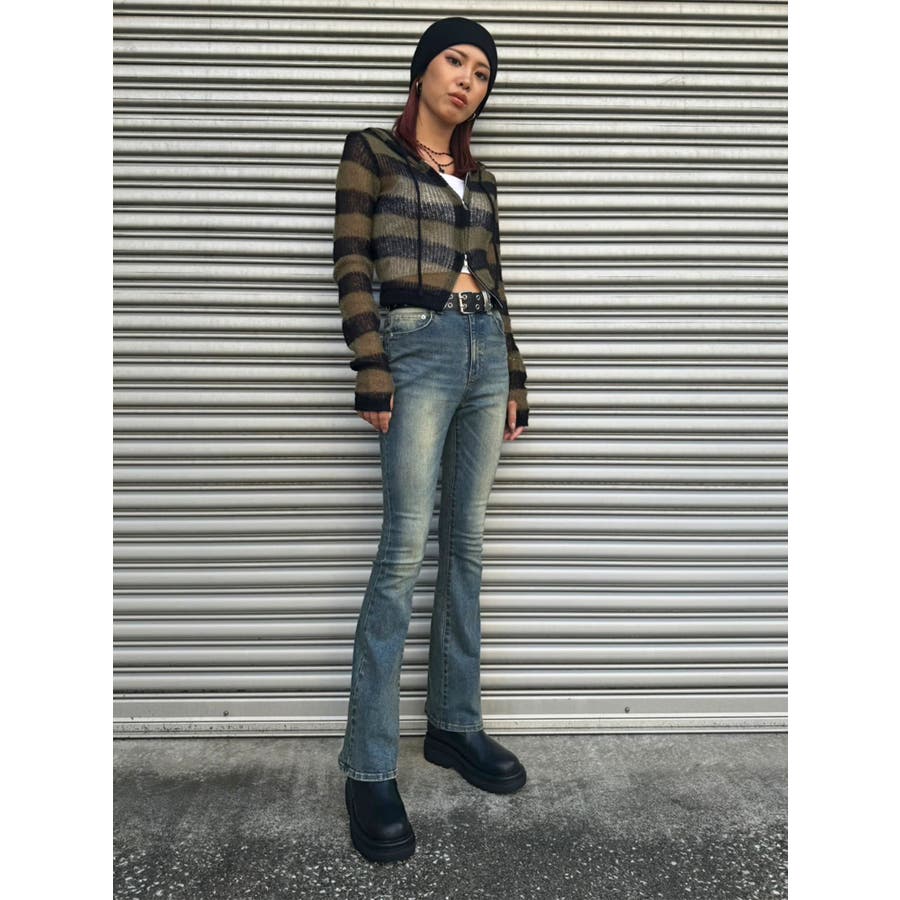 季節感のあるフワッと柔らかい糸を使用した透かし編みニットのフードパーカー。逆開ZIPなので上下ともお好みの開き具合に調整して頂けます。袖口のフィンガーホールと長めの袖丈がトレンド感のある仕上がりに。ワイドなピッチが目を惹くボーダーですが、透かし編みにすることで柄がぼやけ強めな印象を抑えてくれるので着やすくなっています。タイトなシルエットで上半身がすっきりするのでボリュームのあるボトムと合わせ、上下でメリハリを付けるのがオススメ。