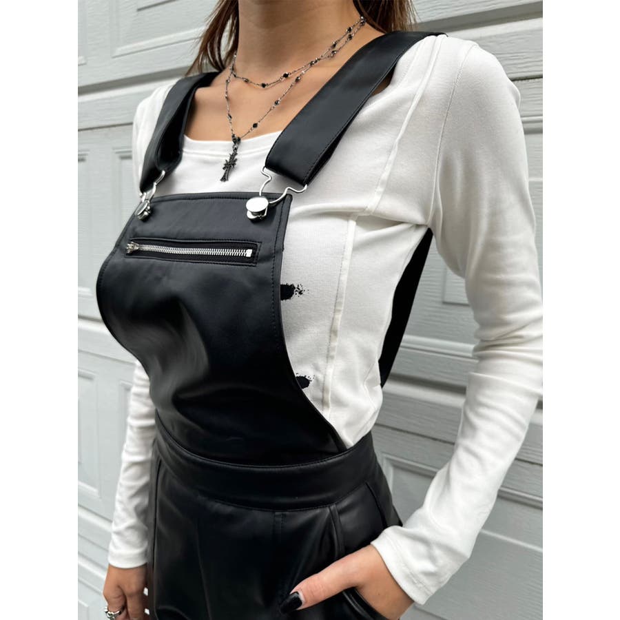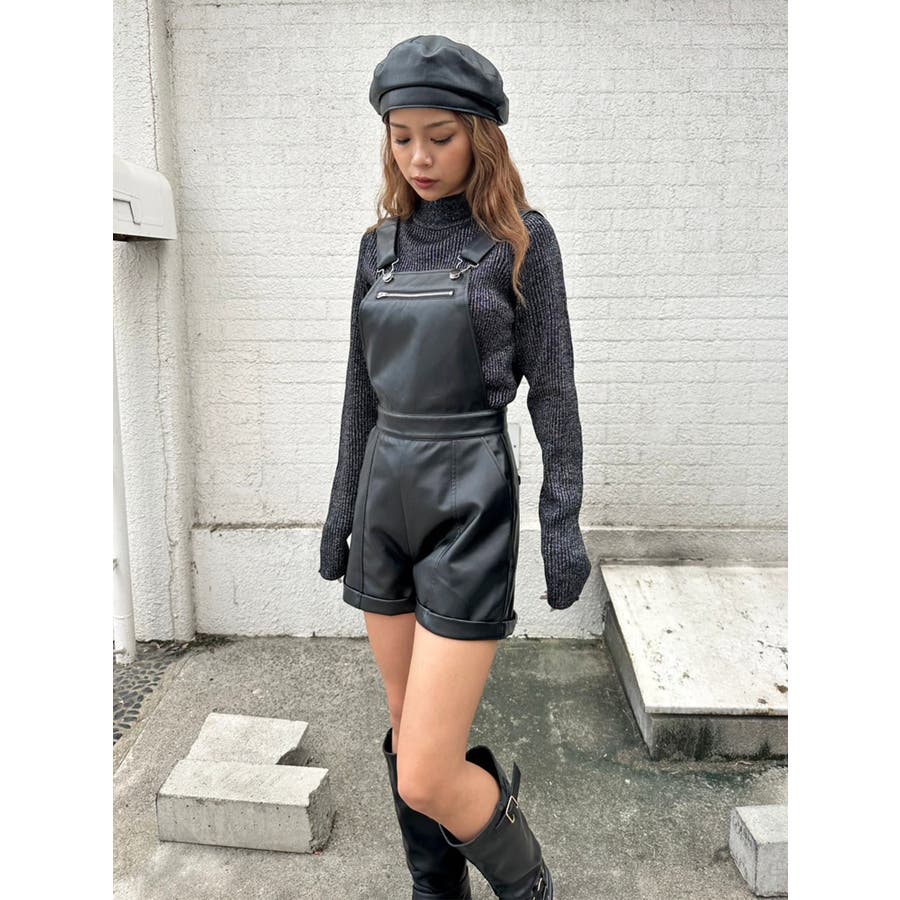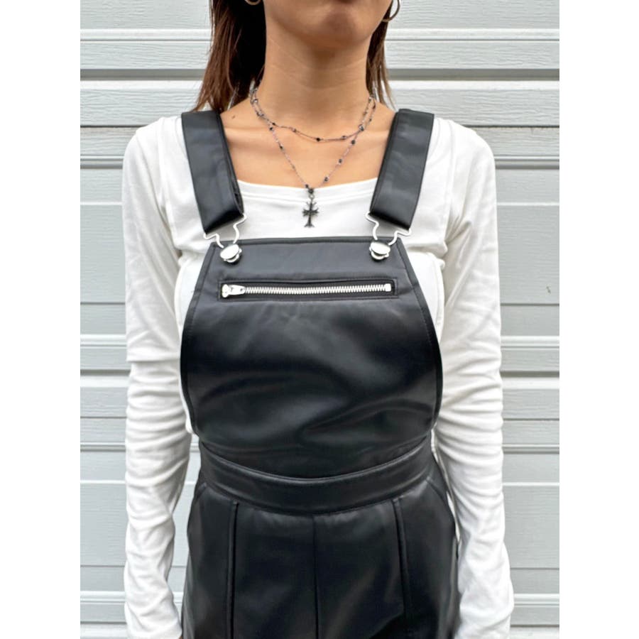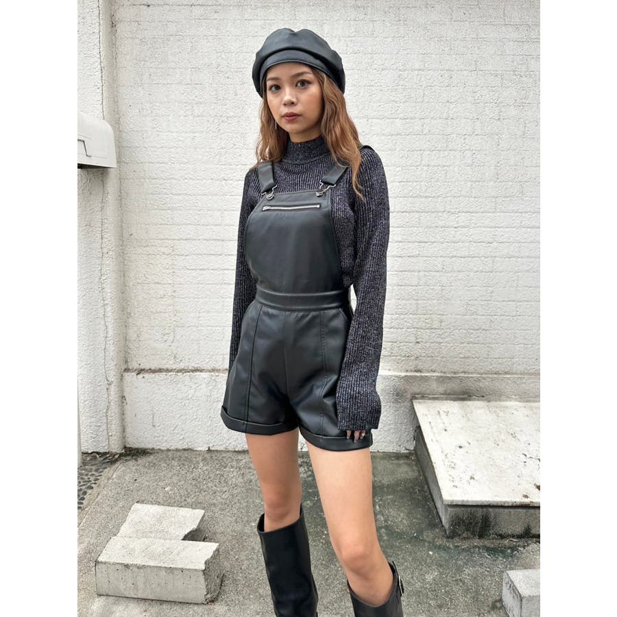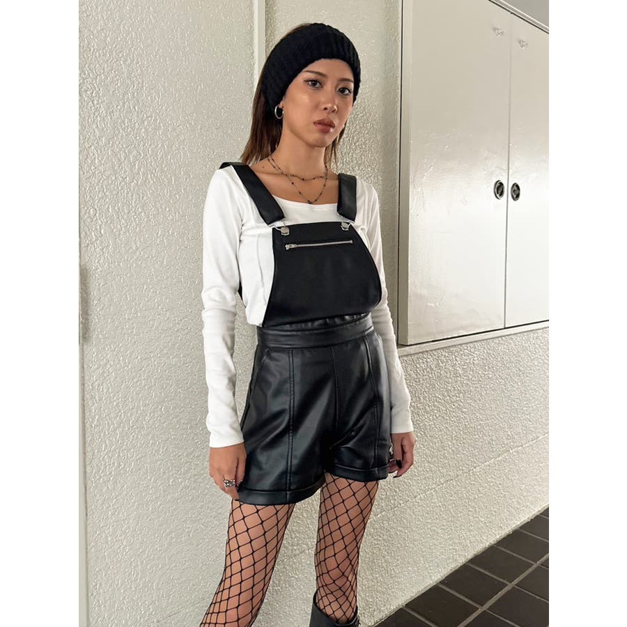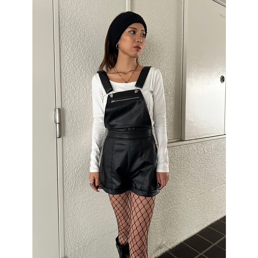 程よい光沢感の合成皮革サロペット。コンパクトなサイジングですが柔らかく伸縮性のある生地を使用しているので着心地も◎カジュアルなサロペットも合成皮革に置き換えることで子供っぽさがなくなりシックな印象に。ニットやカットソーを合わせて様々なレイヤードスタイルを楽しめるのがサロペットの魅力。胸上に施したメタリックのZIPがワンポイントになっています。肩紐は長さ調節できるのでお好みの位置で着用して頂けます。