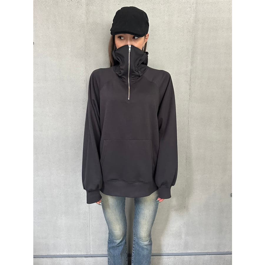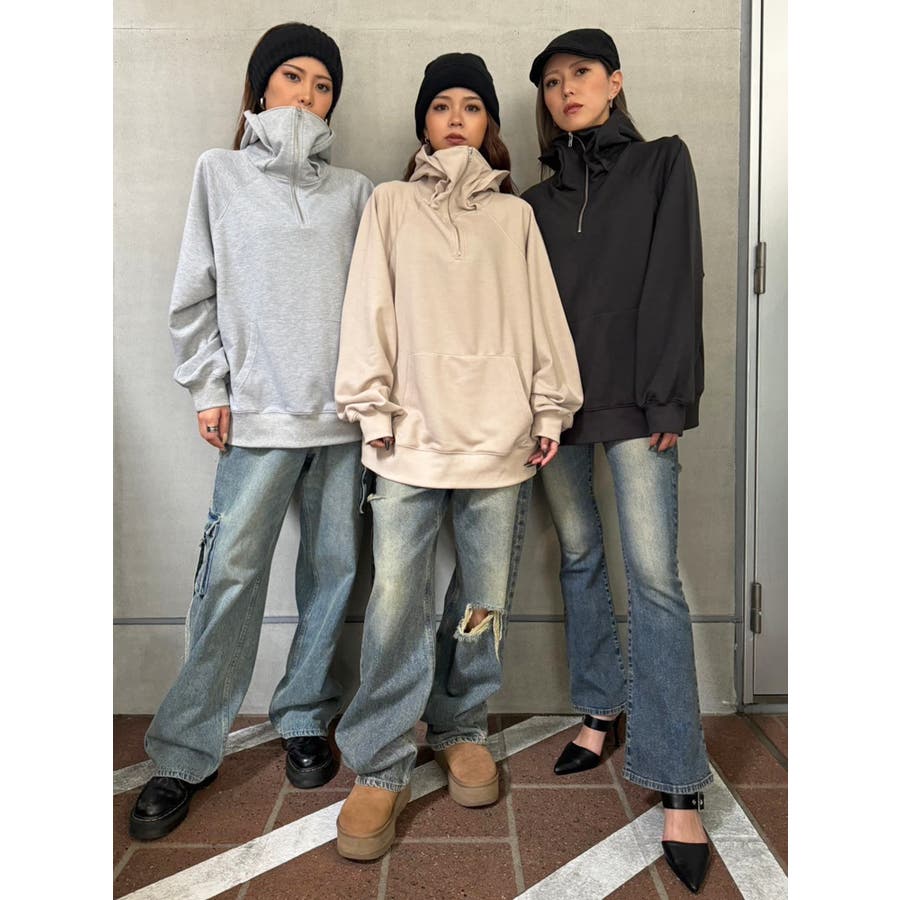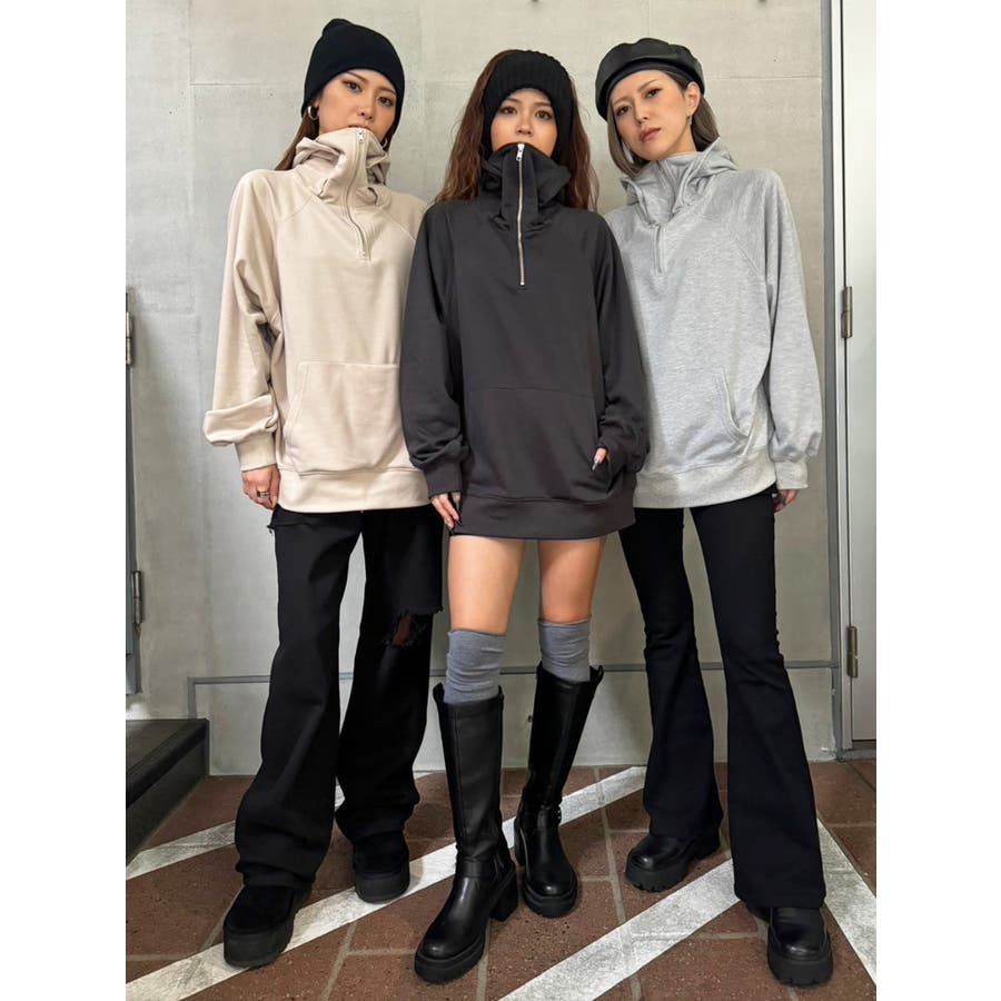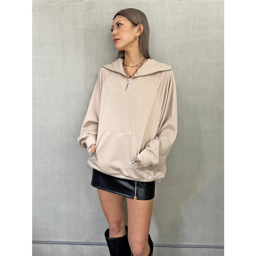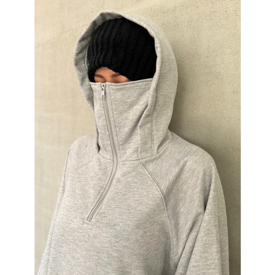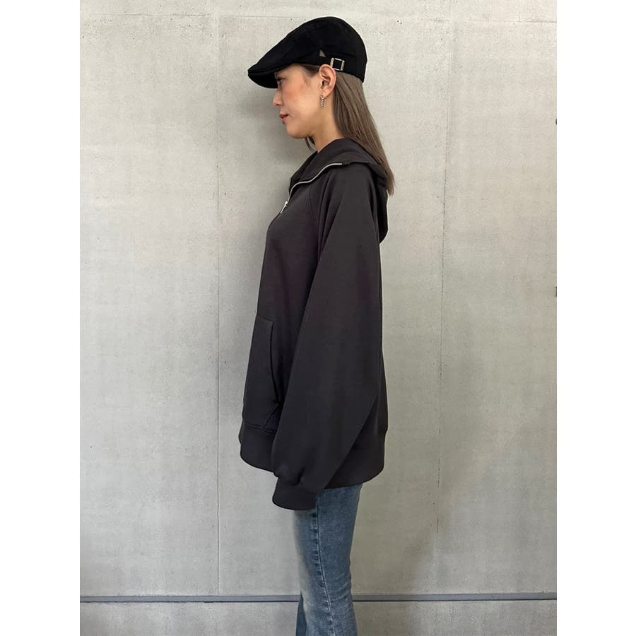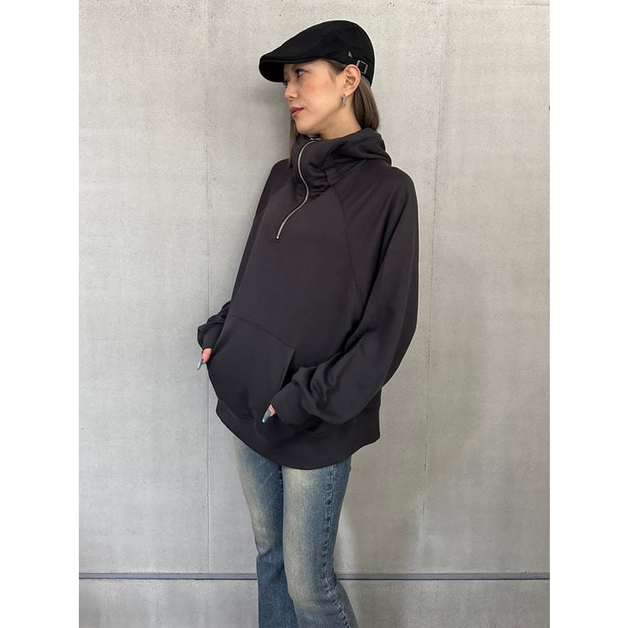 フロントZIPを全て閉じると顔を半分覆うほどの長さがあるネックデザインが目新しいフードトップス。ヒップにかかるくらい長めな着丈と程よくゆとりのあるシルエットで今時な印象に。のっぺりとしないよう大きめのポケットで身頃に立体感を出しました。風の侵入を防ぐためにきゅっと絞られたリブの袖口と首元もしっかり温めてくれるハイネックデザインで防寒対策もばっちり。