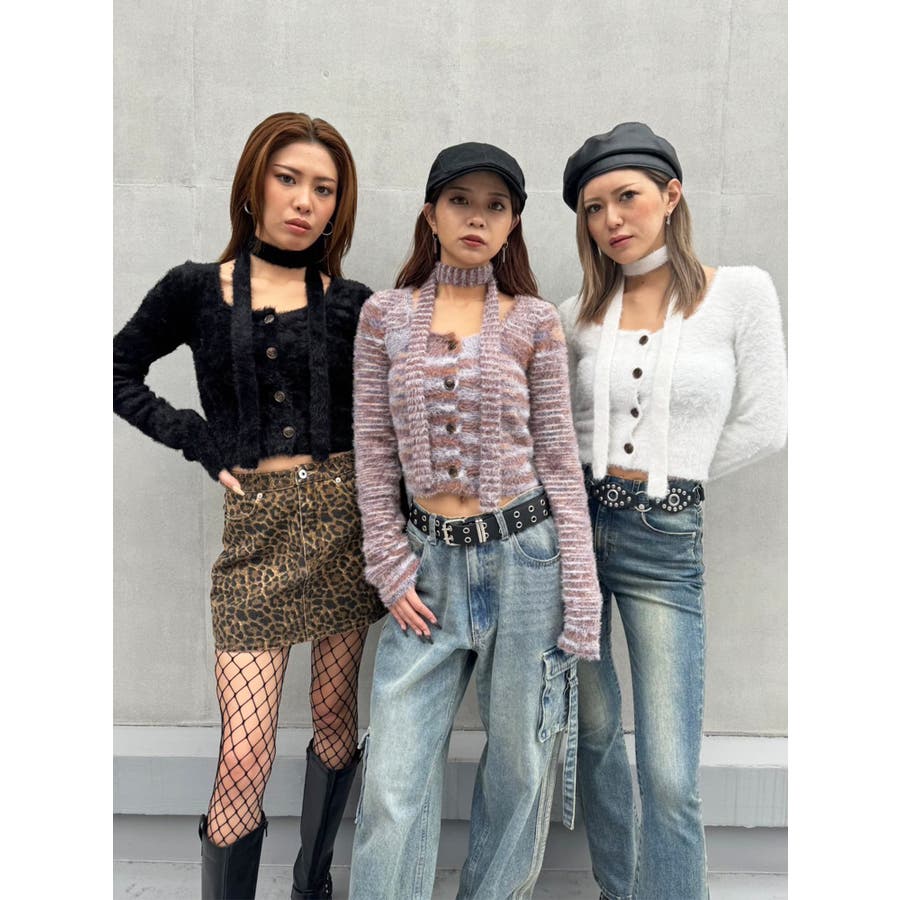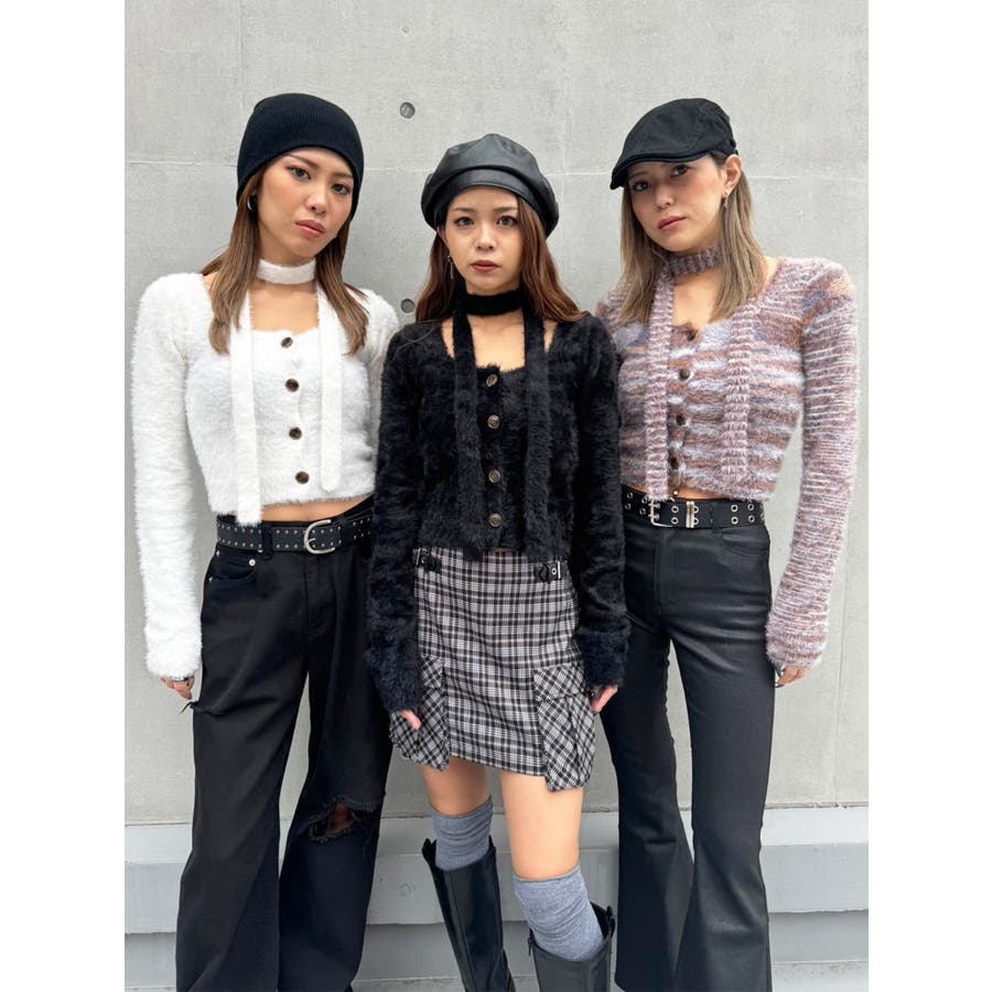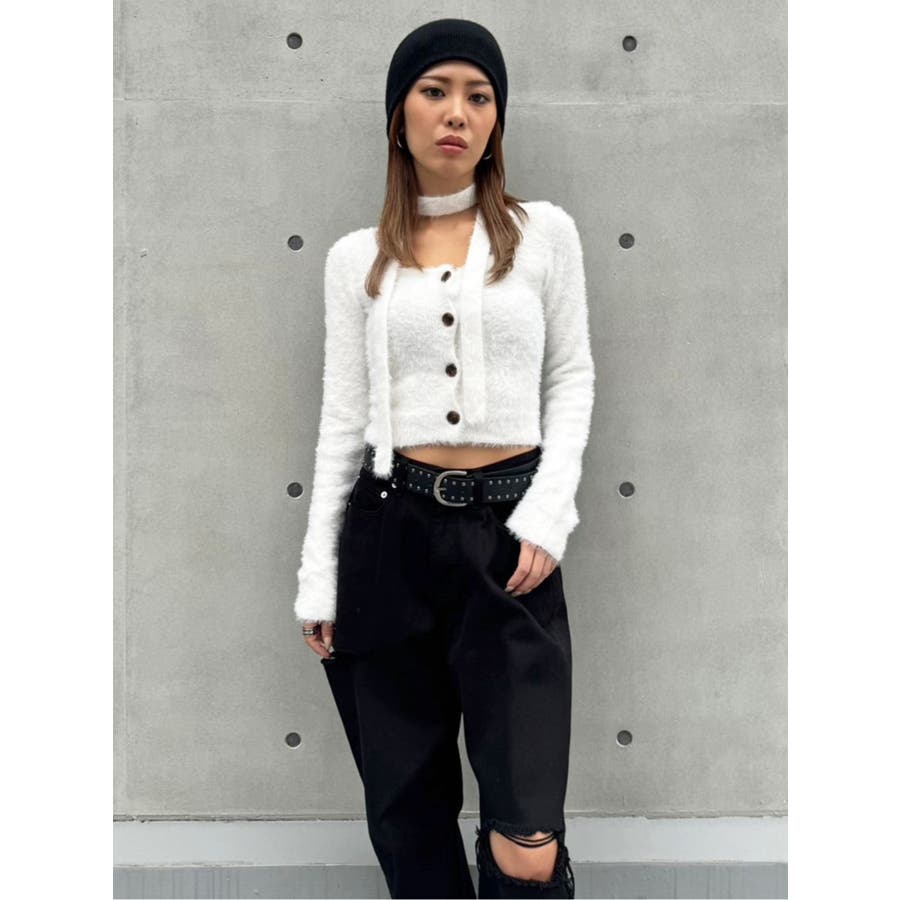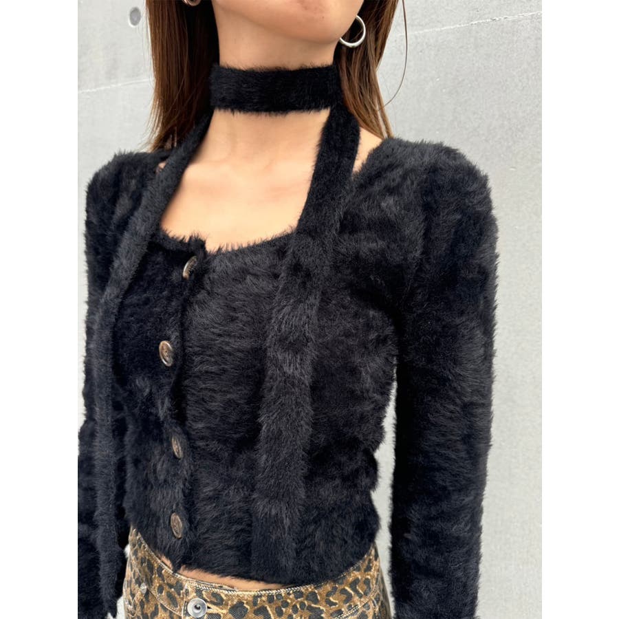 共糸のストールが付いたスクエアネックのニットトップス。着膨れしない程度にほどよく長い毛足のシャギーニットがシーズンムード漂う1着。フロントのマーブル釦がワンポイントになっています。スクエアネックでデコルテも綺麗に見えます。その日の気分でストールを巻いても良いですし、巻かずにアクセサリーを付けても◎すっきりとしたシルエットでボトム選びに困りません。ふわっと柔らかく伸縮性があるので細身でも窮屈感なく着やすいです。