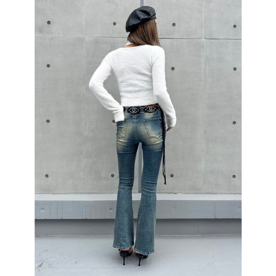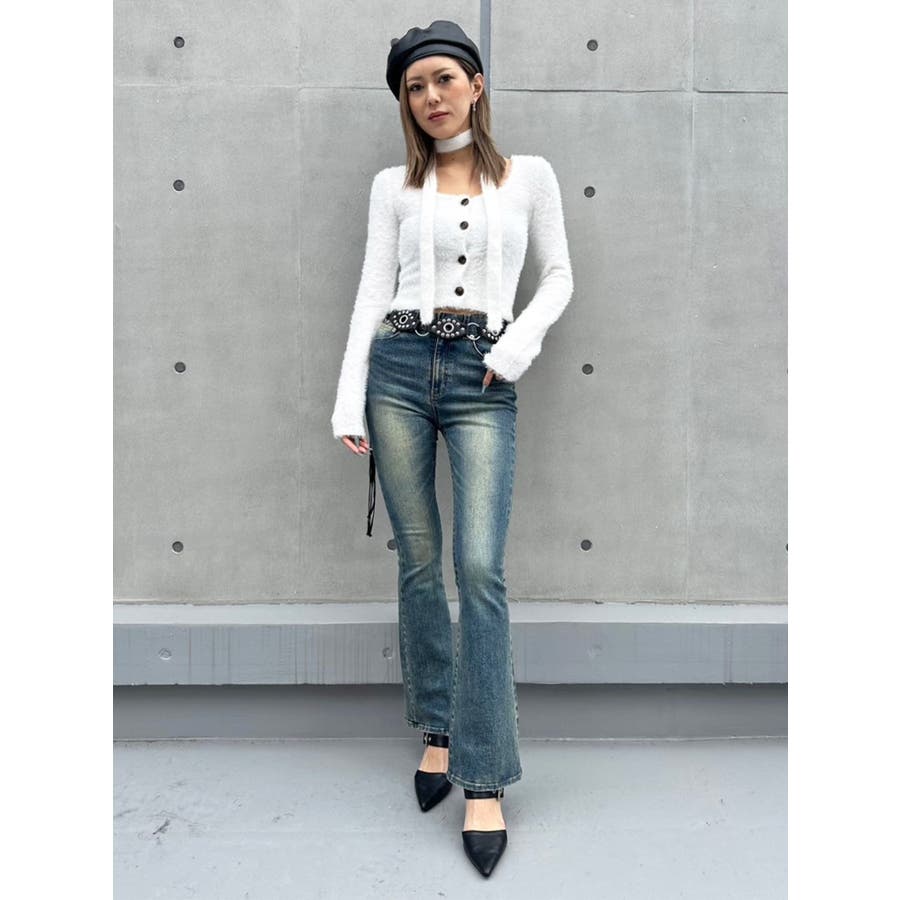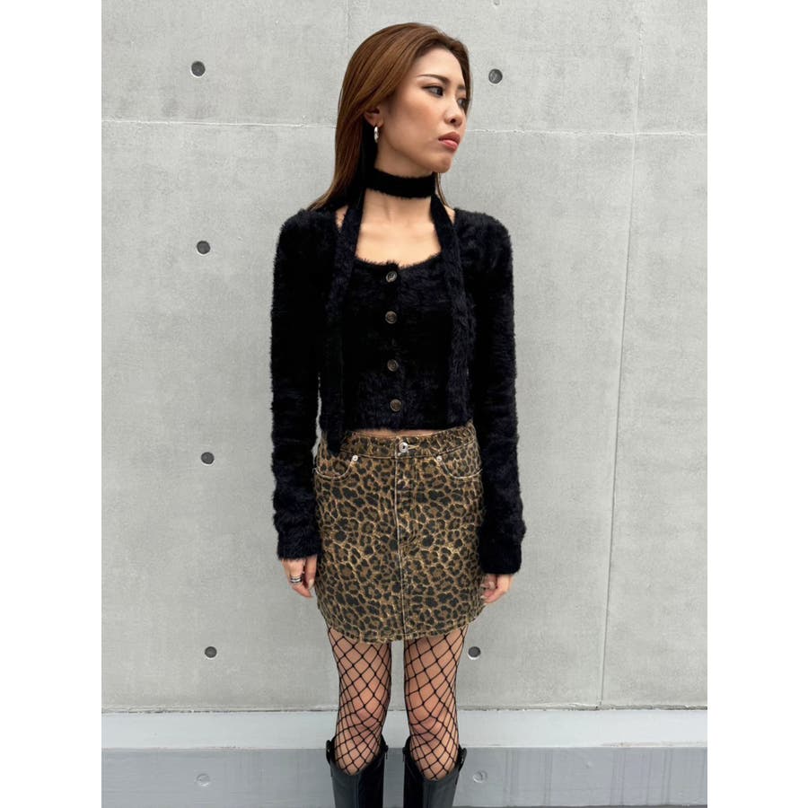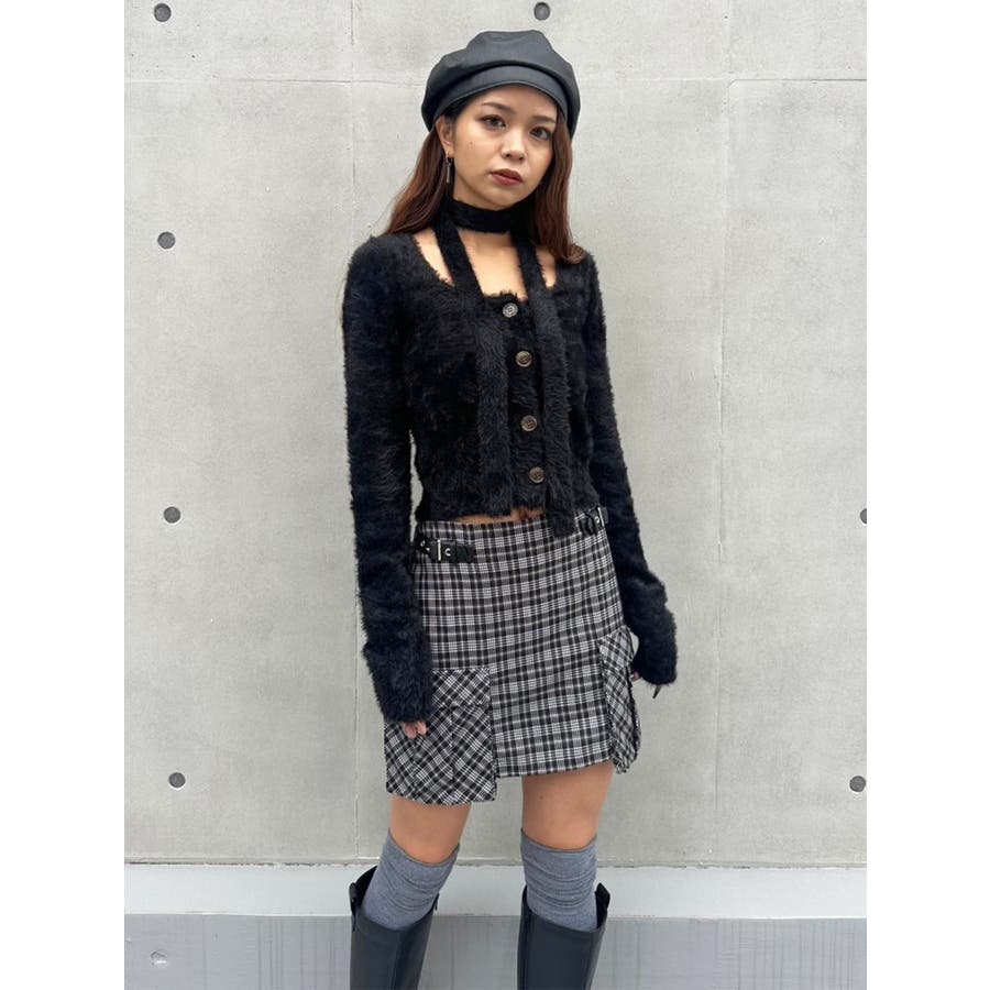 共糸のストールが付いたスクエアネックのニットトップス。着膨れしない程度にほどよく長い毛足のシャギーニットがシーズンムード漂う1着。フロントのマーブル釦がワンポイントになっています。スクエアネックでデコルテも綺麗に見えます。その日の気分でストールを巻いても良いですし、巻かずにアクセサリーを付けても◎すっきりとしたシルエットでボトム選びに困りません。ふわっと柔らかく伸縮性があるので細身でも窮屈感なく着やすいです。