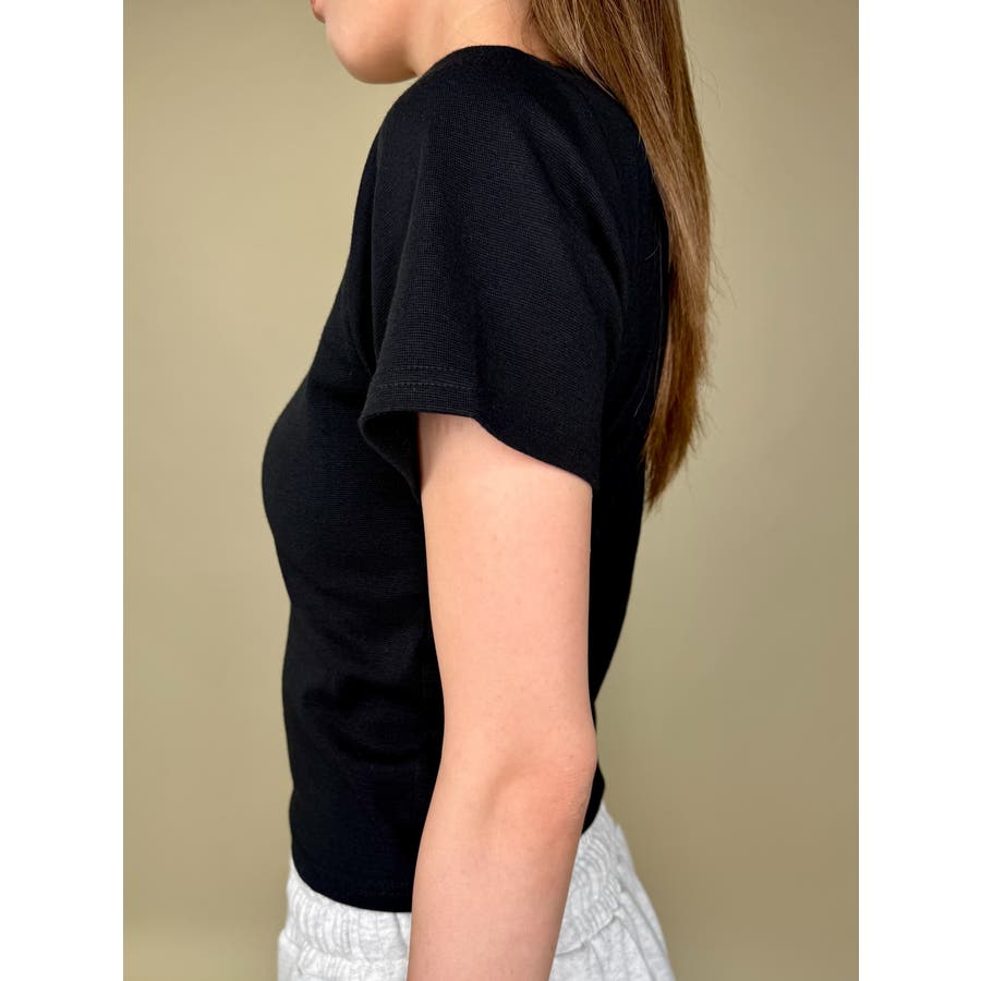 お臍が隠れるくらいの着丈で、ボトム合わせにも困りません。