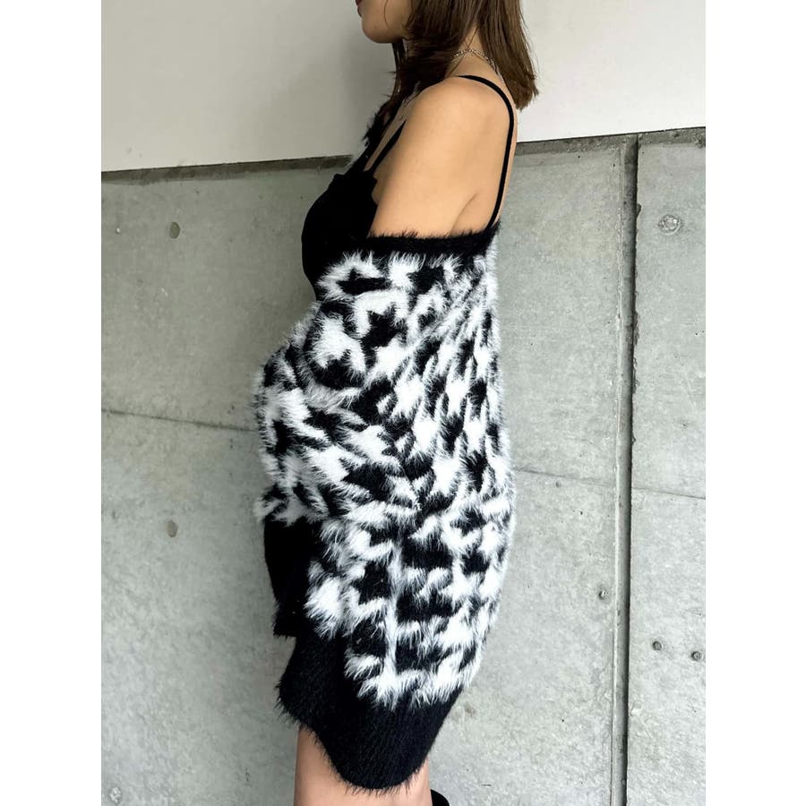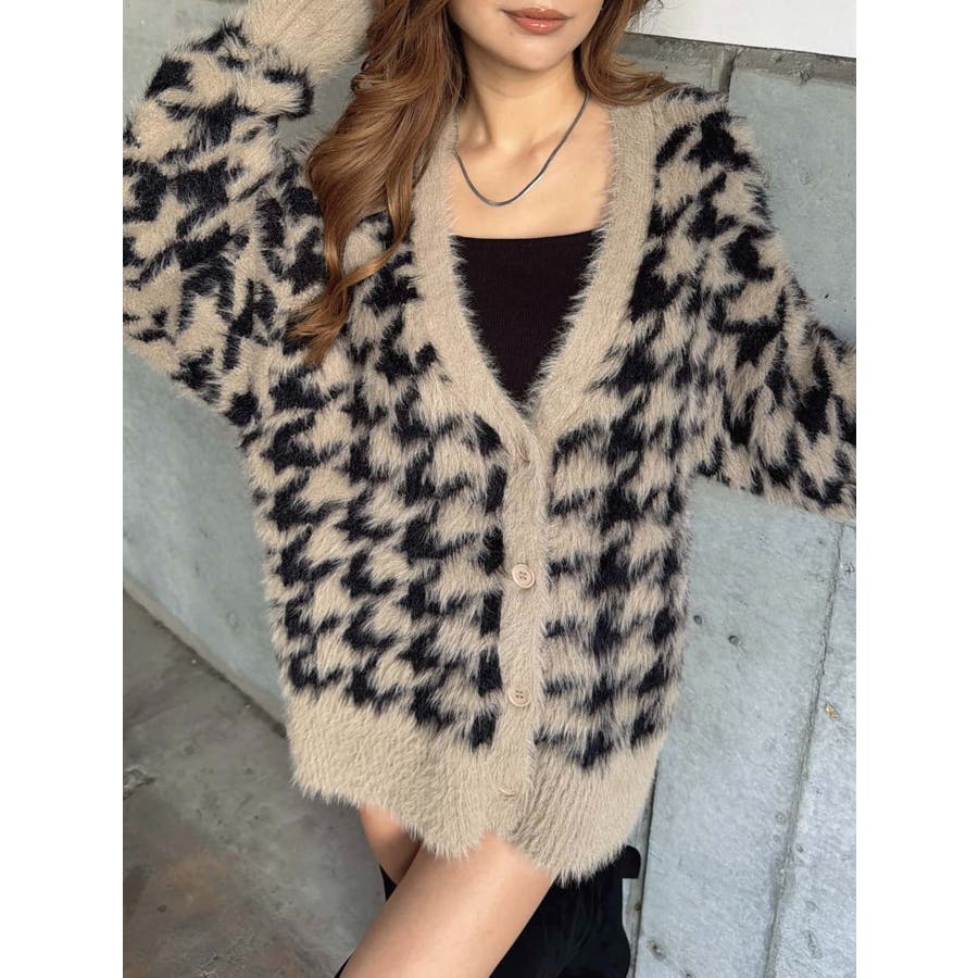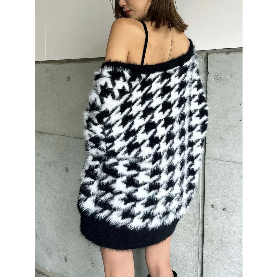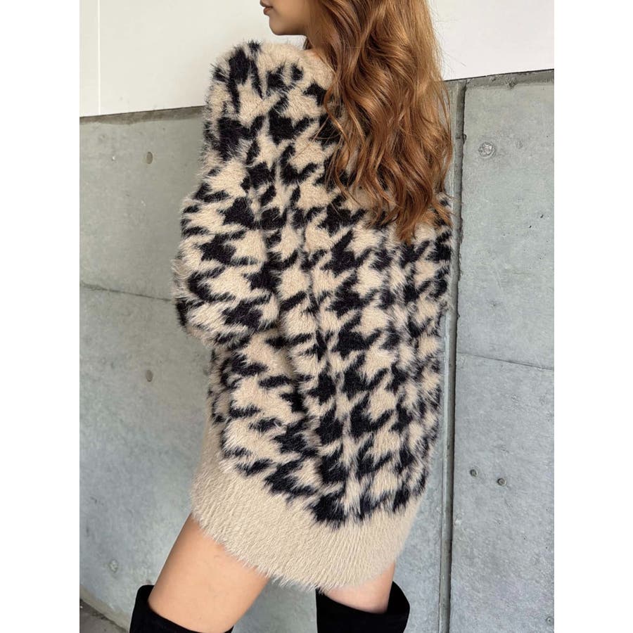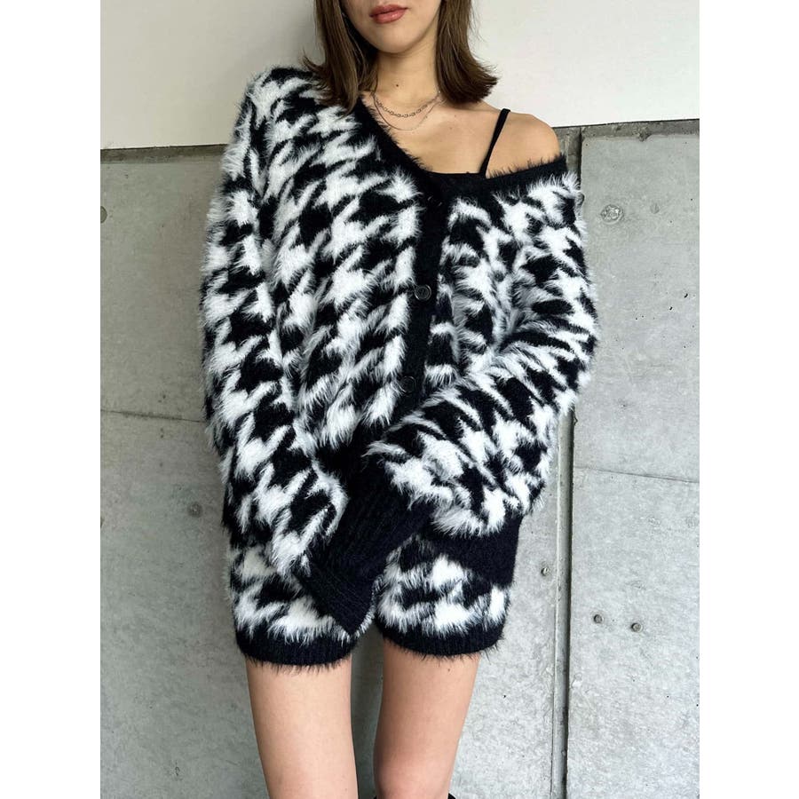 大きめの千鳥柄が存在感抜群で着るだけで映えるシャギーニットカーディガン。