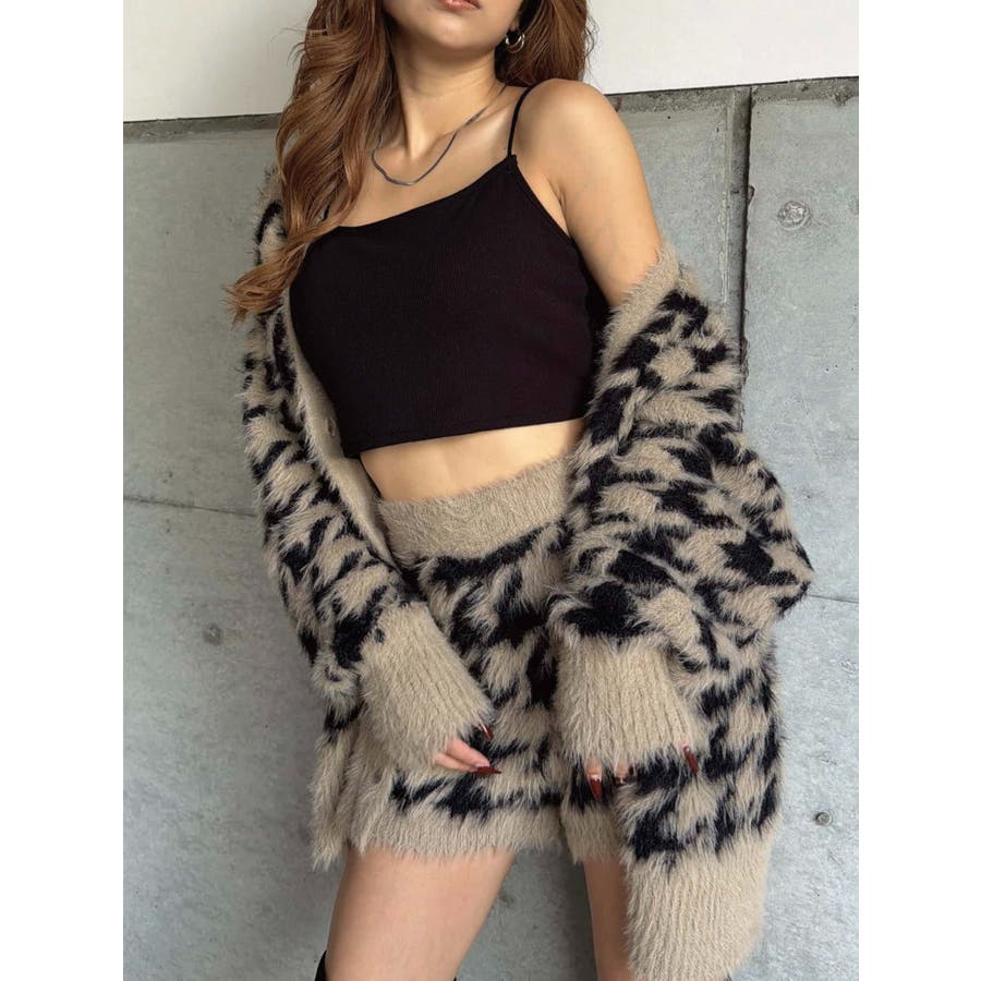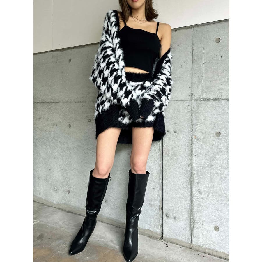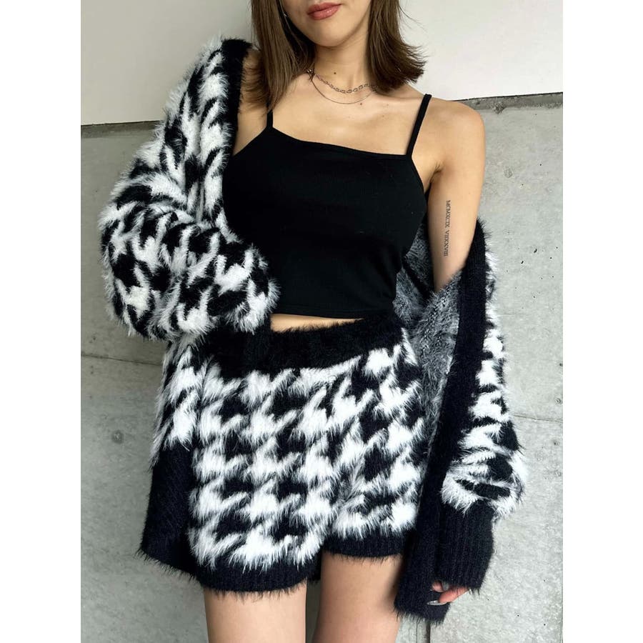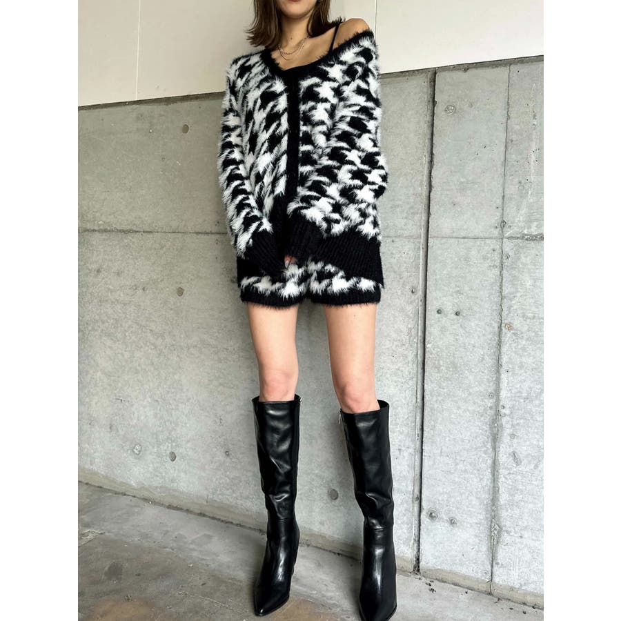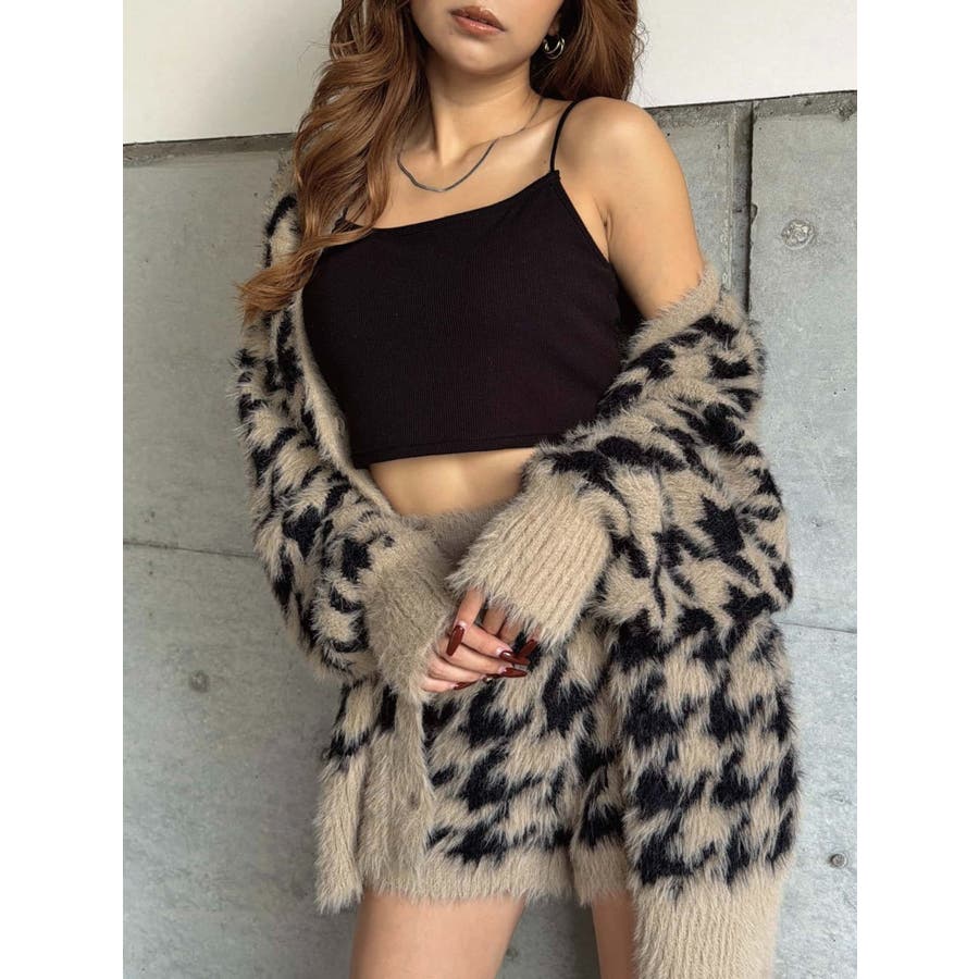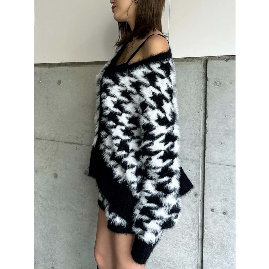 大きめの千鳥柄が存在感抜群で着るだけで映えるシャギーニットカーディガン。