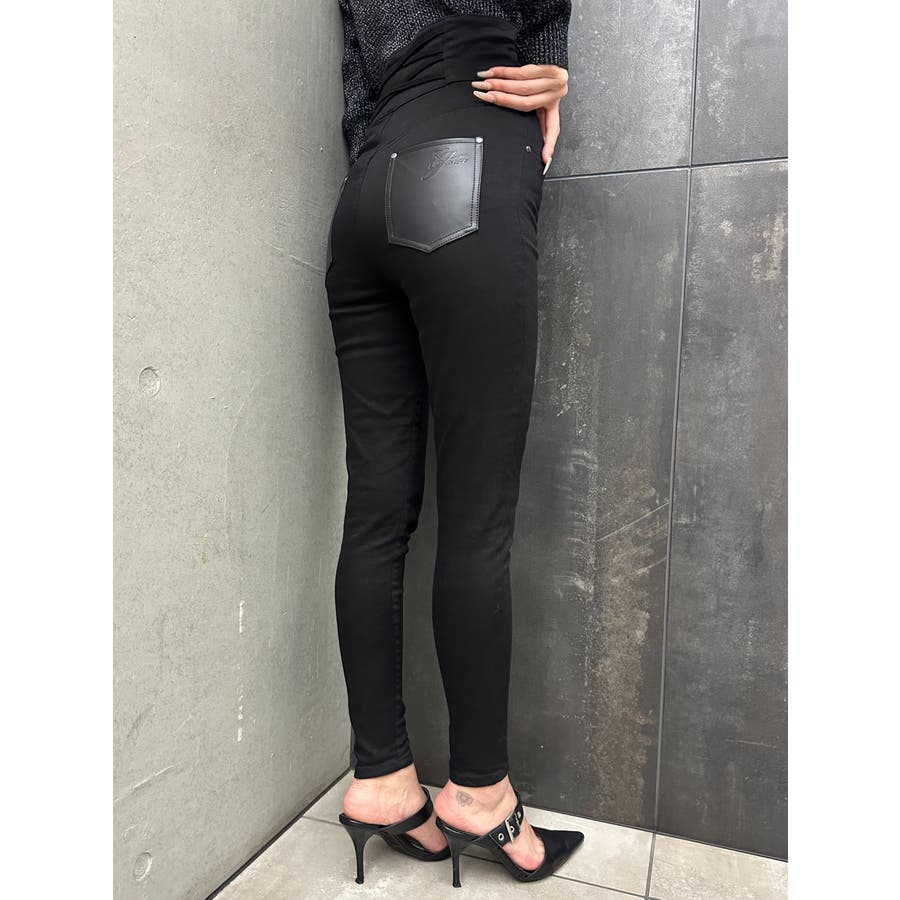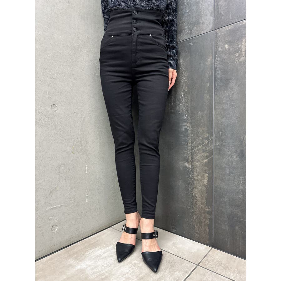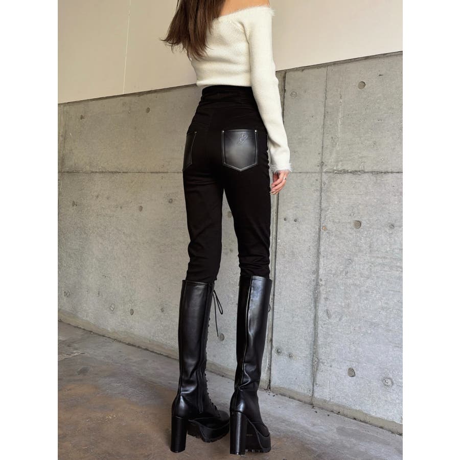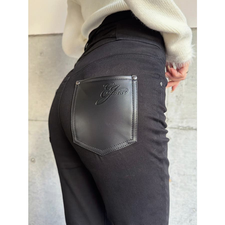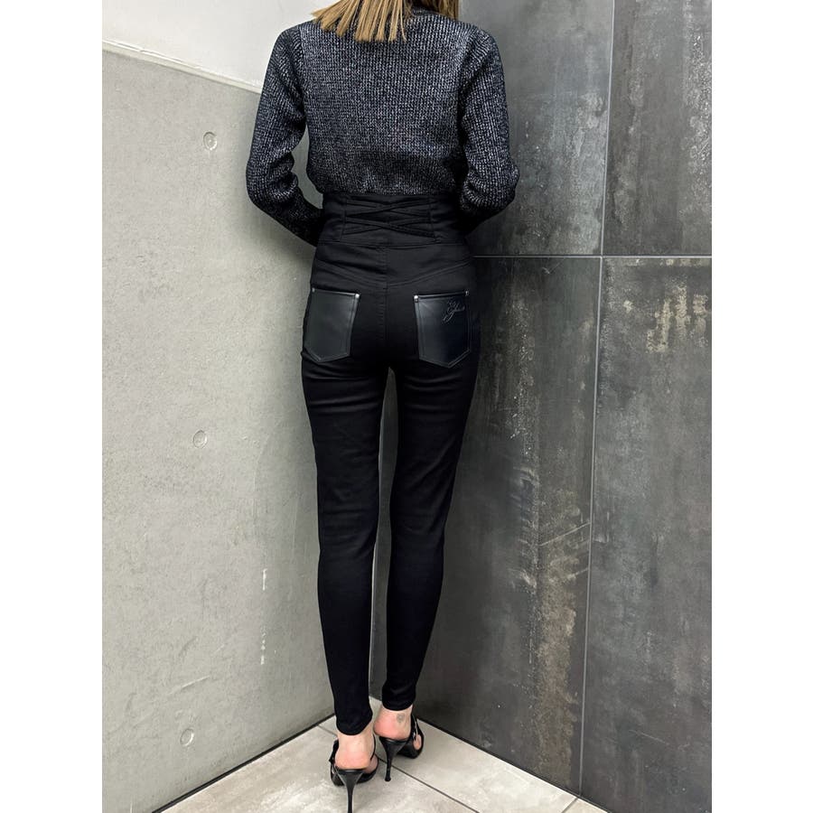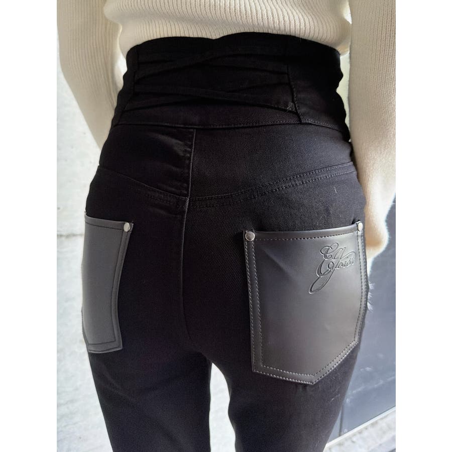 Backウエストのダブルクロスとフェイクレザーポケットがデザインポイントになっているハイウエストスキニーパンツ。