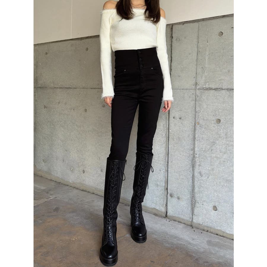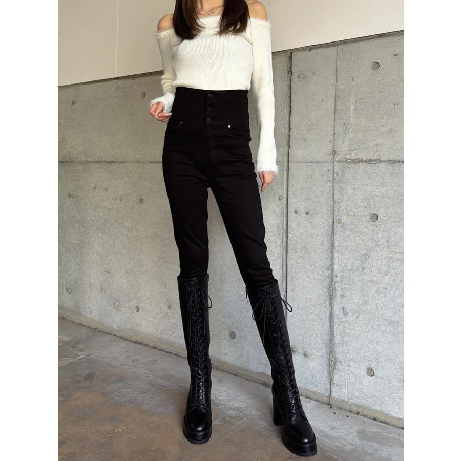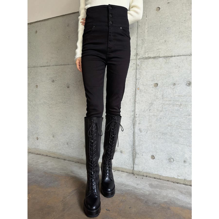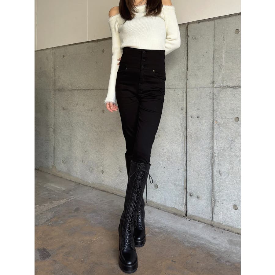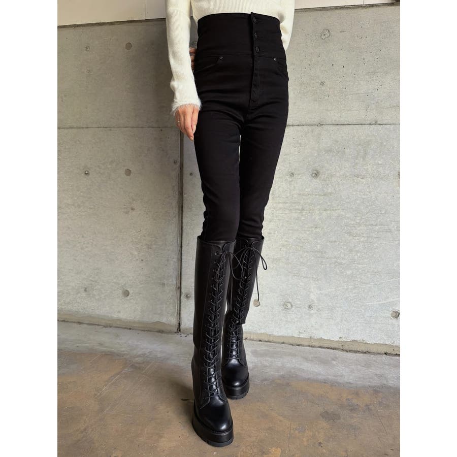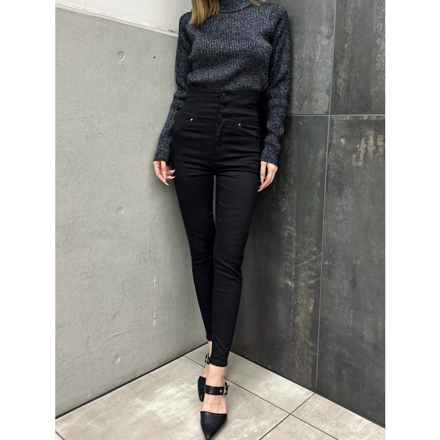 Backウエストのダブルクロスとフェイクレザーポケットがデザインポイントになっているハイウエストスキニーパンツ。