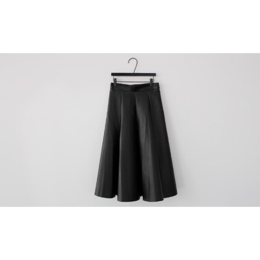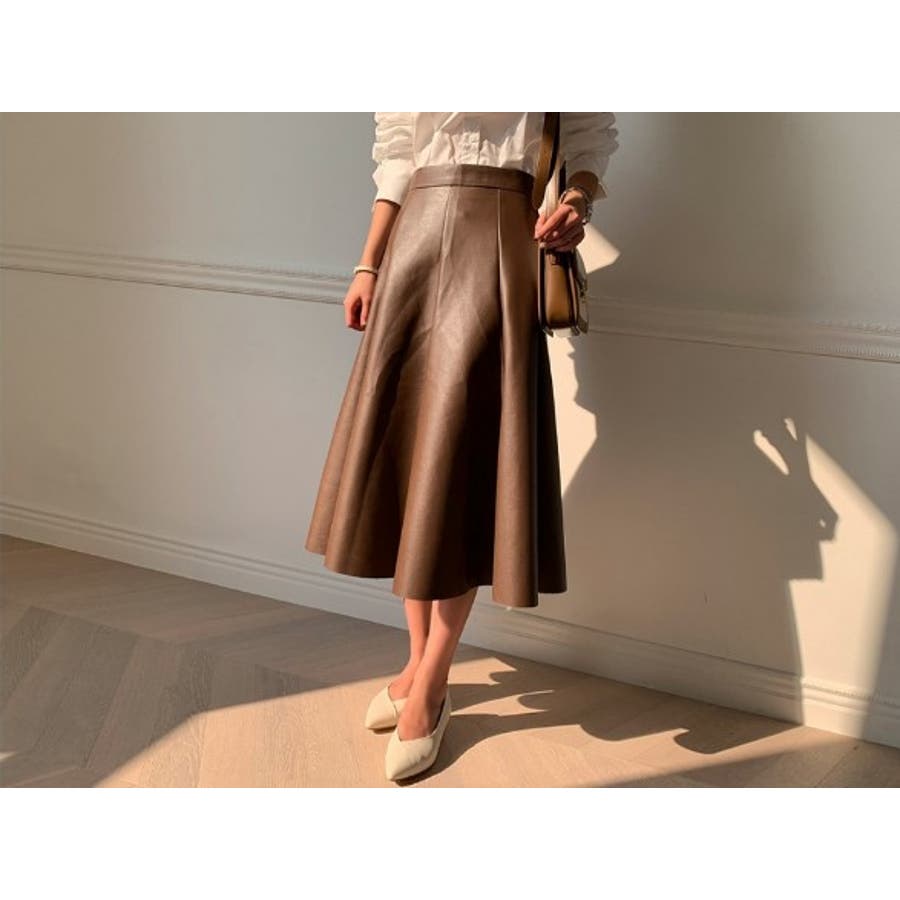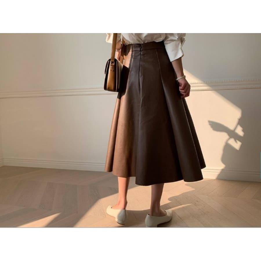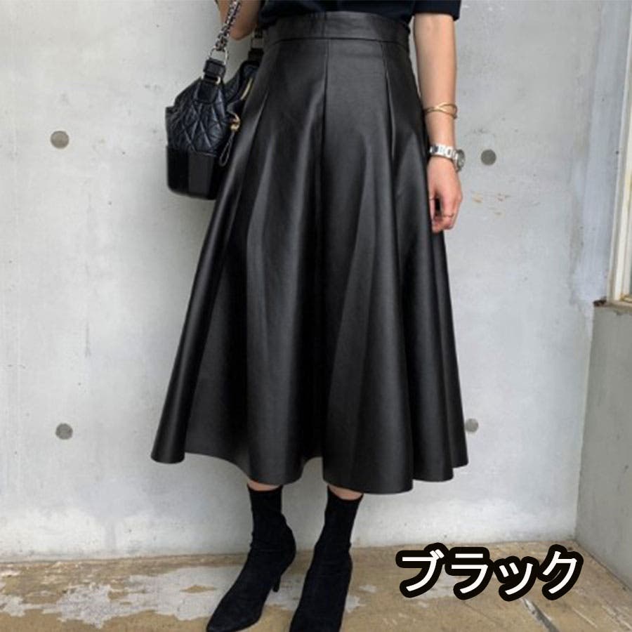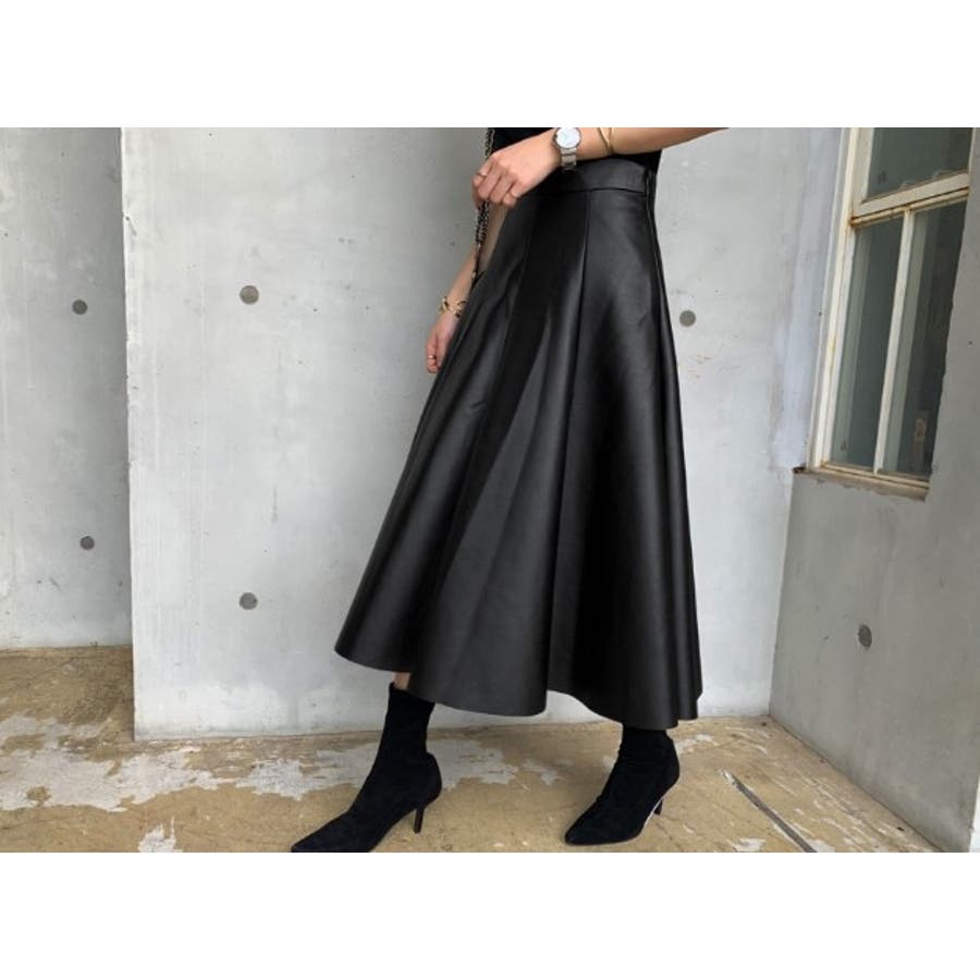 レザーミモレ丈 フレアライン フェイクレザースカート