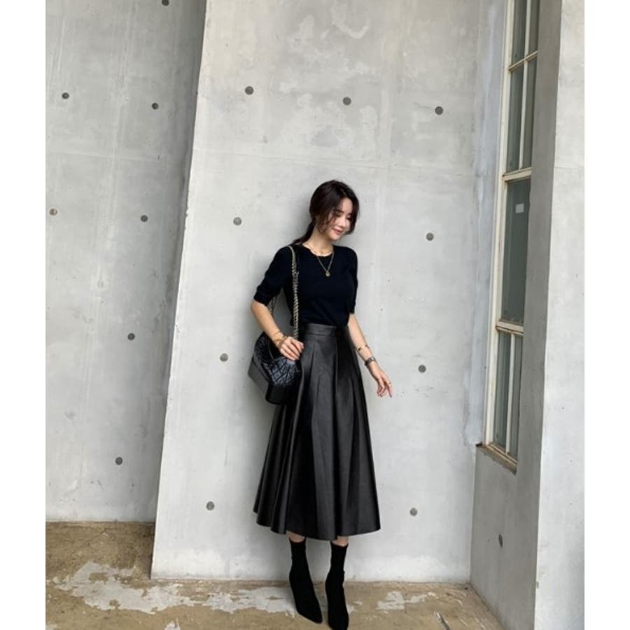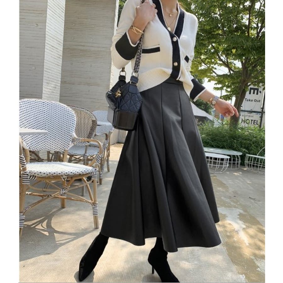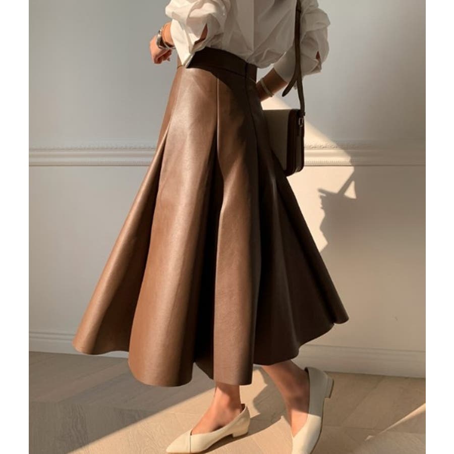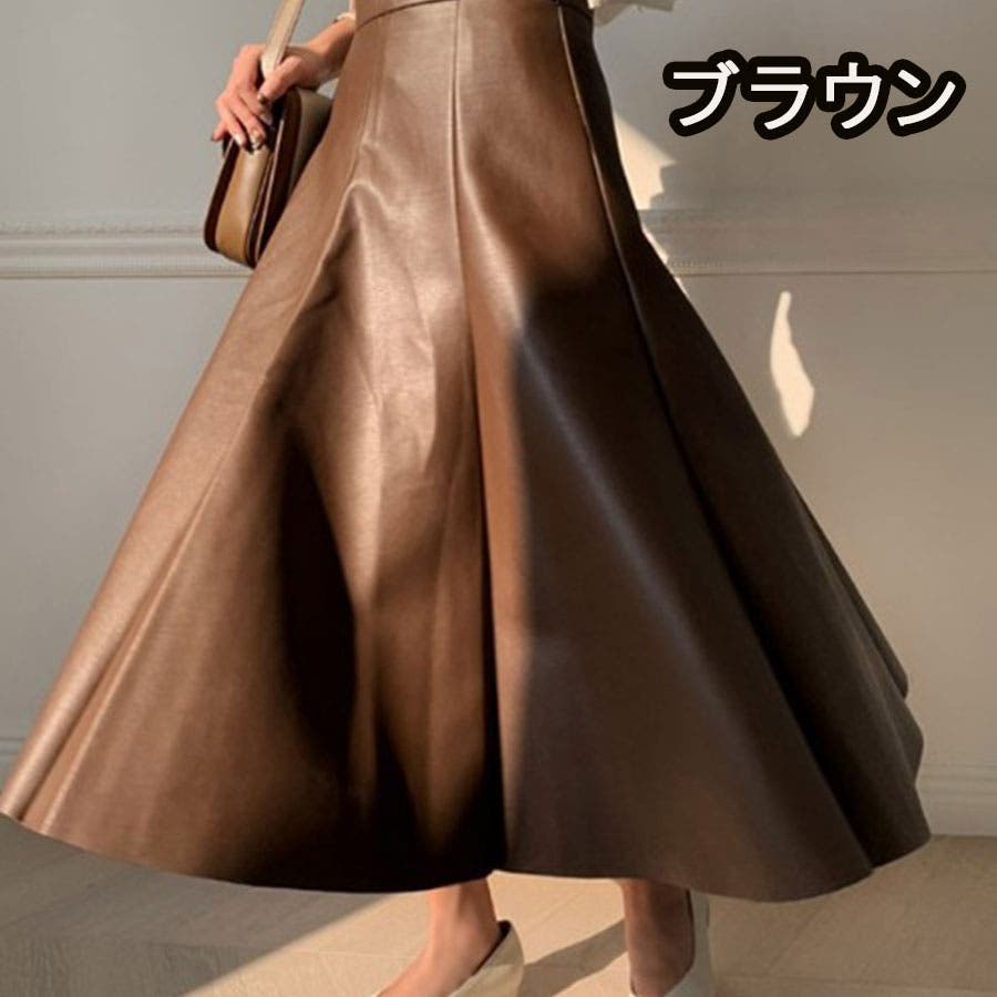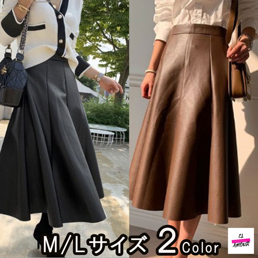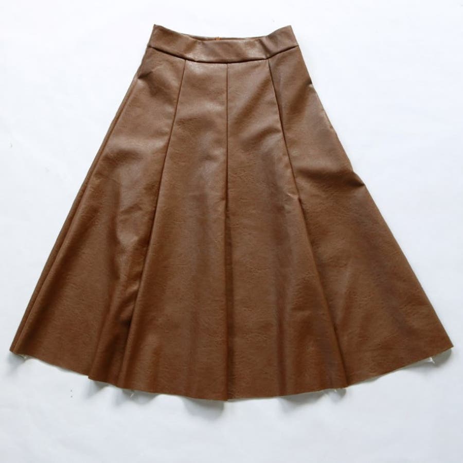 レザーミモレ丈 フレアライン フェイクレザースカート