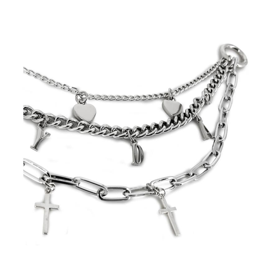 表面には取り外し可能な3連チェーンを付けました。同じチェーンを3つ並べてもつまらない。大きさや形の違う3つのチェーンを並べ、それぞれのチェーンにはクロスやGYDA、ハートのメタルを添えました。