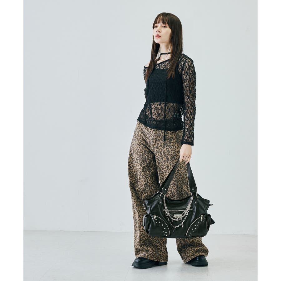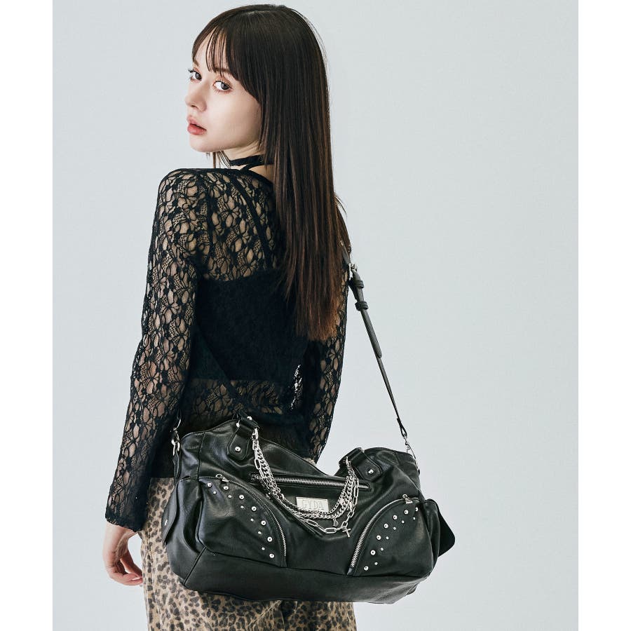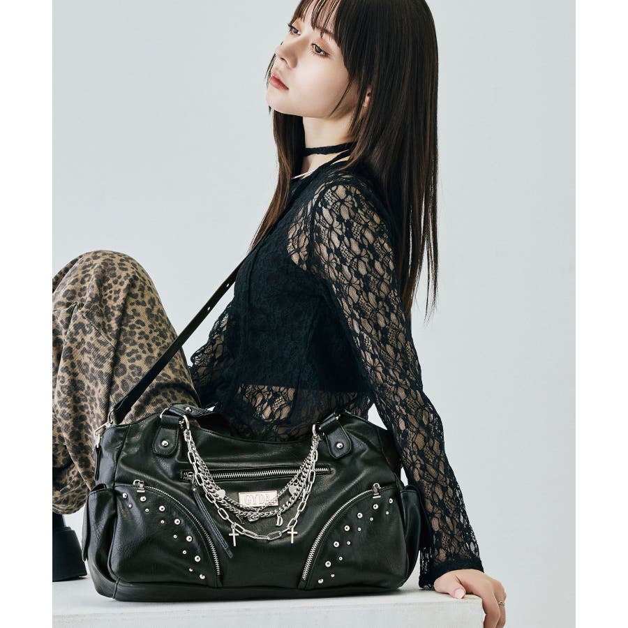 スタッズやクロス、チェーンでちょい悪の雰囲気を持たせながらチェーンにはハートのメタルを合わせる事で可愛さもプラス。