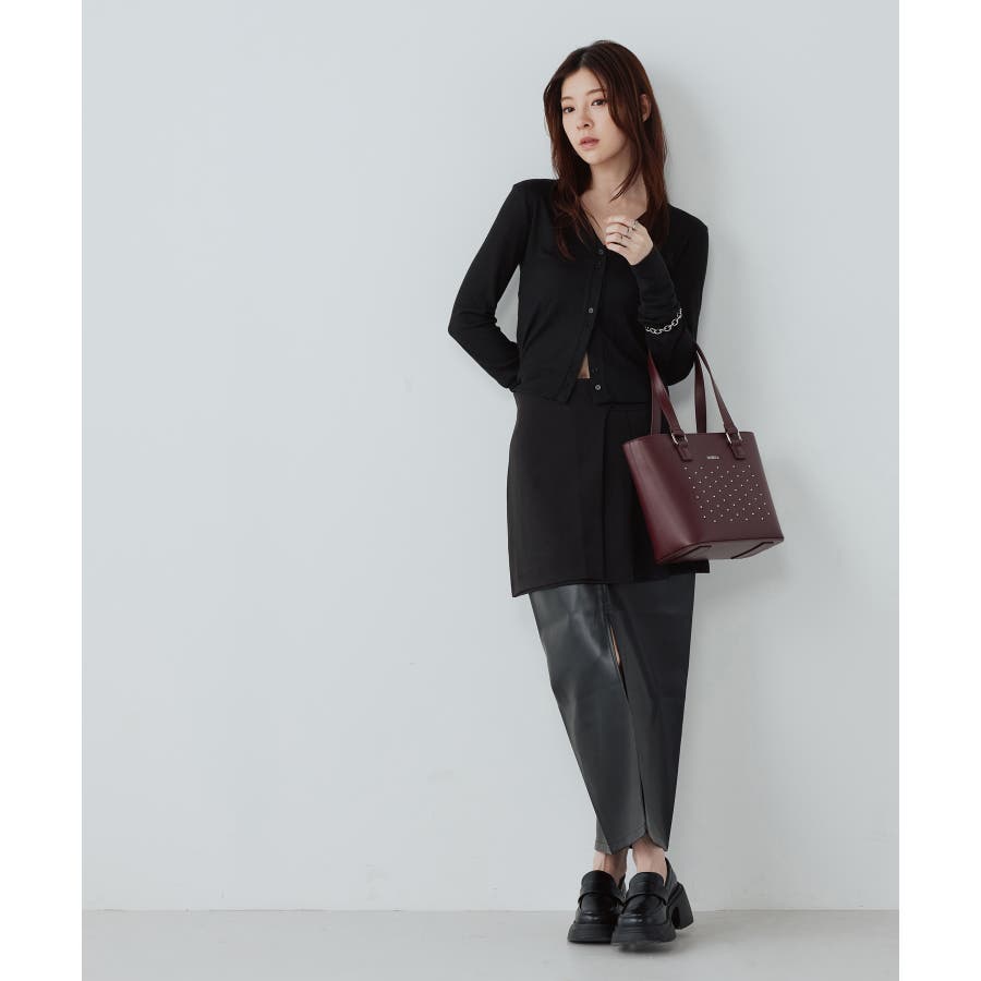 丸スタッズを付ける事で尖った印象のあるスタッズもスタイリッシュな雰囲気に。