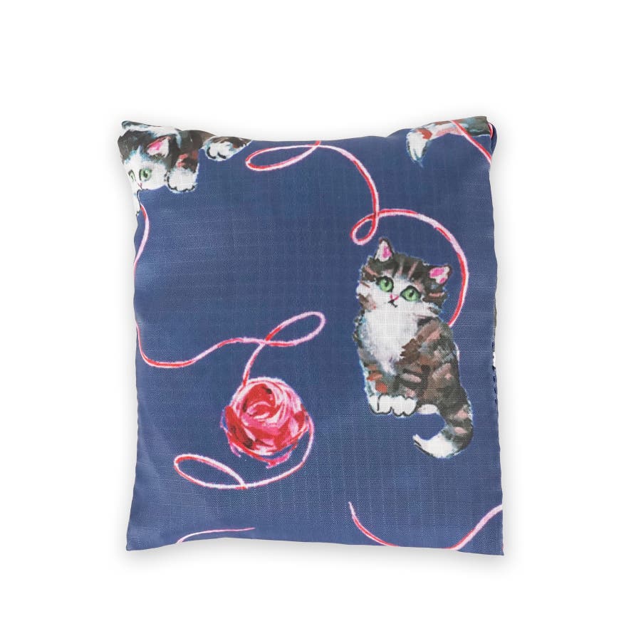 中身が透けにくく落ち着いた印象のネイビー。ネコが毛糸で遊ぶ様子をイラストにしたデザイン。