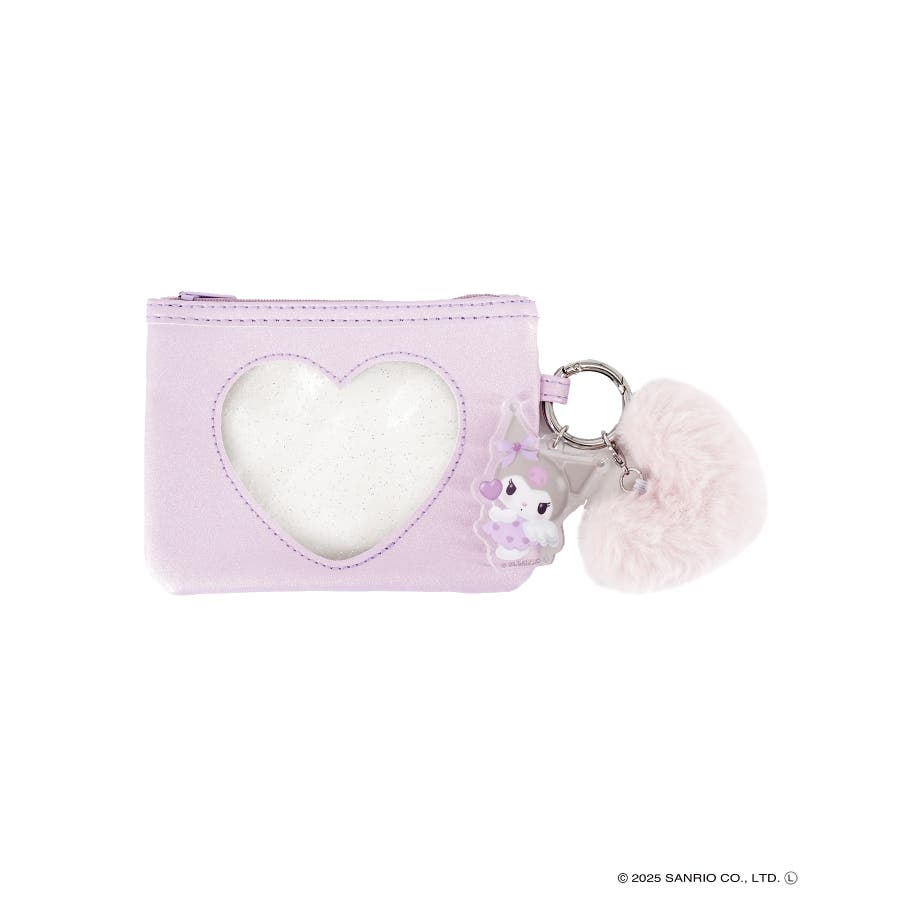 ふわふわのハート型ファーと、エンジェルモチーフのキャラクターのアクリルキーホルダーがセットになった、中身が見えるクリア素材のハート窓付きポーチです!