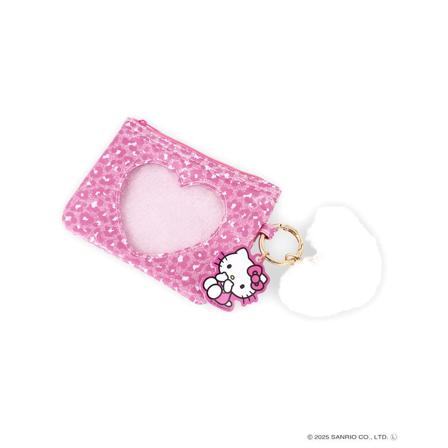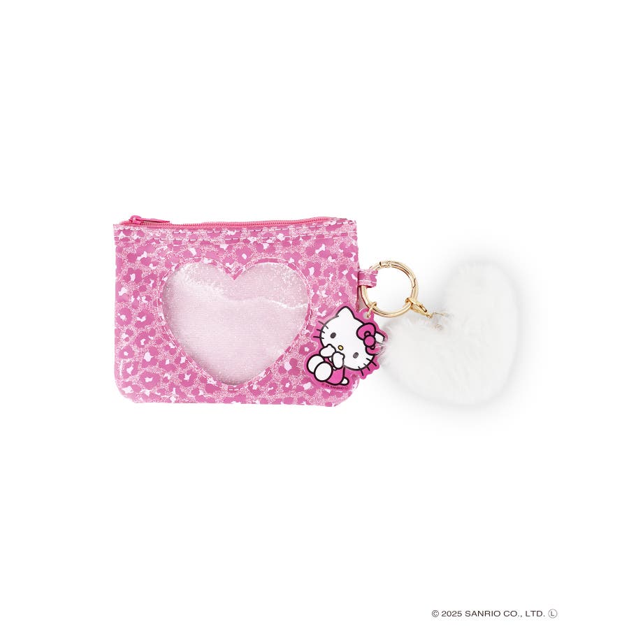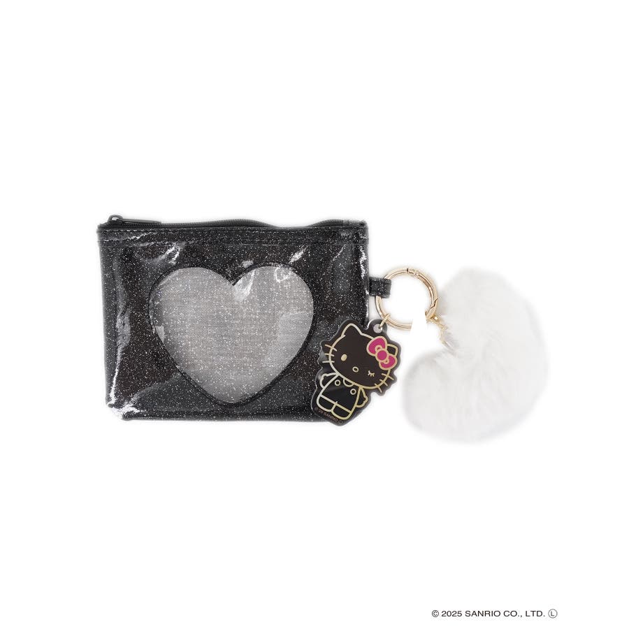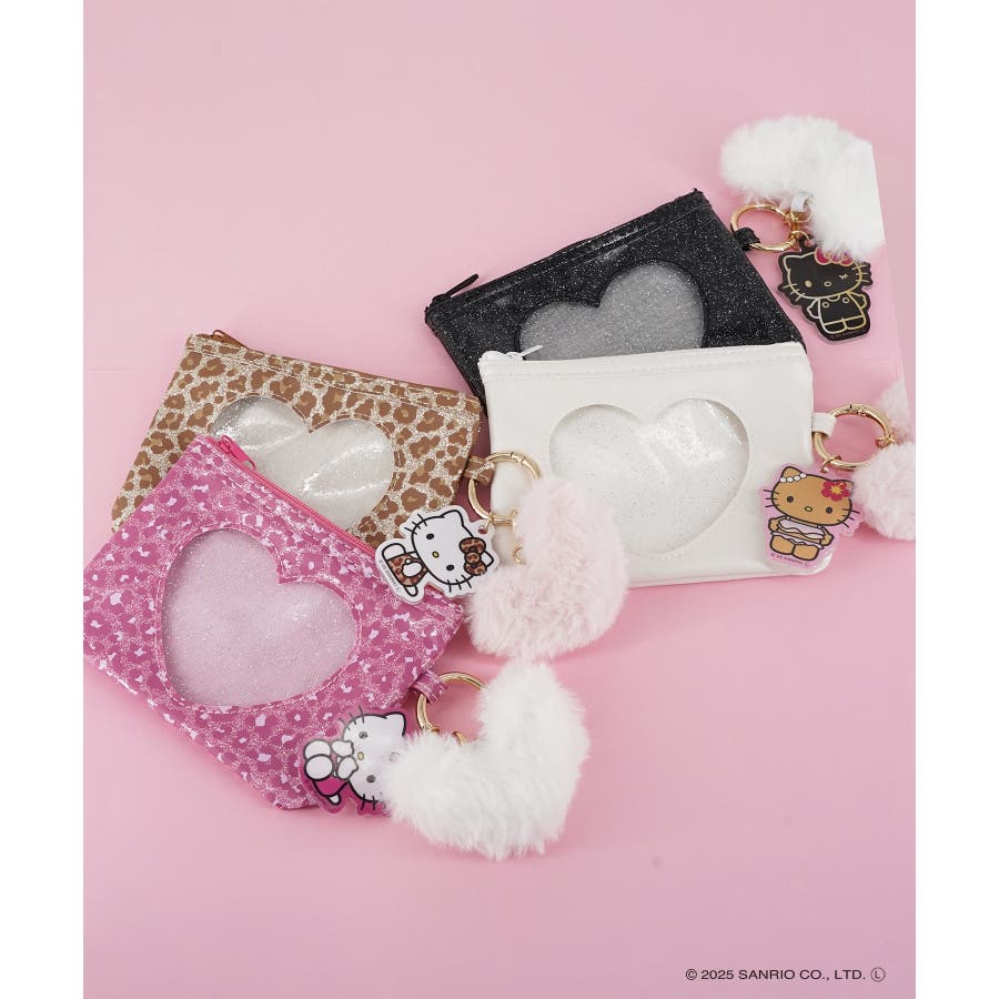 ふわふわのハート型ファーと、ハローキティのアクリルキーホルダーがセットになった、中身が見えるクリア素材のハート窓付きポーチです!