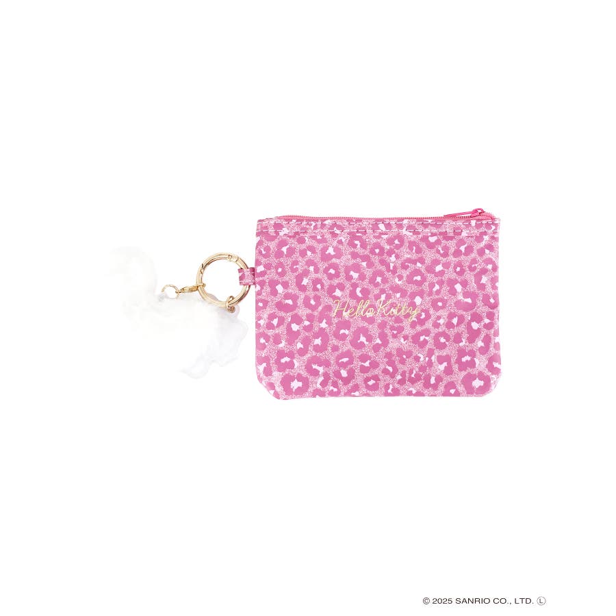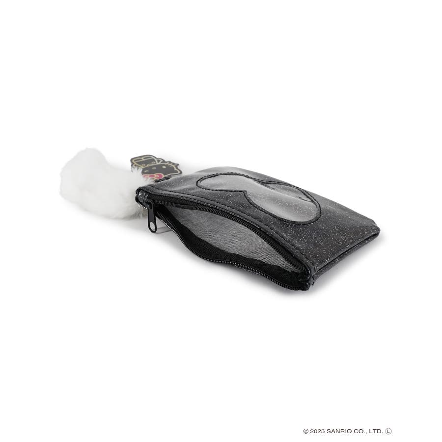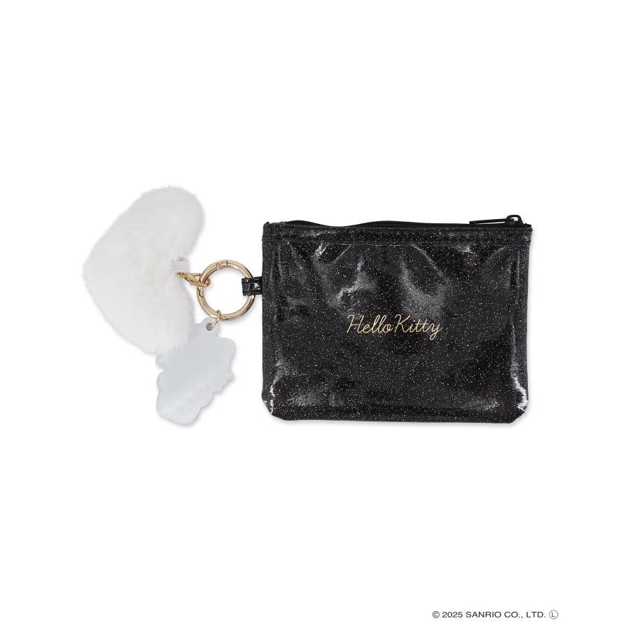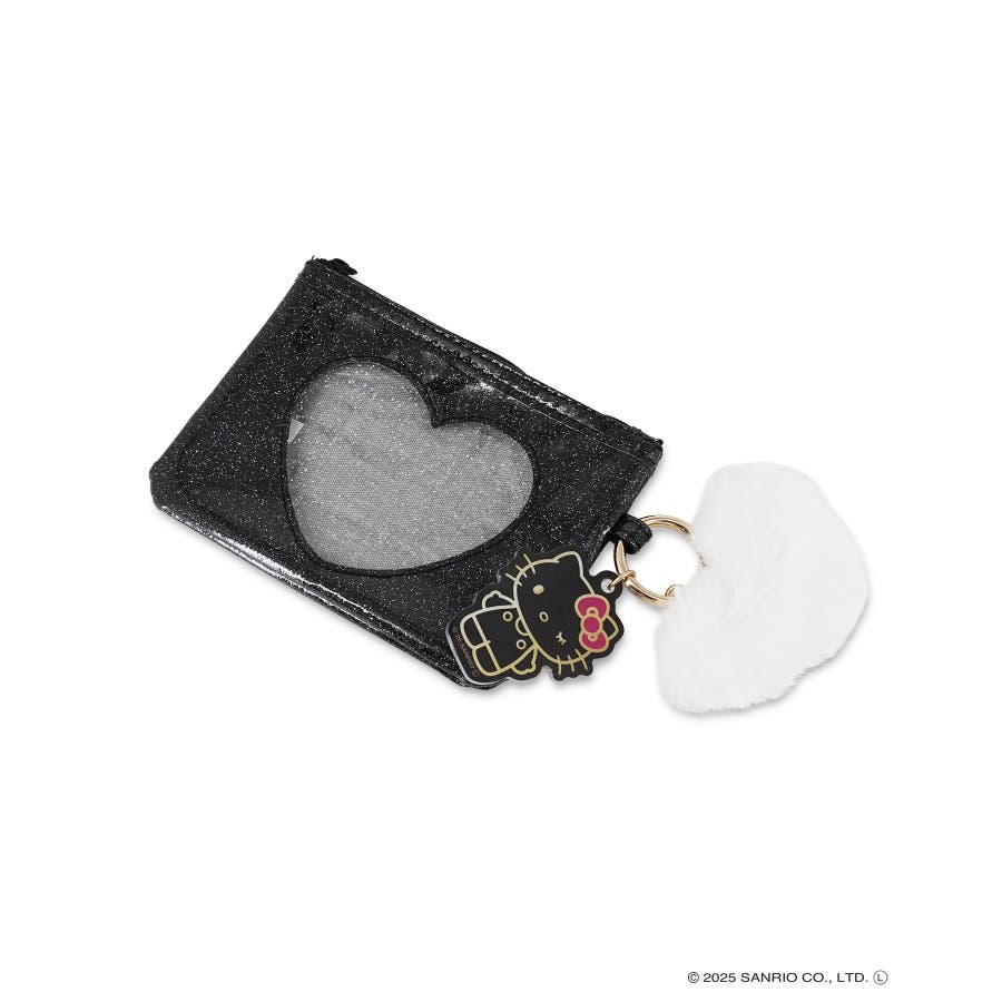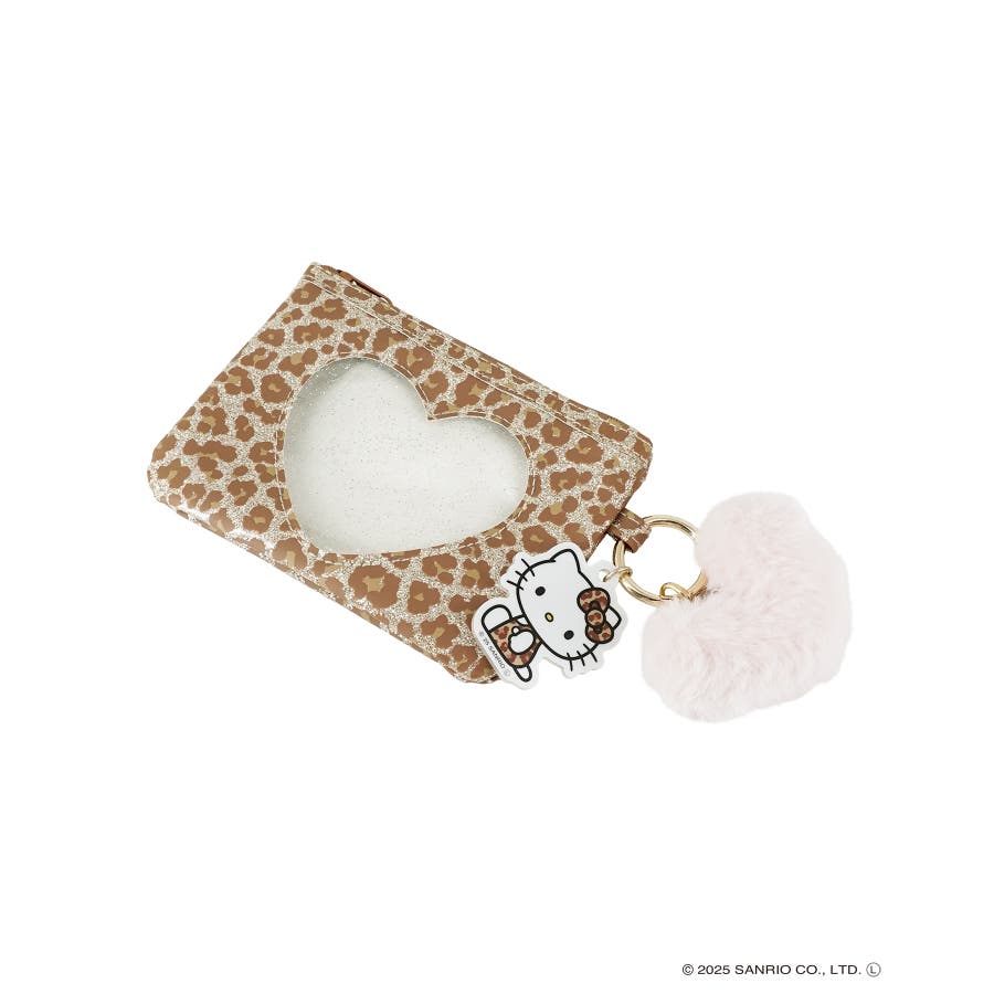 ふわふわのハート型ファーと、ハローキティのアクリルキーホルダーがセットになった、中身が見えるクリア素材のハート窓付きポーチです!