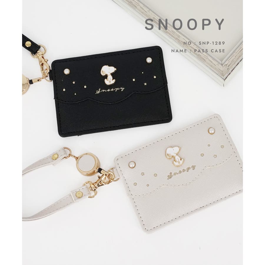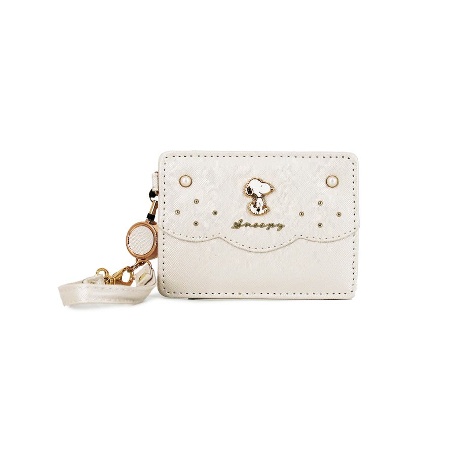 真珠のようなキラキラとしたパールのアクセントが大人可愛いスヌーピーのパスケース。