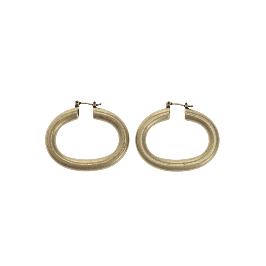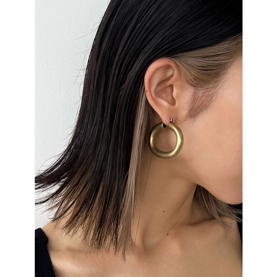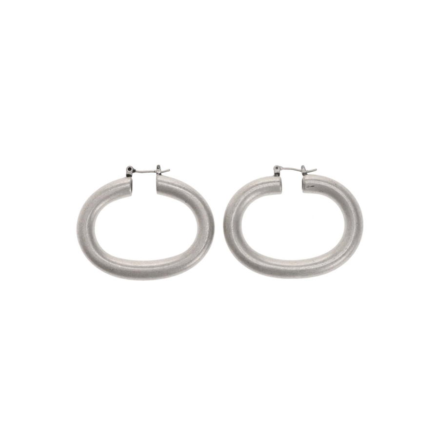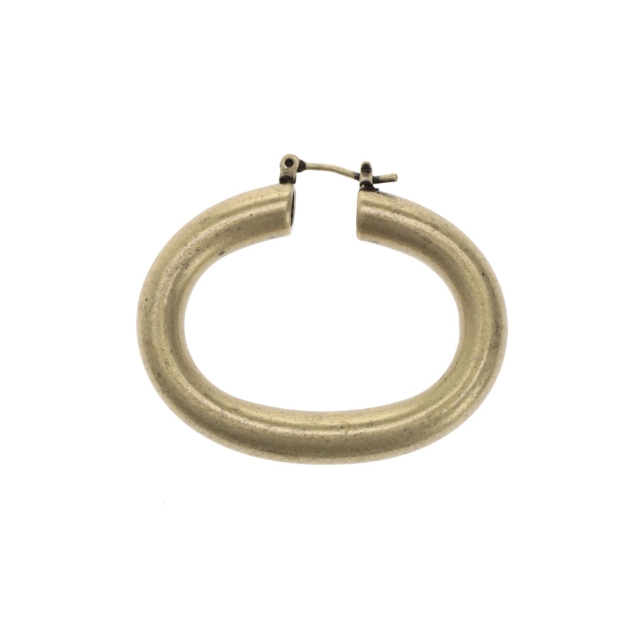楕円形状のフープピアスです。ヴィンテージ風の加工を施したつけるだけでポイントになるピアスです。ぽってりとしたボリューム感がありますが、フープの内側は空洞になっているため非常に軽く、長時間の着用でも疲れにくいです。