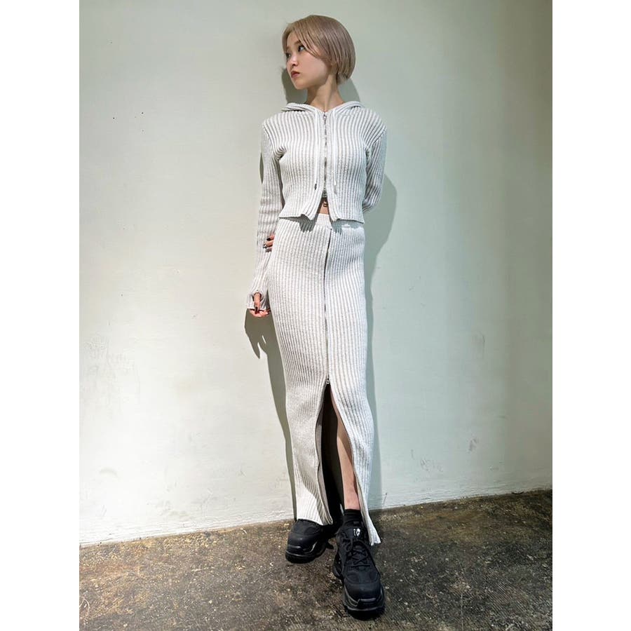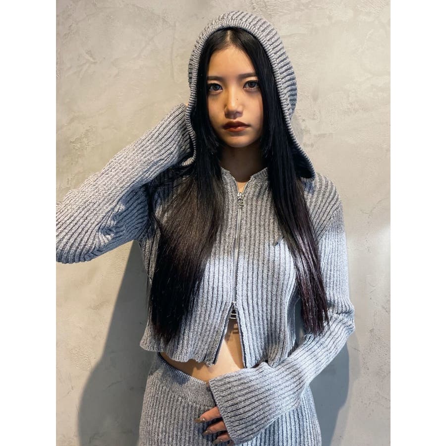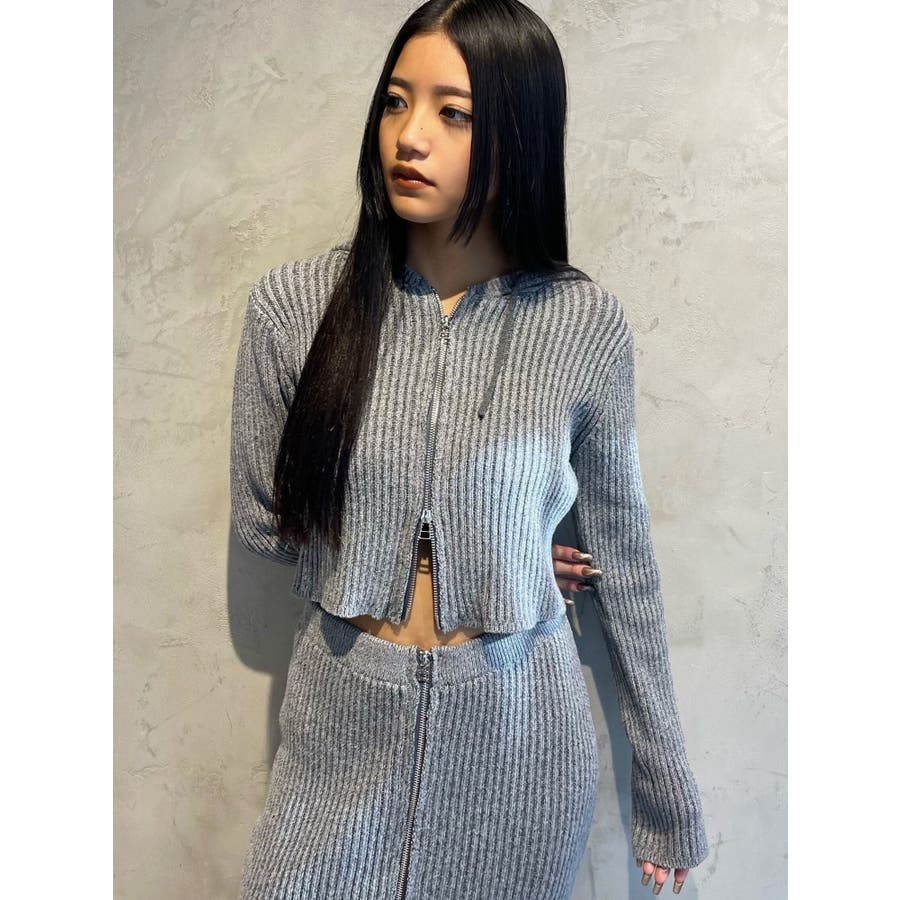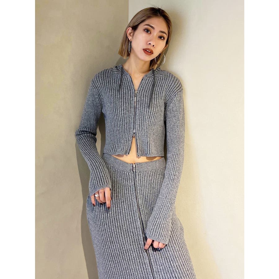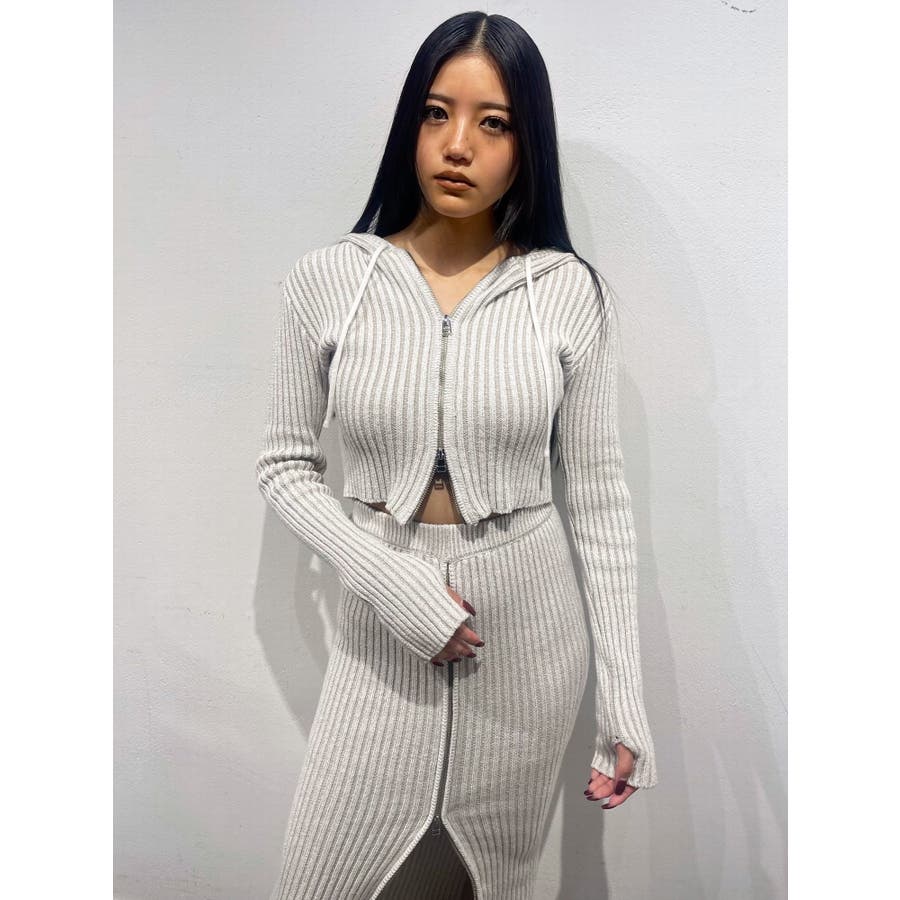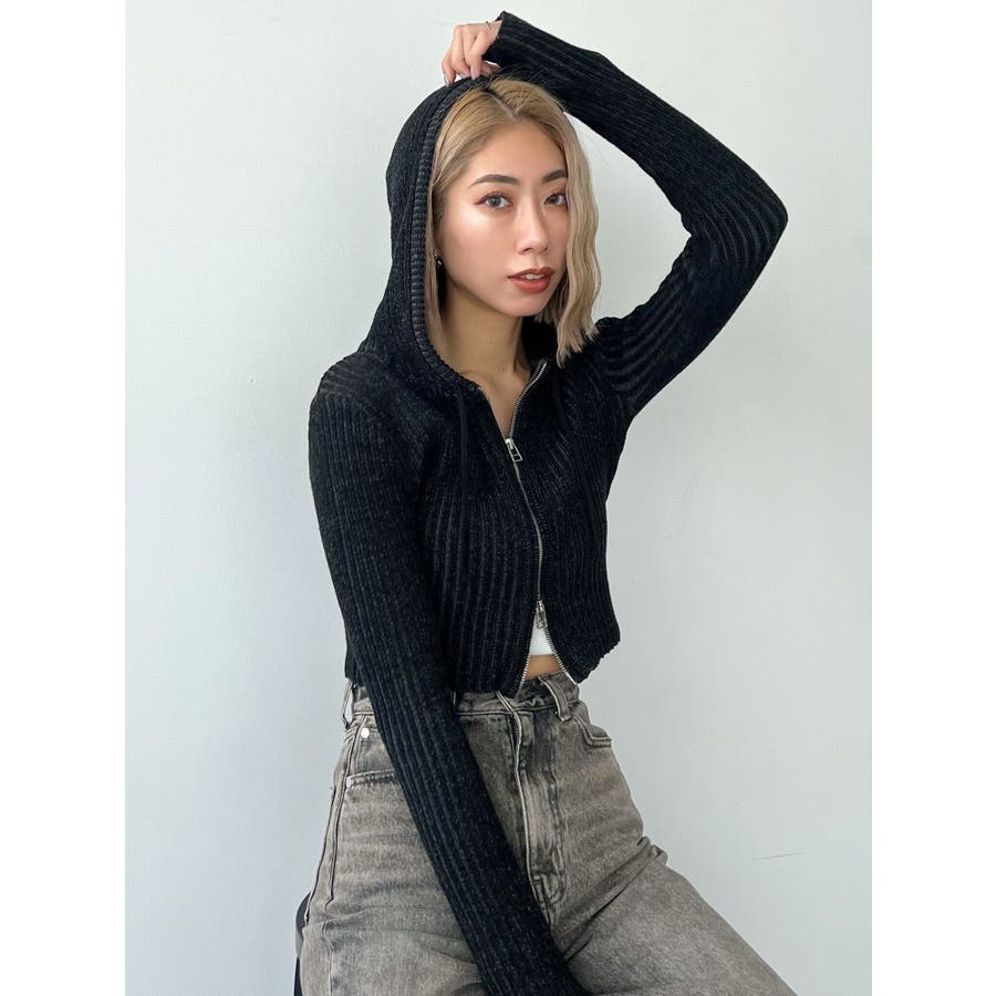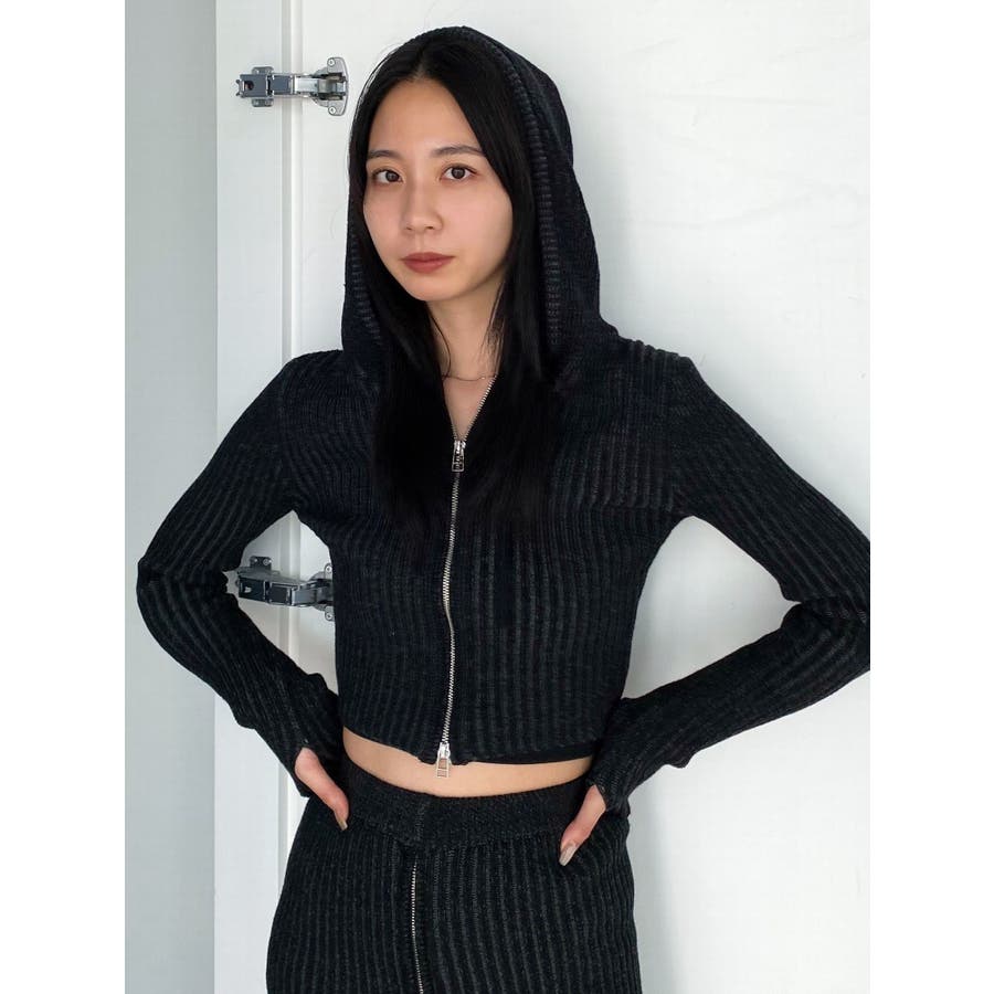 ニットパーカーはへそ上のショート丈でタイトなシルエットです。