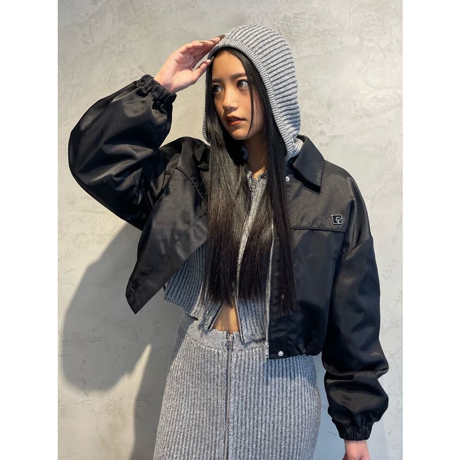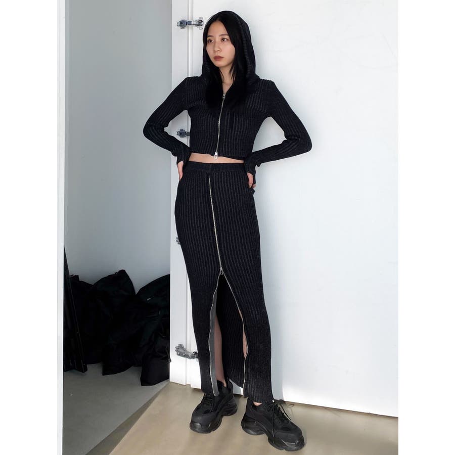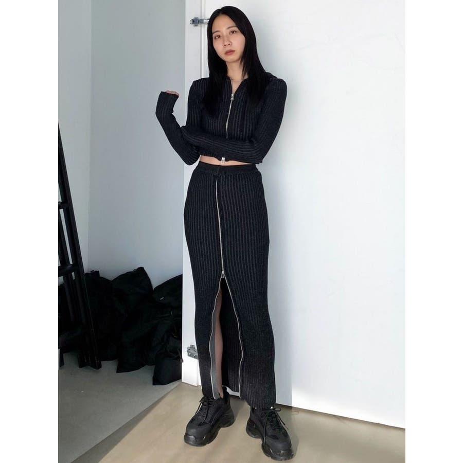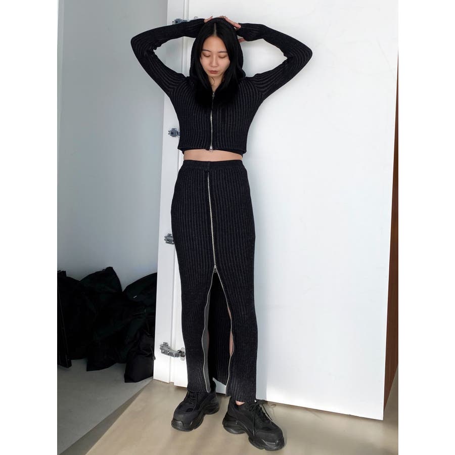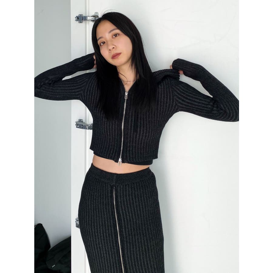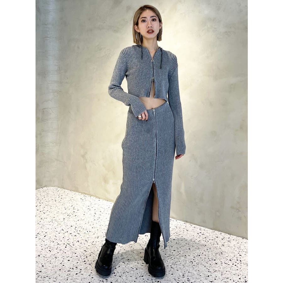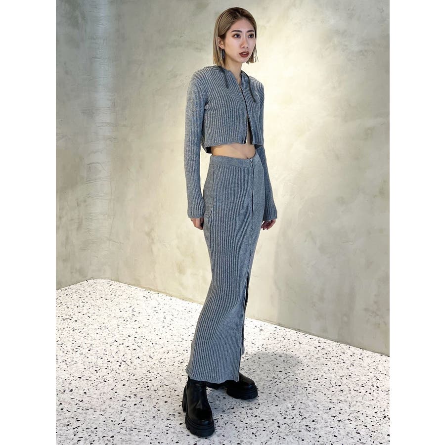 ニットパーカーはへそ上のショート丈でタイトなシルエットです。