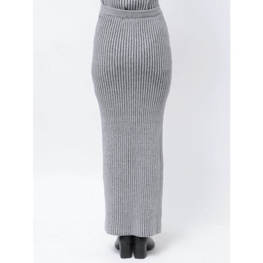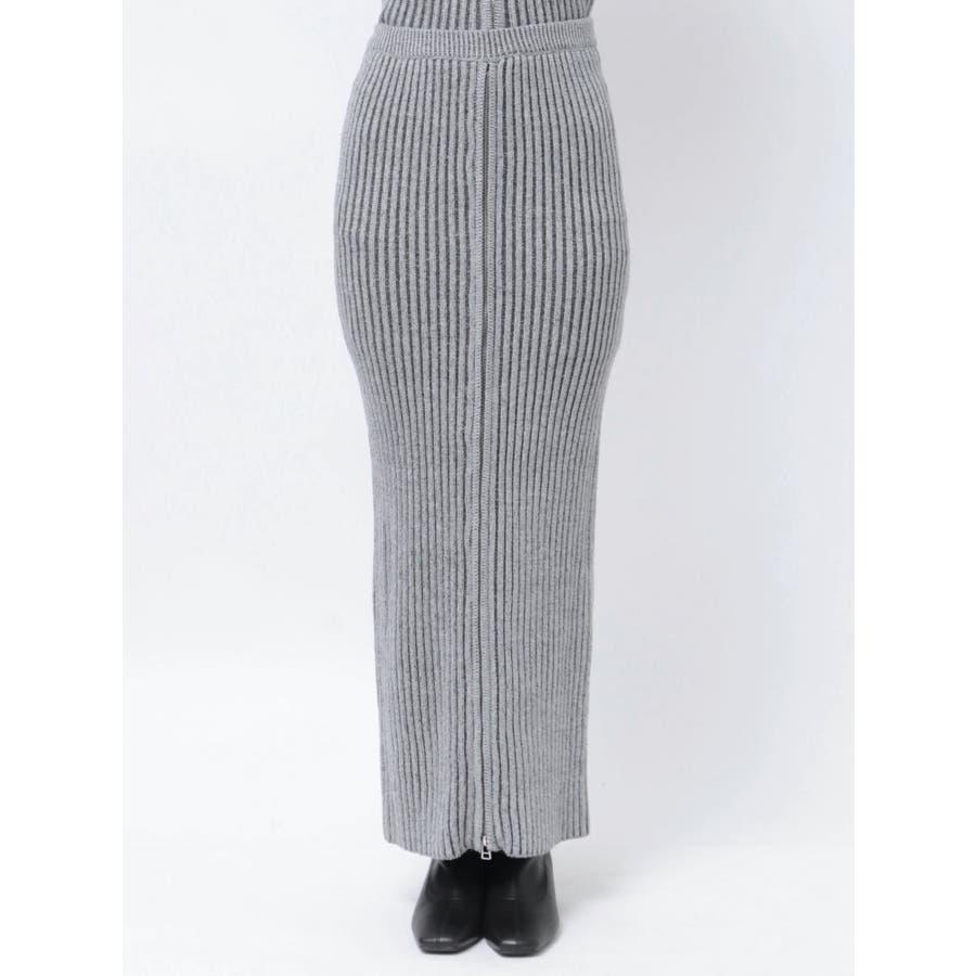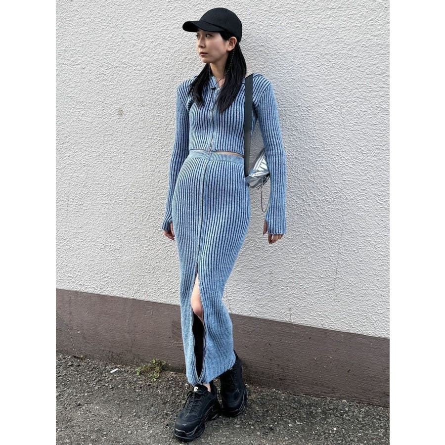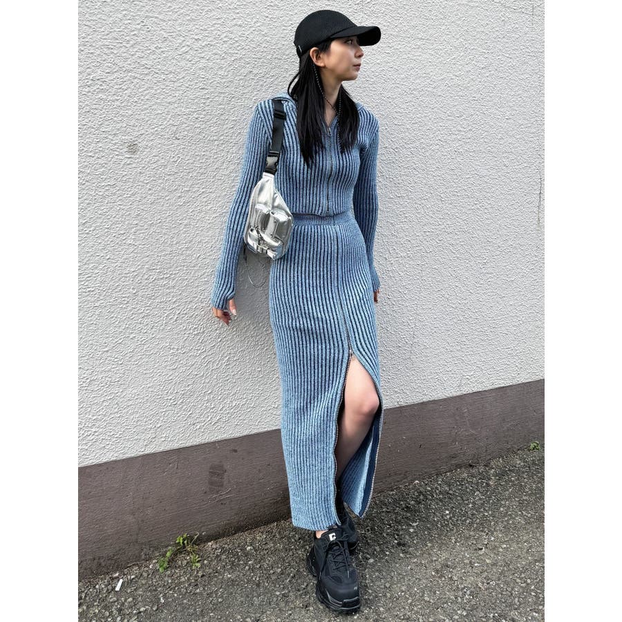 全体的にタイトなシルエットですがリブ編みのニット生地なので