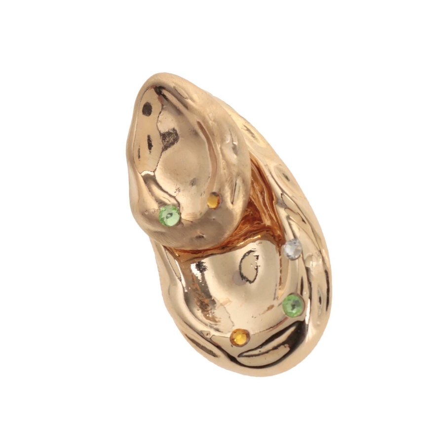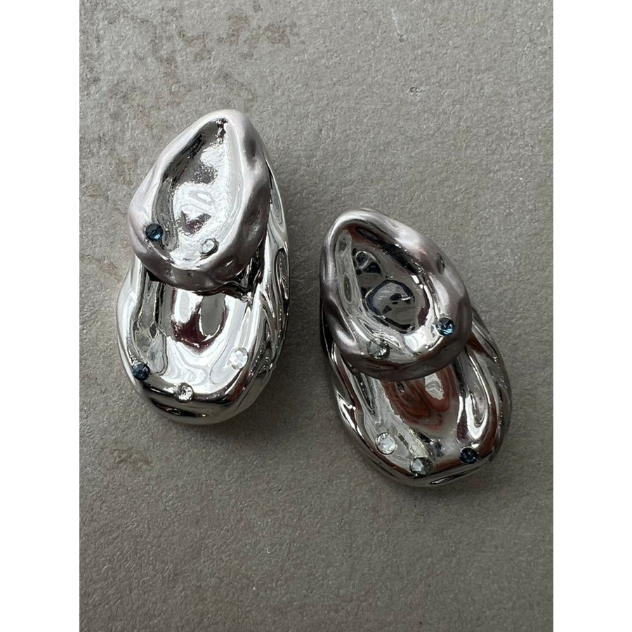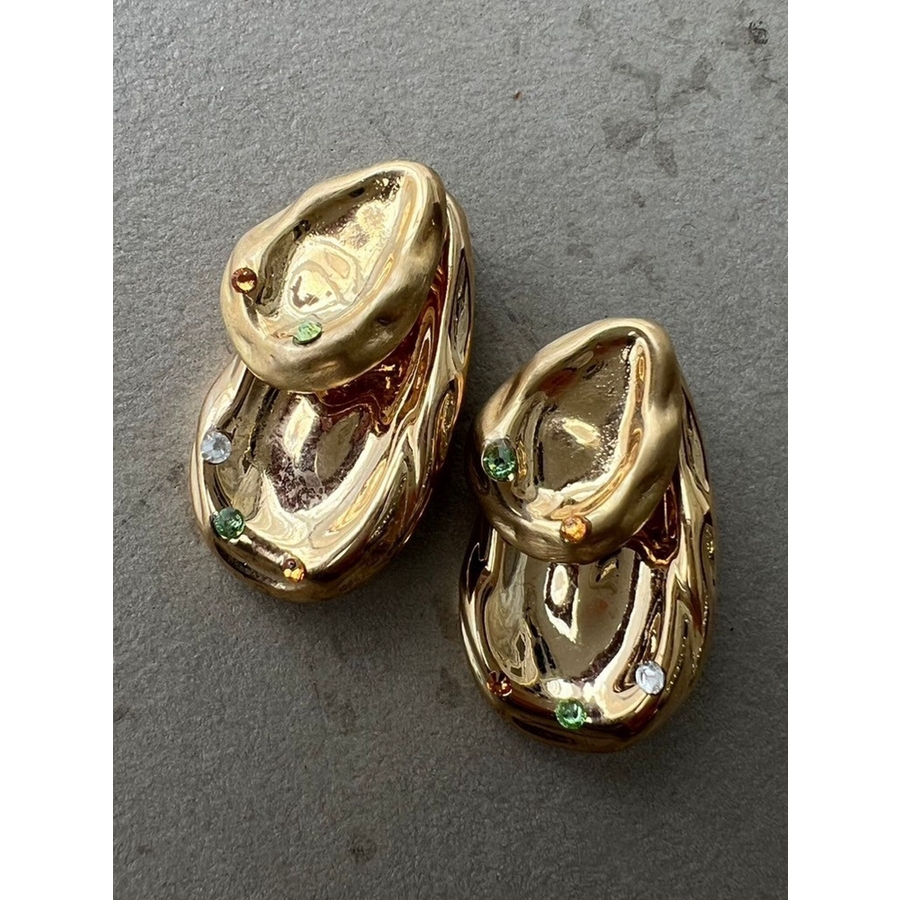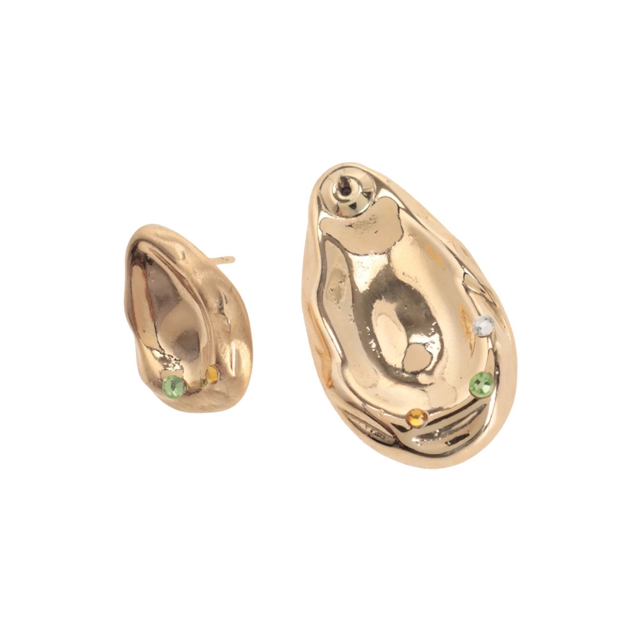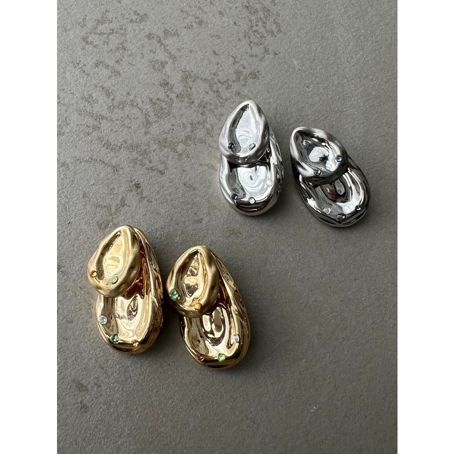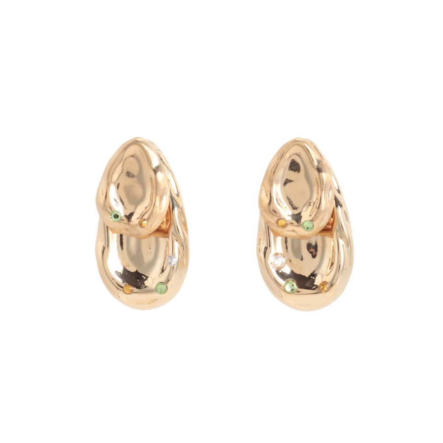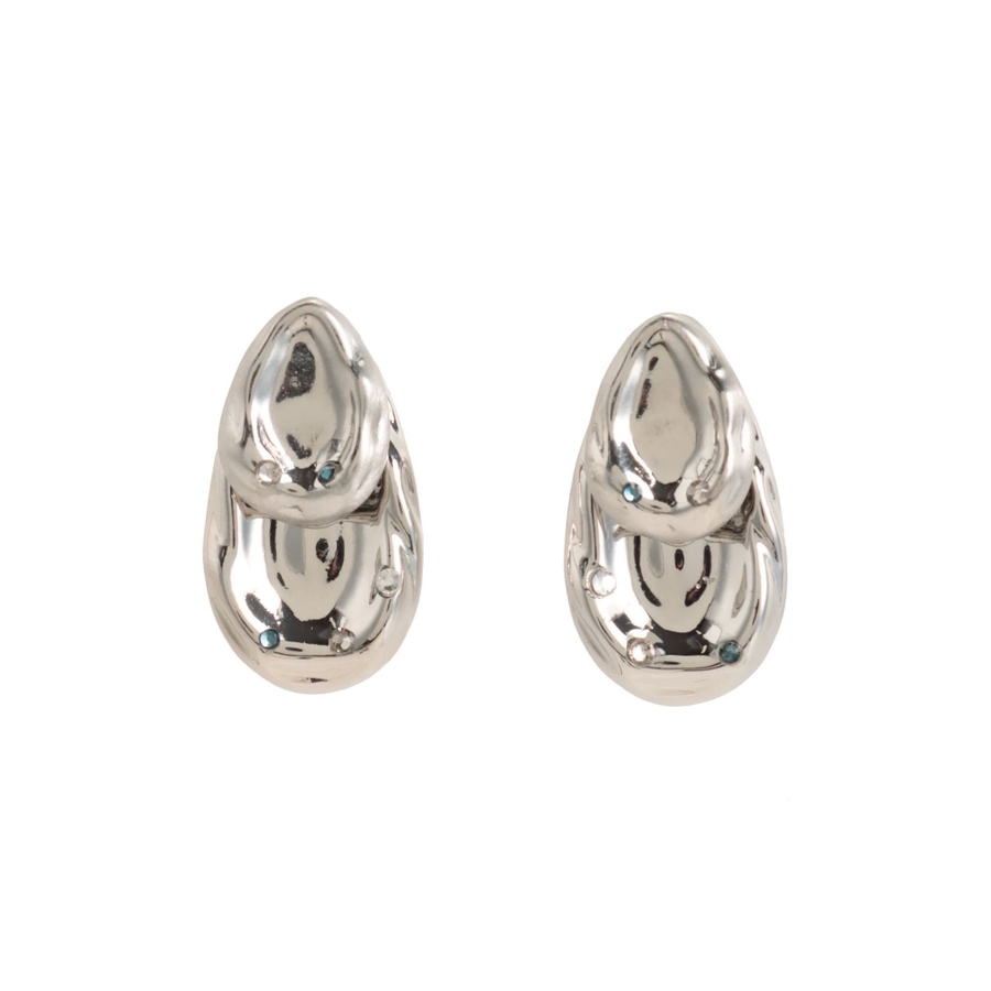 しずく型のぽってりとして重厚感が特徴のピアス中央がへこんだようなコンテンポラリーデザインにラインストーンをアクセントにプラス。ころんとした丸みのあるフォルムと遊び心のあるデザインです。シンプルながら耳元にアクセントをつけてくれ、付けるだけでモードでこなれた印象に。 ※着用画像はフラッシュの加減で実際の製品と色味等が異なる場合がございます。詳細画像をご参照ください。※ご利用の端末画面の設定により実際の商品と色味が異なる場合がございます。