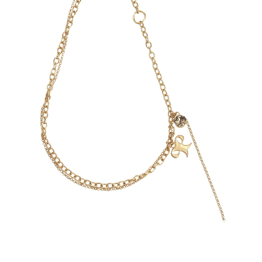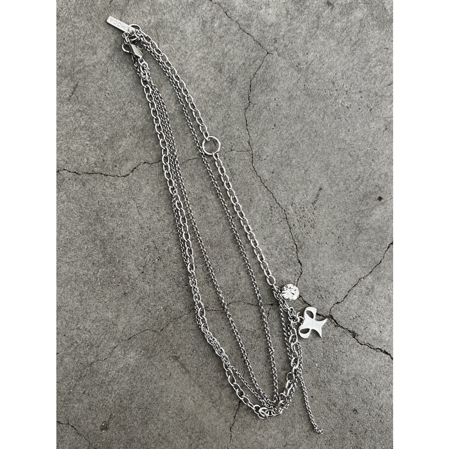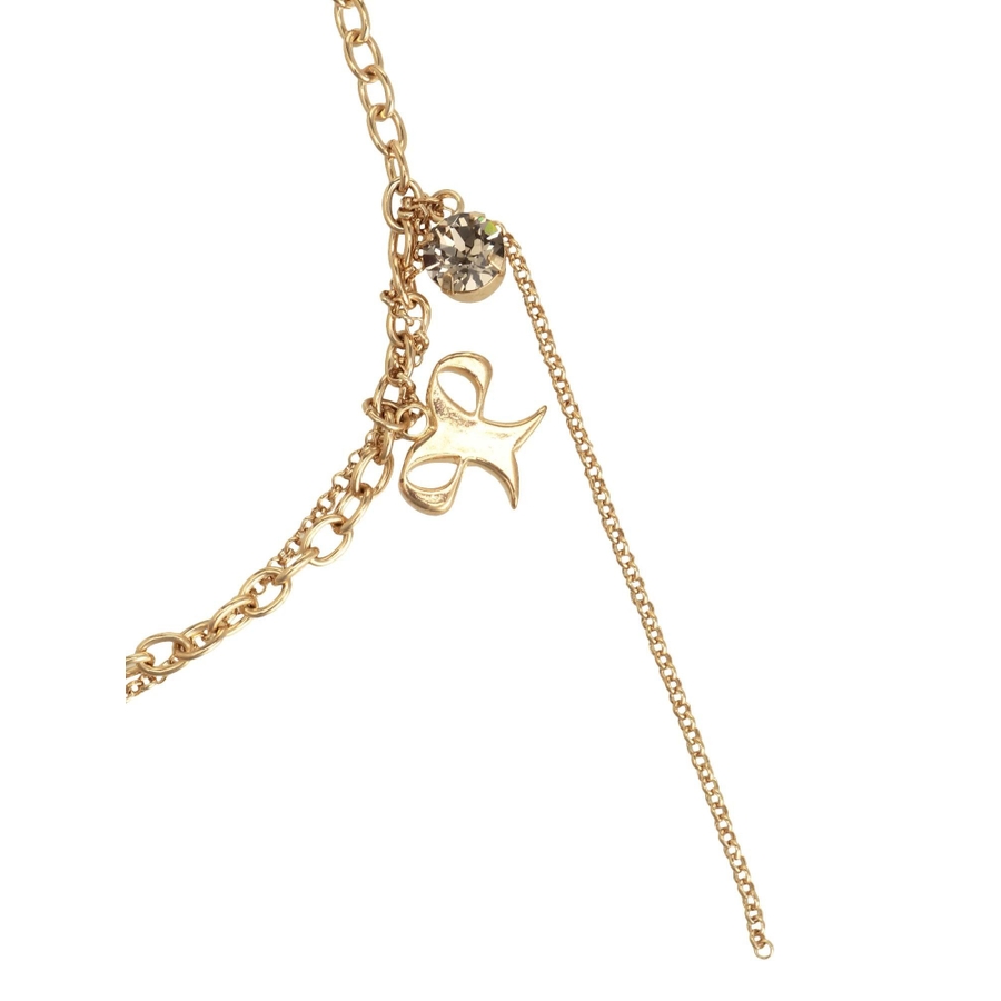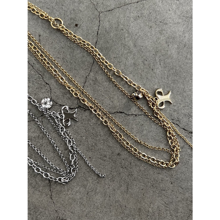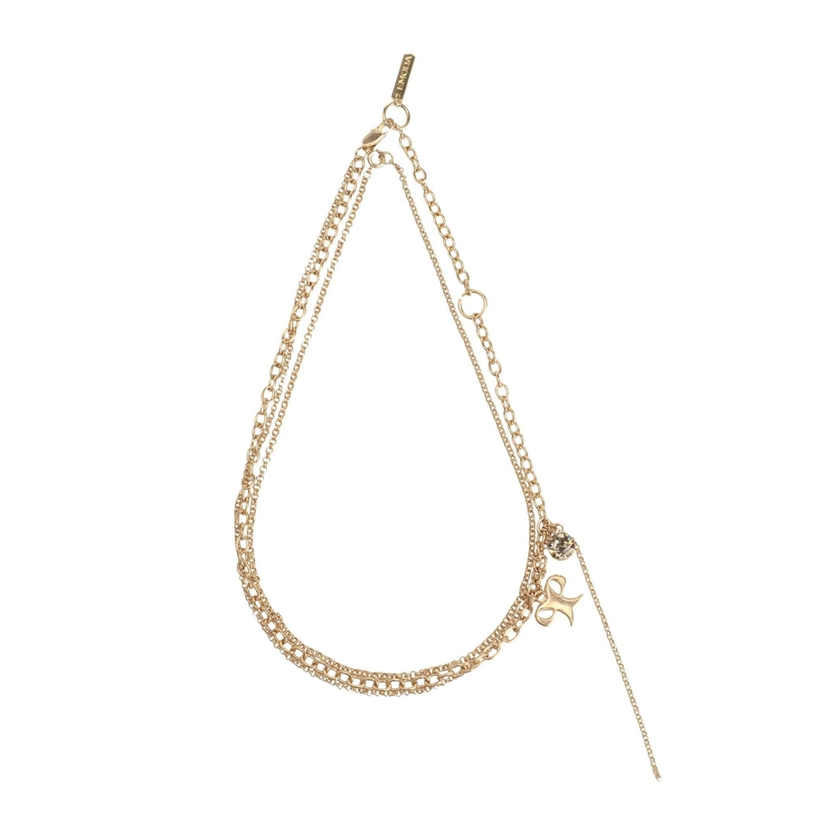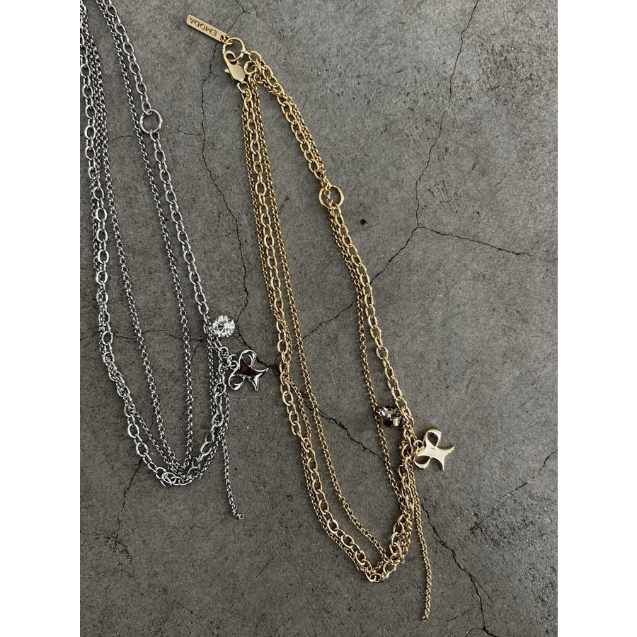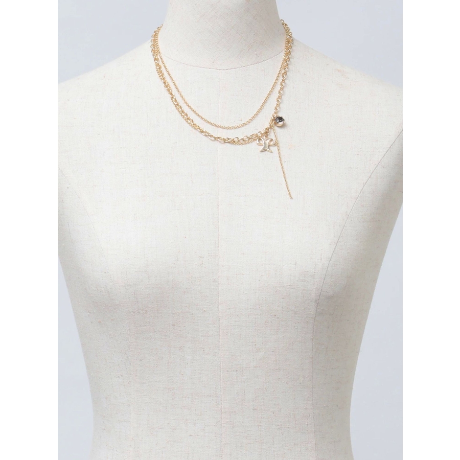 リボンモチーフとクリスタルが可愛らしいアクセント■デザイン2連のチェーンでそれぞれ単品使いができるので、お手持ちのネックレスと組み合わせることもできます。シンプルで気軽にコーディネートにプラスしやすいです。※着用画像はフラッシュの加減で実際の製品と色味等が異なる場合がございますので、生地のズームアップ画像をご確認ください。※ご利用の端末画面の設定により実際の商品と色味が異なる場合がございます。