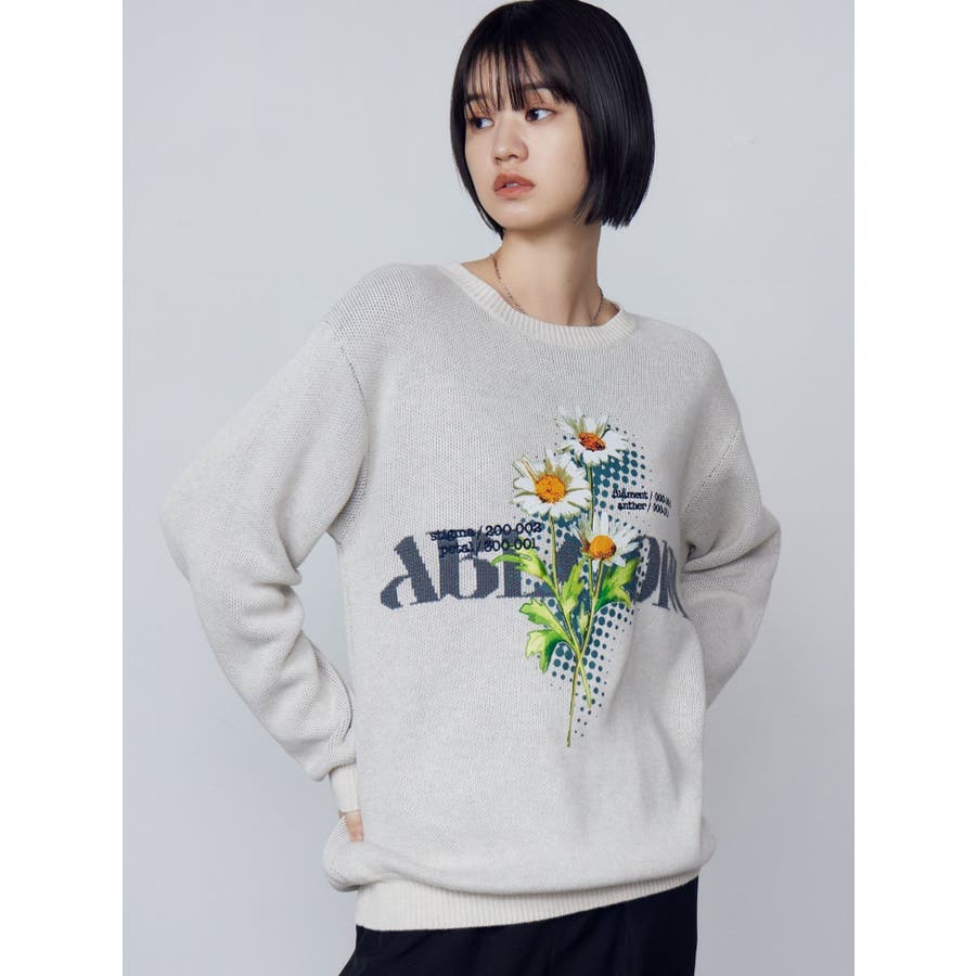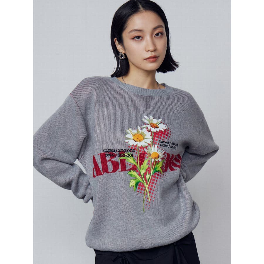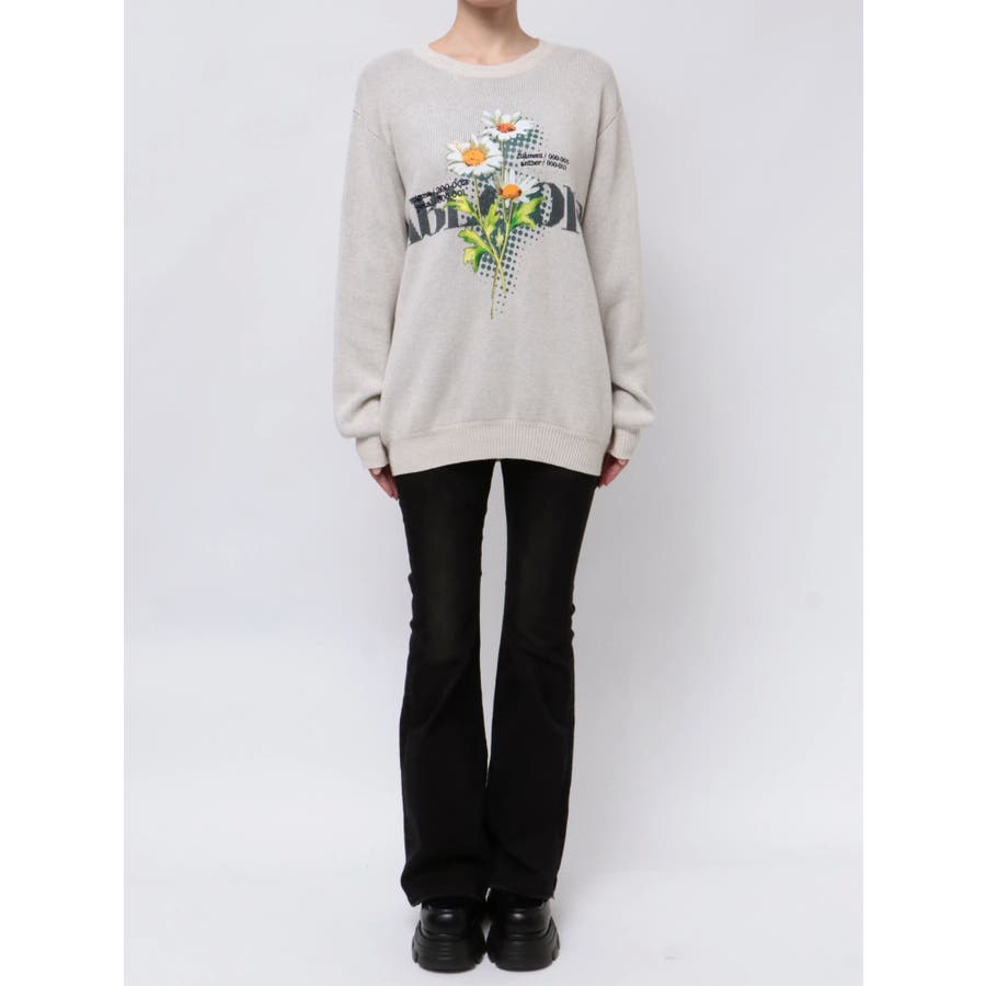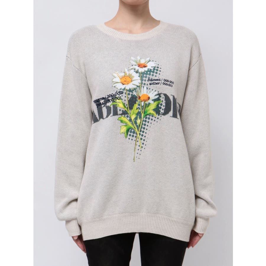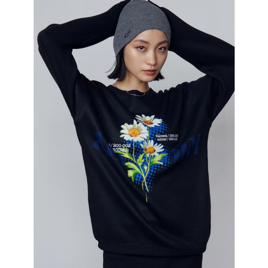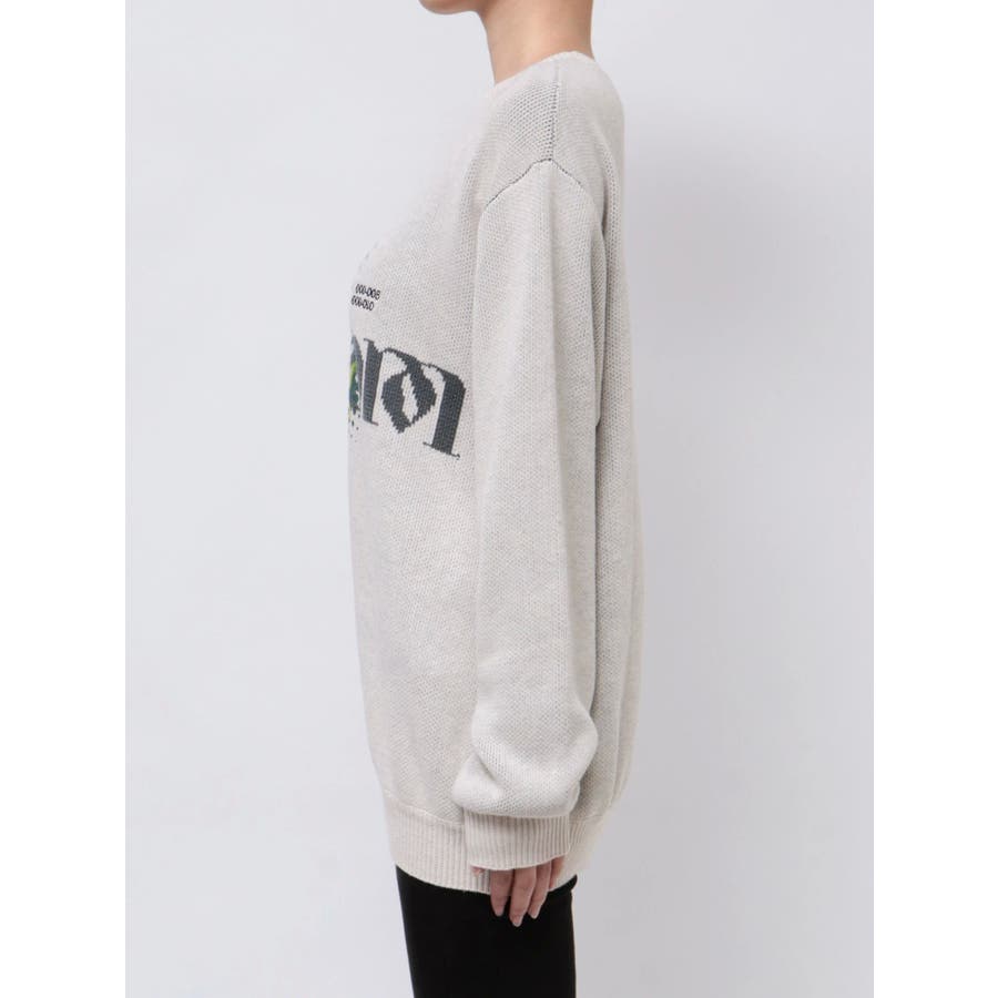 インパクト大!ルーズシルエットのニットトップス■デザインフロントに存在感のあるグラフィックをプリント。ジャガード・刺繍など細かいディテールをプラスしています。ボディはジャガード編みにする事によりしっかりとした厚みを持たせ、着た時に立体的なシルエットを出します。配色のカラーリングとグラフィックでインパクトのある一枚です。■スタイリングレイヤーベルトナイロンフレアパンツで合わせたルーズスタイリングから、ミニスカートを合わせたワンピース風の着こなしまで幅広く着用可能です。※着用画像はフラッシュの加減で実際の製品と色味等が異なる場合がございますので、生地のズームアップ画像をご確認ください。※ご利用の端末画面の設定により実際の商品と色味が異なる場合がございます。【商品特徴】透け感:なし伸縮性:なし生地の厚さ:普通サイズ感:ゆったり裏地:なしポケット:なし
