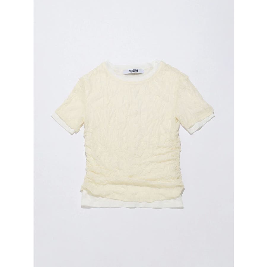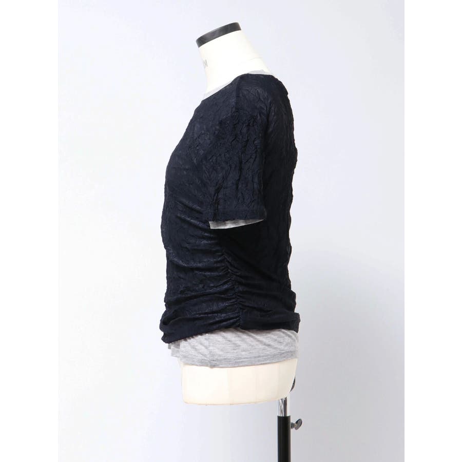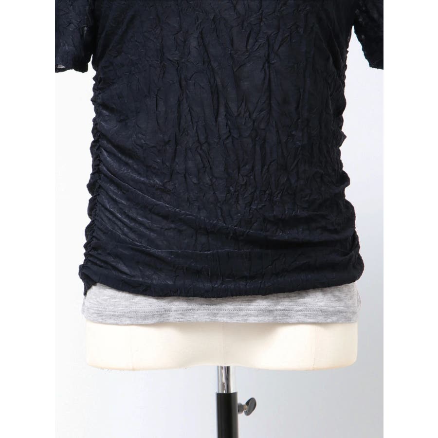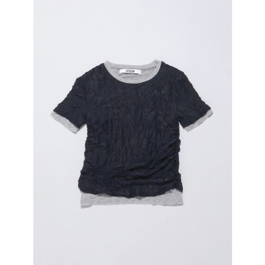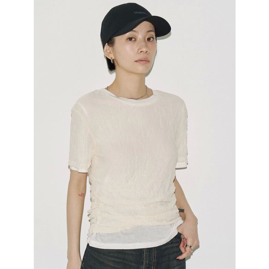 カットソー生地を二枚仕立てにしたレイヤード感のあるトップス■デザイン下の生地は薄手のソフト天竺を使用し、上の生地はシワ加工を入れたエスパンディ生地を使用しています。透け感のある柔らかな風合いが特徴です。サイドにギャザーを寄せているので自然なドレープ感が出ます。それぞれ配色も違い、雰囲気も変わるので様々な合わせで楽しんで頂けます。■スタイリングレイヤードデザインのトップスなので、ボトムはRIM WIDE JEANSのようなベーシックなデニムと合わせていただくのがおすすめです。※着用画像はフラッシュの加減で実際の製品と色味等が異なる場合がございますので、生地のズームアップ画像をご確認ください。※ご利用の端末画面の設定により実際の商品と色味が異なる場合がございます。【商品特徴】透け感:ややあり伸縮性:なし生地の厚さ:普通サイズ感:普通裏地:なしポケット:なし