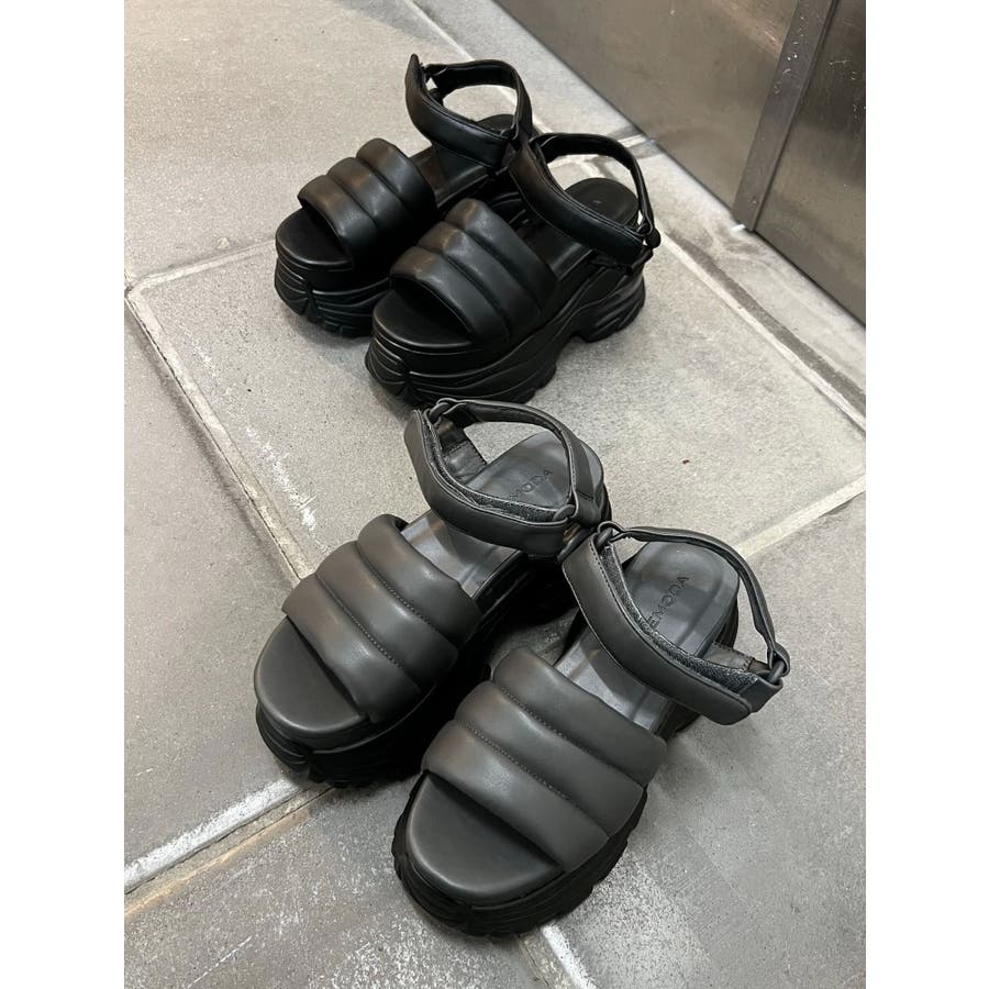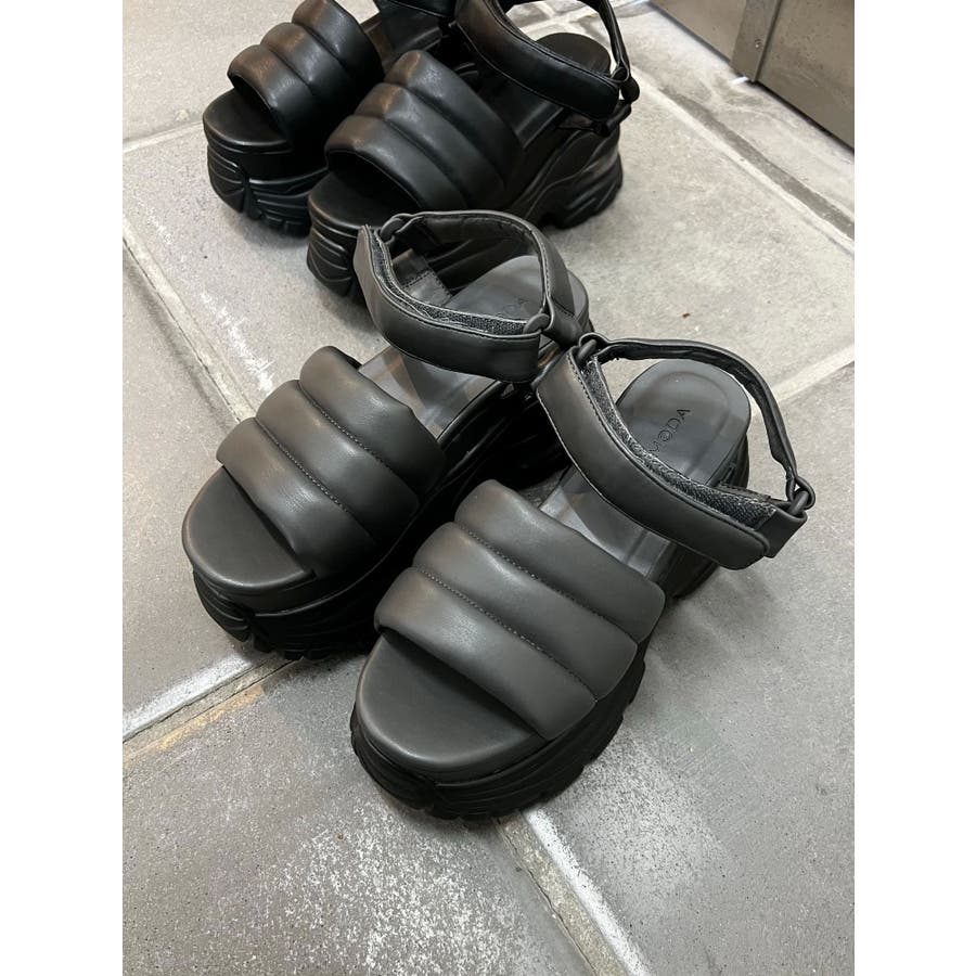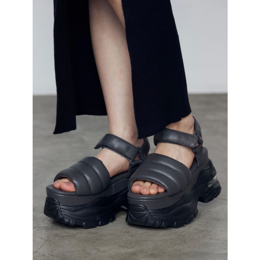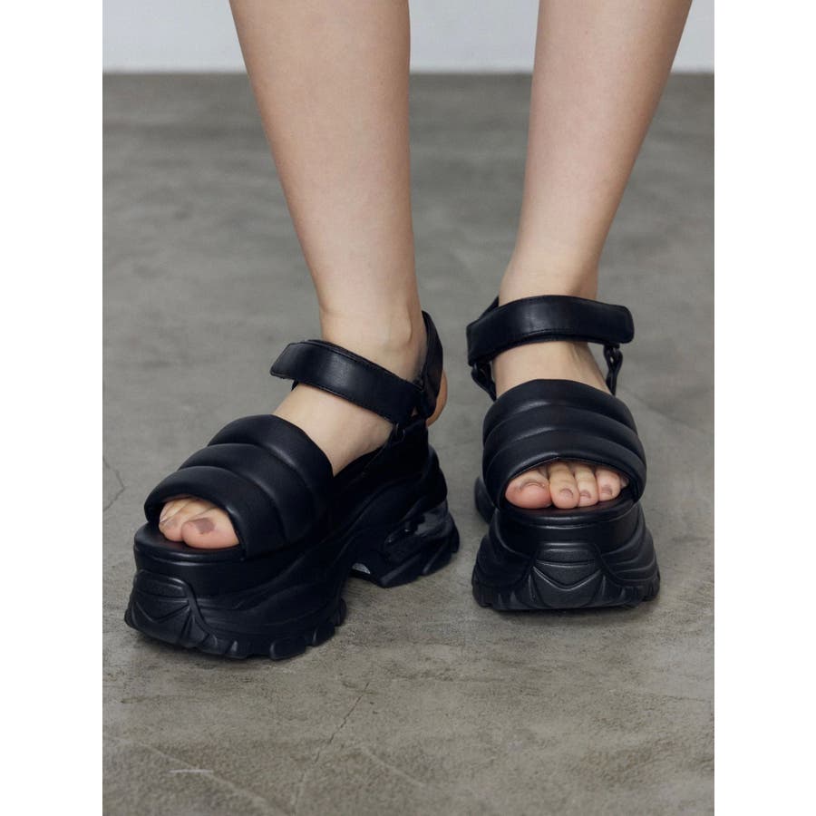 ぽってりとしたパッファーデザインのスポーツサンダル■デザインアッパーはパデッドデザインで存在感抜群な一足。クッション材が入っているので足を柔らかく包む、履き心地にこだわったデザイン。オリジナルで作成したソールを使用しておりトレンド感のあるサンダルです。マジックテープになっているので着脱もラクにして頂けます。■スタリングミニボトムを合わせサンダルをポイントにしたスタイリングから、フルレングスのボトムを合わせ、ソールをアクセントにしたスタイルまで、スタイリングに取り入れるだけでトレンド感のあるスポーティな雰囲気をプラスします。ボトムにかカジュアルなトラックパンツや、デニムを合わせたスタイリングがおすすめです。※着用画像はフラッシュの加減で実際の製品と色味等が異なる場合がございますので、生地のズームアップ画像をご確認ください。※ご利用の端末画面の設定により実際の商品と色味が異なる場合がございます。【スタッフ着用レビュー】 スタッフB(普段のサイズ: 24.5cm/足の幅: 9.8cm/甲の高さ: 5.6cm/ふくらはぎ周り:34cm) Lサイズ着用で丁度よかったです。足幅は少しゆとりがあり、クッション性があるので履き心地が良いです。