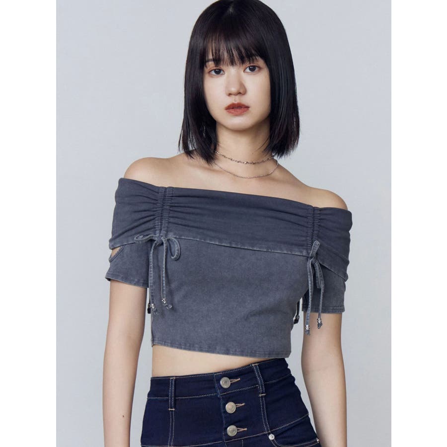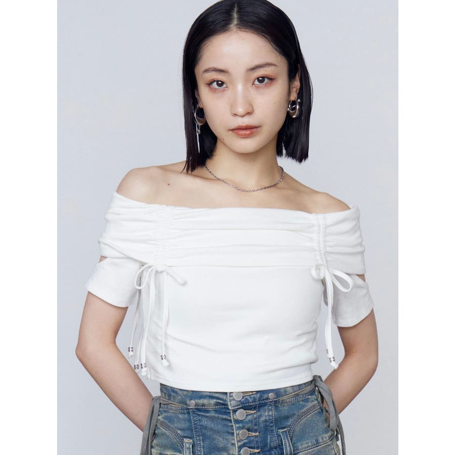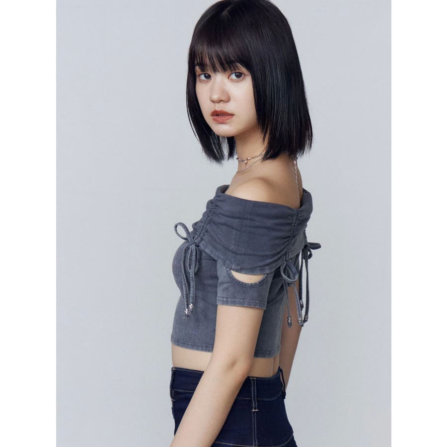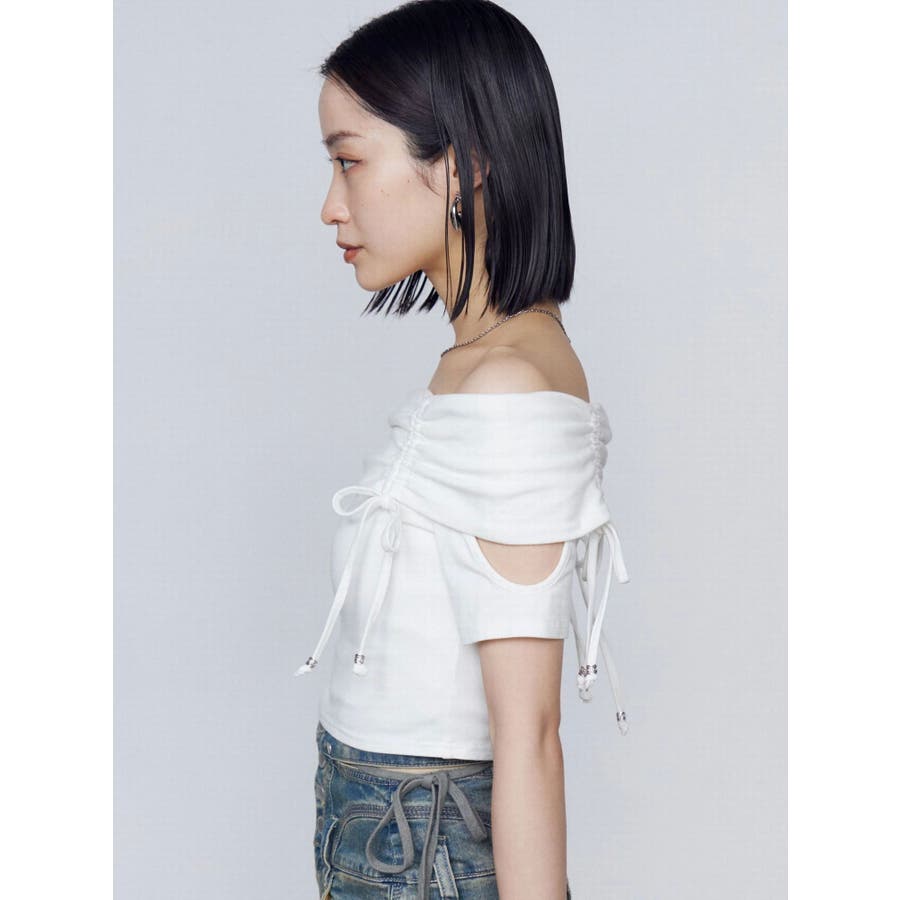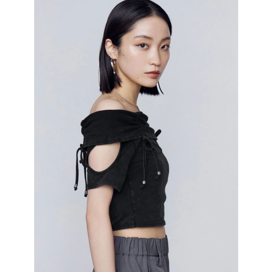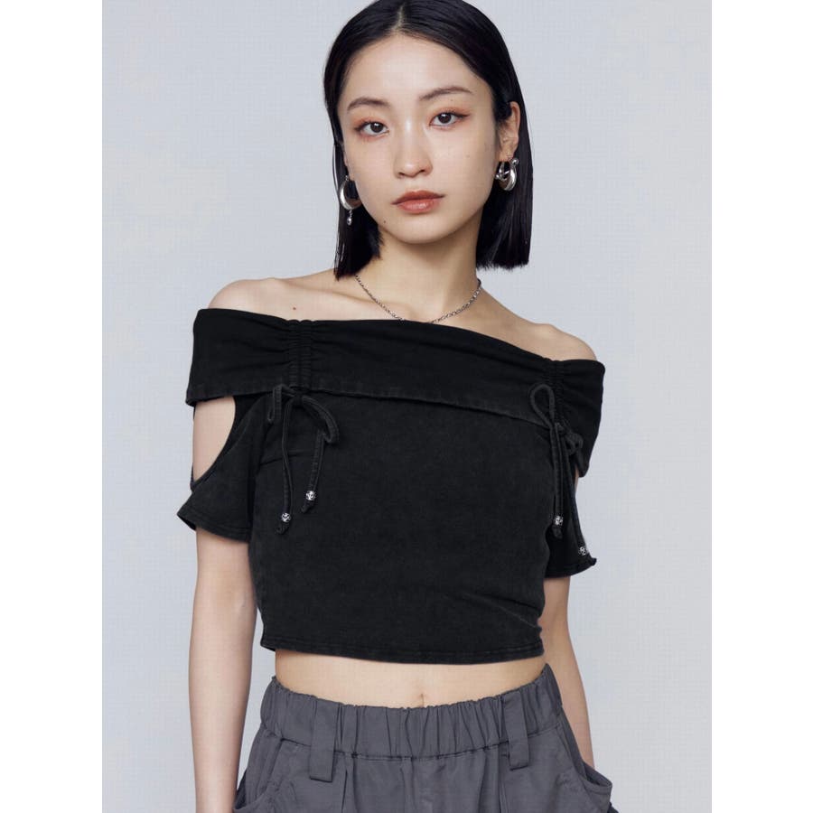 ギャザーを効かせたリボンデザインがポイントのオフショルダートップス■デザインオフショルから覗くカットアウト入りの袖はエッジ感を出してくれます。リボン先のシルバーパーツもアクセサリー感がプラスされ、スタイリングのポイントになってくれます。伸縮性のあるカットソー生地を使用しているので着心地も良く、肩回りなどはしっかりフィットしてくれます。ギャザーを絞ることでオフショルダー部分の幅の調整が可能。■スタイリングコンパクトなショートトップスは、ハイウエストボトムとの相性抜群。ハングレースアップハイウエストパギンスと合わせたスタイルアップコーデや、ボールドリップドルーズジーンズのようなルーズなシルエットのデニムパンツでトレンド感のあるバランスなど様々なスタイリングが楽しめます。サイドオープンルーズジーンズのようなエッジのあるデザインデニムと合わせていただくとより今季らしい印象になります。※着用画像はフラッシュの加減で実際の製品と色味等が異なる場合がございますので、生地のズームアップ画像をご確認ください。※ご利用の端末画面の設定により実際の商品と色味が異なる場合がございます。【商品特徴】透け感:なし伸縮性:あり生地の厚さ:普通サイズ感:細身裏地:なしポケット:なし