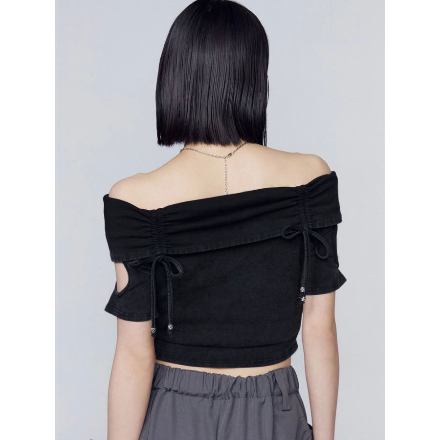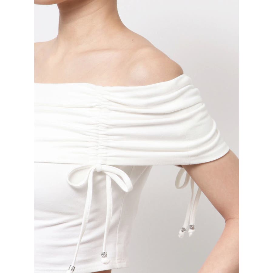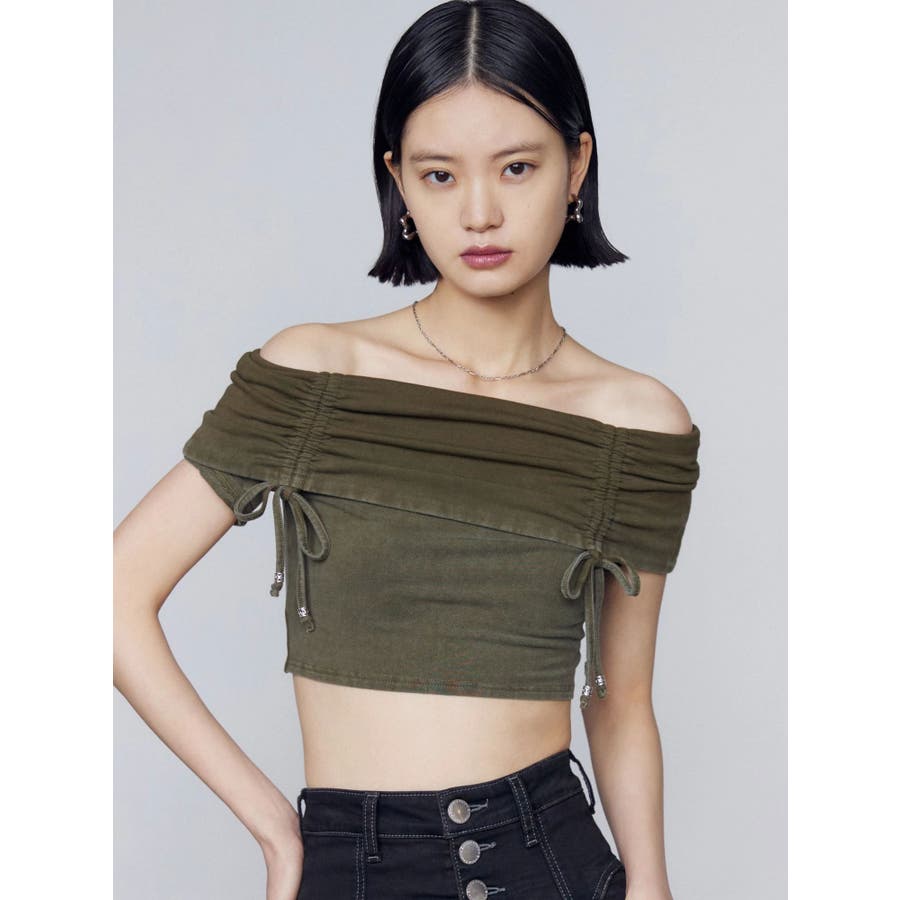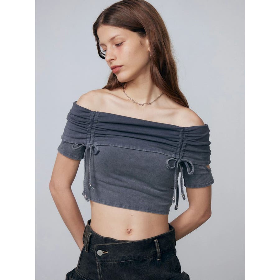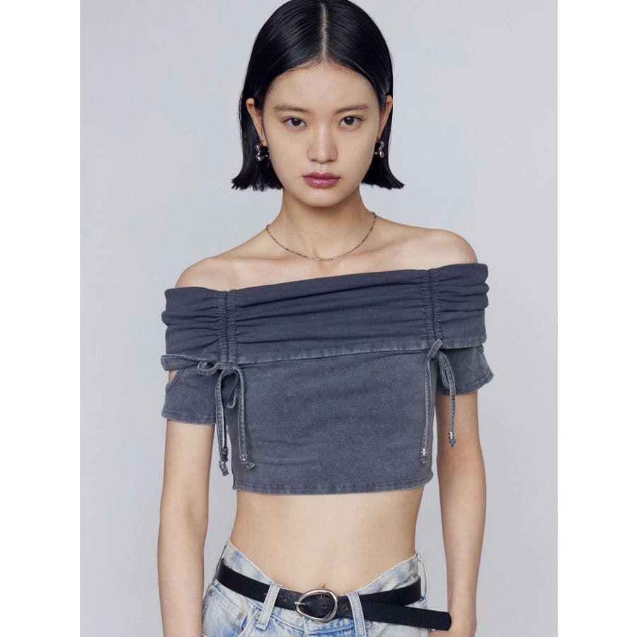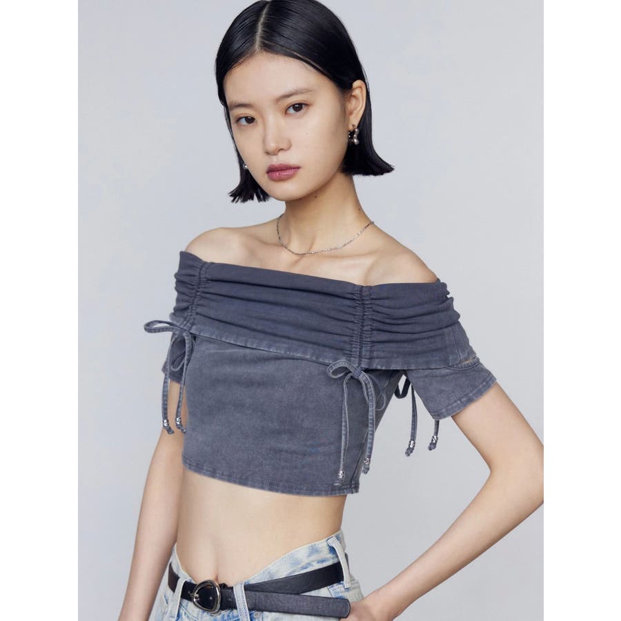 ギャザーを効かせたリボンデザインがポイントのオフショルダートップス■デザインオフショルから覗くカットアウト入りの袖はエッジ感を出してくれます。リボン先のシルバーパーツもアクセサリー感がプラスされ、スタイリングのポイントになってくれます。伸縮性のあるカットソー生地を使用しているので着心地も良く、肩回りなどはしっかりフィットしてくれます。ギャザーを絞ることでオフショルダー部分の幅の調整が可能。■スタイリングコンパクトなショートトップスは、ハイウエストボトムとの相性抜群。ハングレースアップハイウエストパギンスと合わせたスタイルアップコーデや、ボールドリップドルーズジーンズのようなルーズなシルエットのデニムパンツでトレンド感のあるバランスなど様々なスタイリングが楽しめます。サイドオープンルーズジーンズのようなエッジのあるデザインデニムと合わせていただくとより今季らしい印象になります。※着用画像はフラッシュの加減で実際の製品と色味等が異なる場合がございますので、生地のズームアップ画像をご確認ください。※ご利用の端末画面の設定により実際の商品と色味が異なる場合がございます。【商品特徴】透け感:なし伸縮性:あり生地の厚さ:普通サイズ感:細身裏地:なしポケット:なし