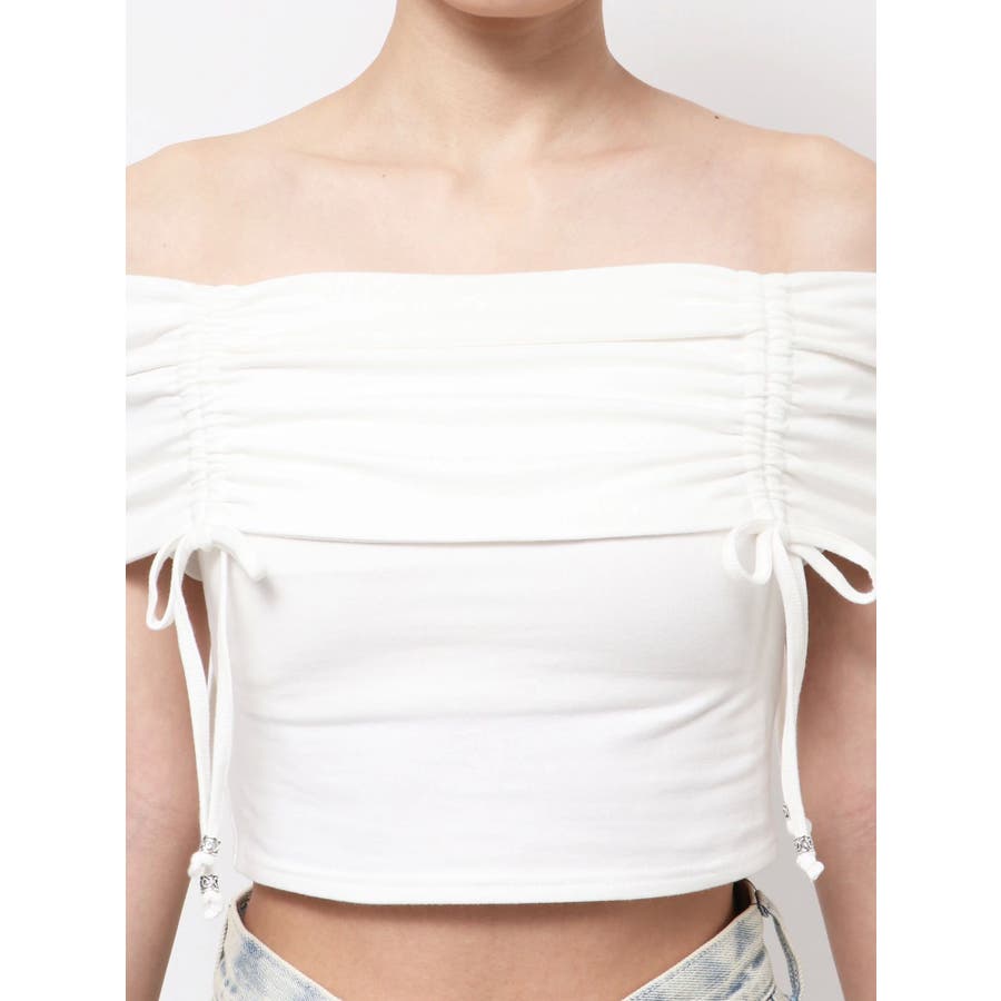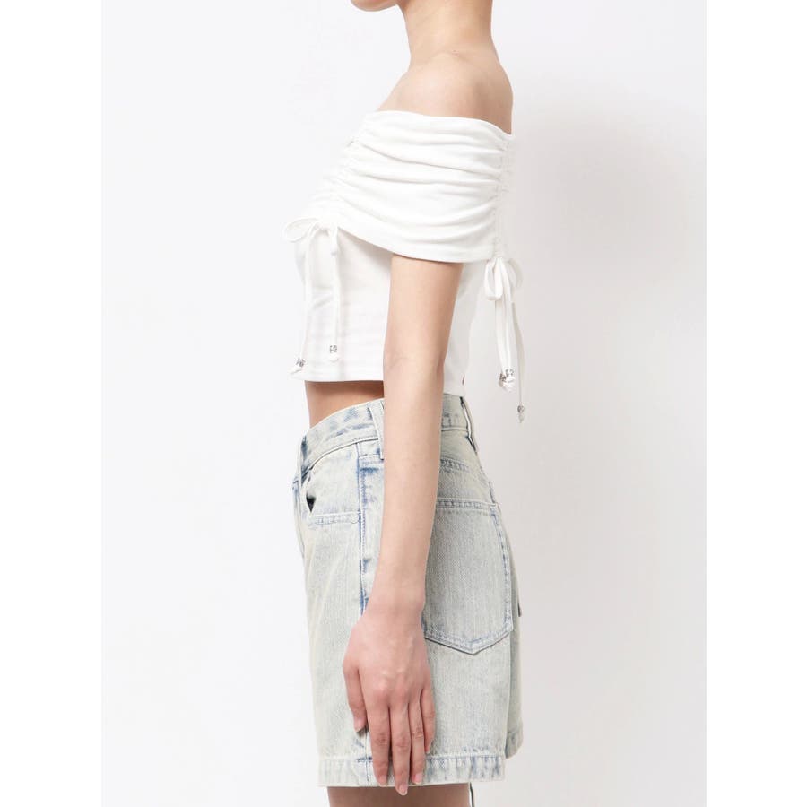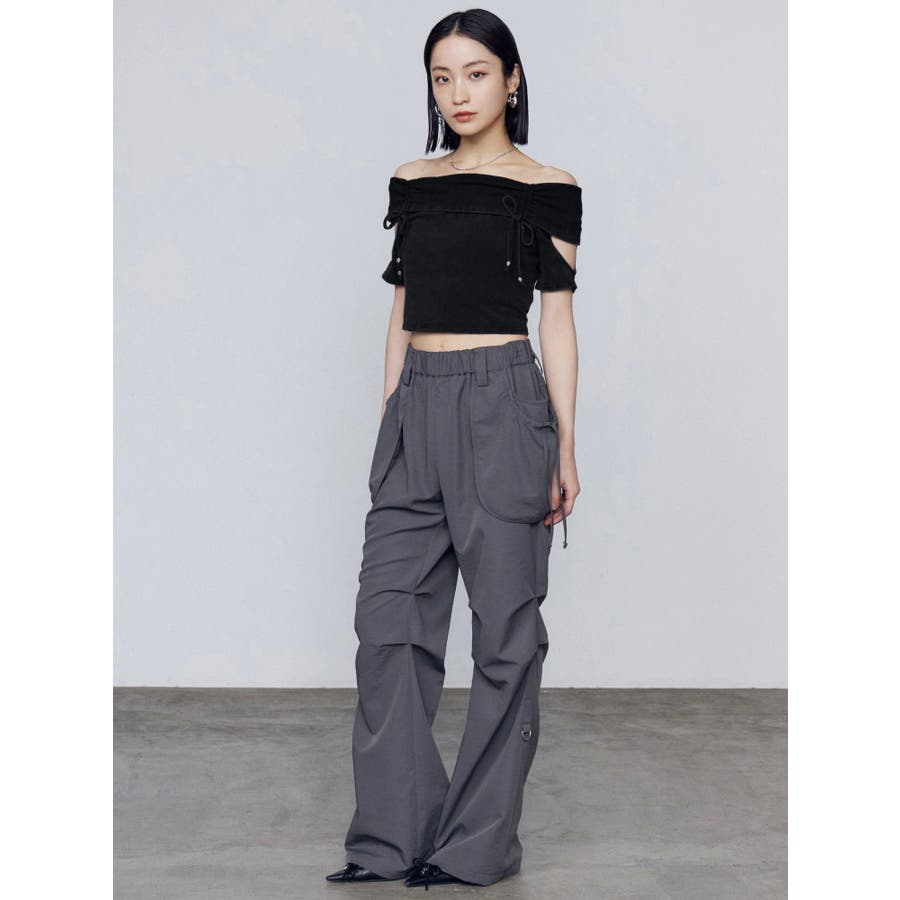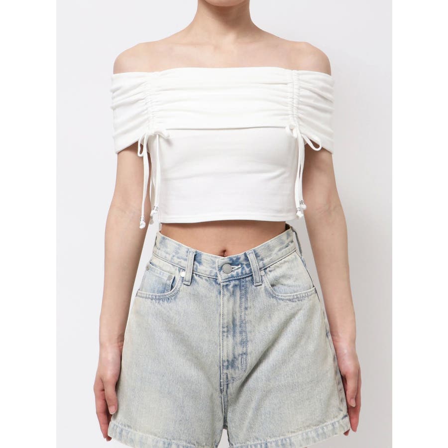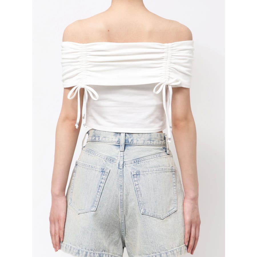 ギャザーを効かせたリボンデザインがポイントのオフショルダートップス■デザインオフショルから覗くカットアウト入りの袖はエッジ感を出してくれます。リボン先のシルバーパーツもアクセサリー感がプラスされ、スタイリングのポイントになってくれます。伸縮性のあるカットソー生地を使用しているので着心地も良く、肩回りなどはしっかりフィットしてくれます。ギャザーを絞ることでオフショルダー部分の幅の調整が可能。■スタイリングコンパクトなショートトップスは、ハイウエストボトムとの相性抜群。ハングレースアップハイウエストパギンスと合わせたスタイルアップコーデや、ボールドリップドルーズジーンズのようなルーズなシルエットのデニムパンツでトレンド感のあるバランスなど様々なスタイリングが楽しめます。サイドオープンルーズジーンズのようなエッジのあるデザインデニムと合わせていただくとより今季らしい印象になります。※着用画像はフラッシュの加減で実際の製品と色味等が異なる場合がございますので、生地のズームアップ画像をご確認ください。※ご利用の端末画面の設定により実際の商品と色味が異なる場合がございます。【商品特徴】透け感:なし伸縮性:あり生地の厚さ:普通サイズ感:細身裏地:なしポケット:なし