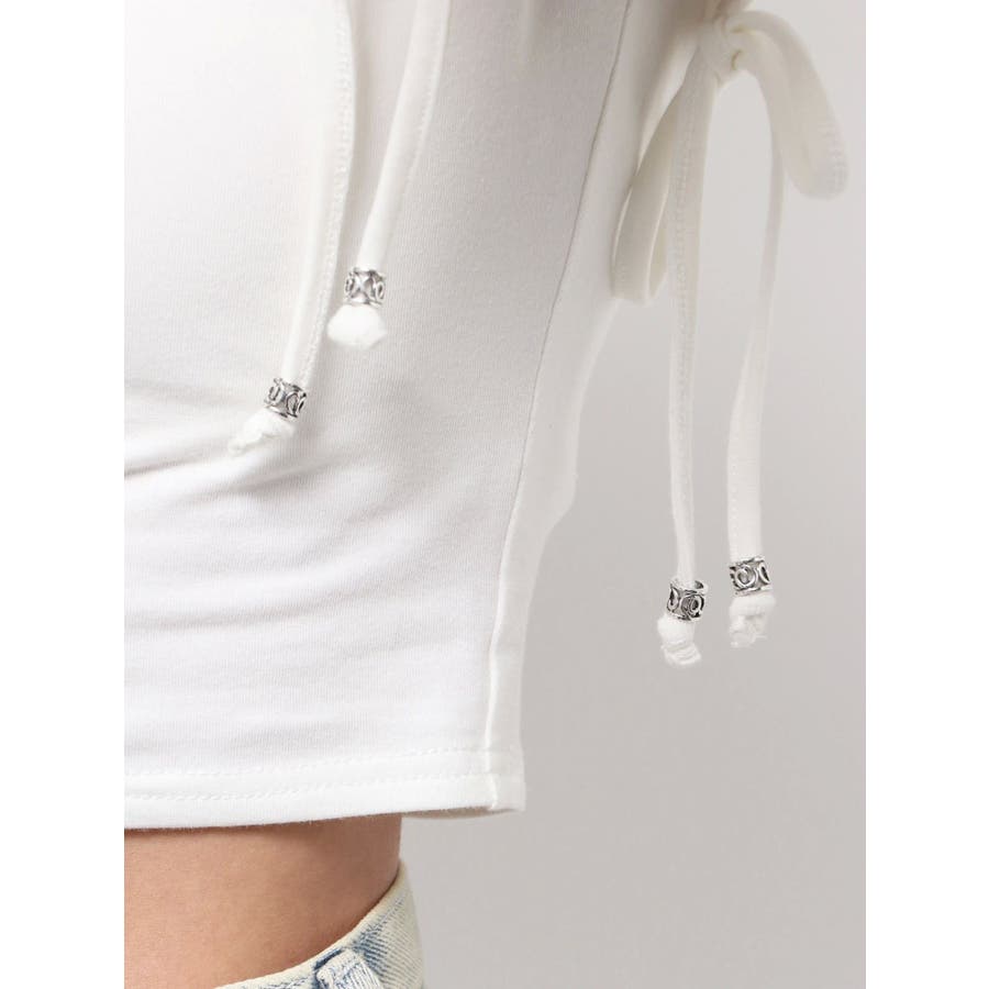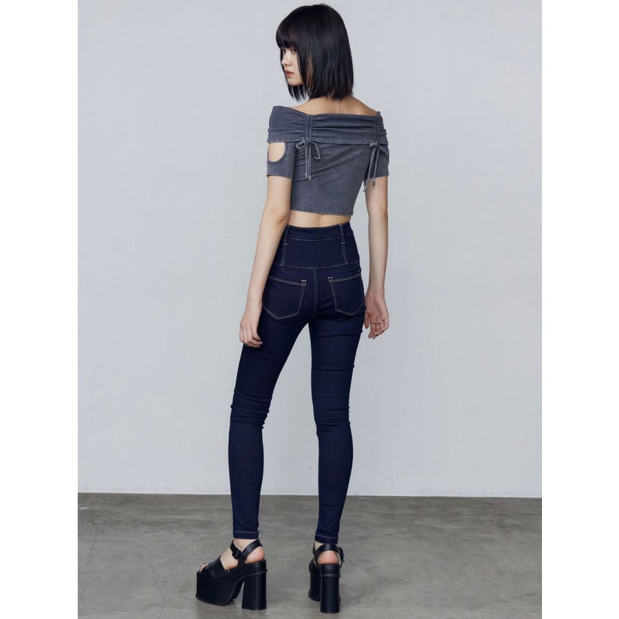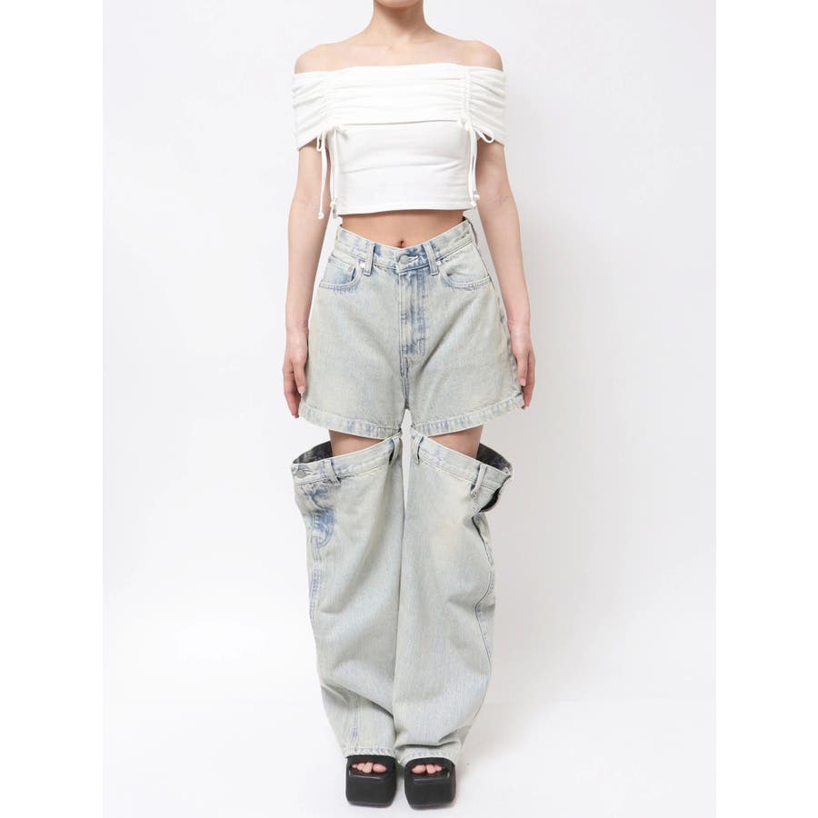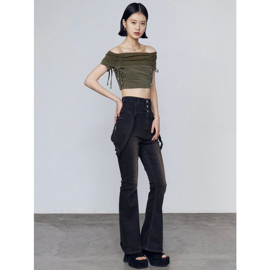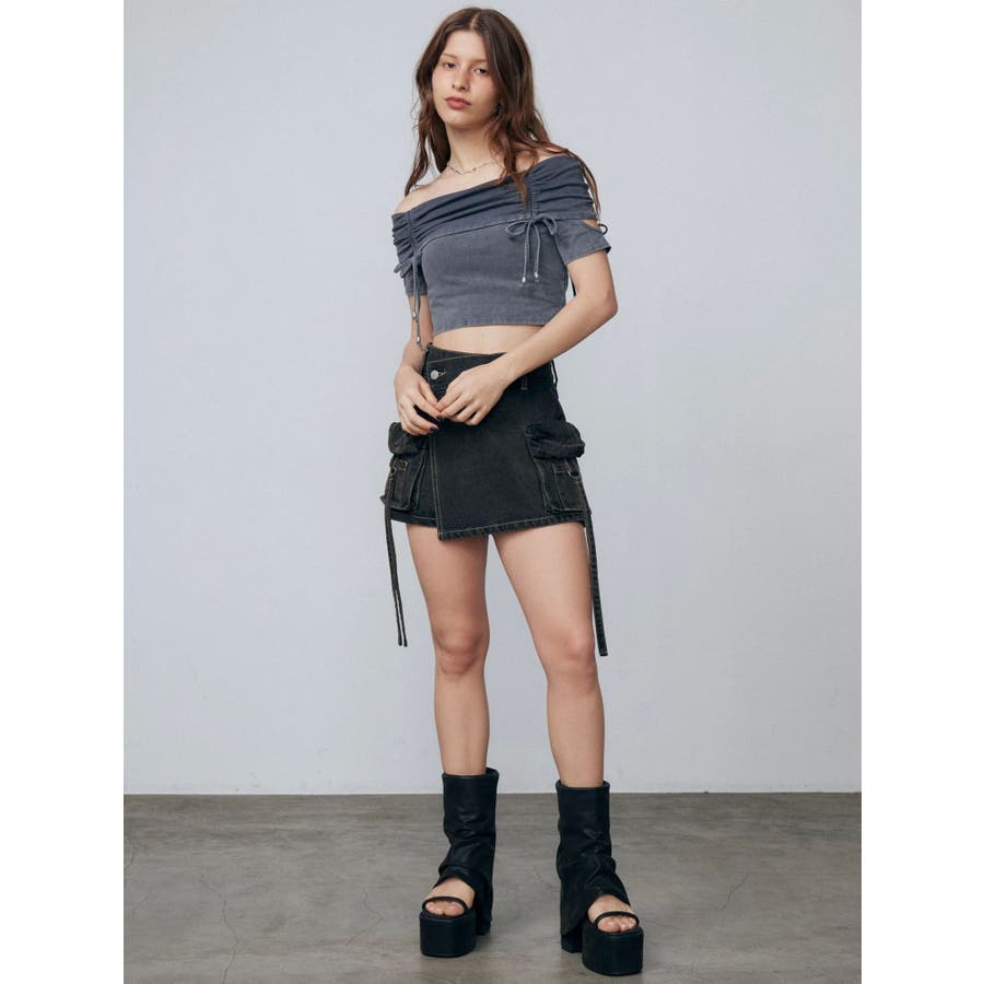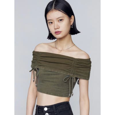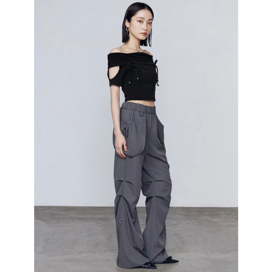 ギャザーを効かせたリボンデザインがポイントのオフショルダートップス■デザインオフショルから覗くカットアウト入りの袖はエッジ感を出してくれます。リボン先のシルバーパーツもアクセサリー感がプラスされ、スタイリングのポイントになってくれます。伸縮性のあるカットソー生地を使用しているので着心地も良く、肩回りなどはしっかりフィットしてくれます。ギャザーを絞ることでオフショルダー部分の幅の調整が可能。■スタイリングコンパクトなショートトップスは、ハイウエストボトムとの相性抜群。ハングレースアップハイウエストパギンスと合わせたスタイルアップコーデや、ボールドリップドルーズジーンズのようなルーズなシルエットのデニムパンツでトレンド感のあるバランスなど様々なスタイリングが楽しめます。サイドオープンルーズジーンズのようなエッジのあるデザインデニムと合わせていただくとより今季らしい印象になります。※着用画像はフラッシュの加減で実際の製品と色味等が異なる場合がございますので、生地のズームアップ画像をご確認ください。※ご利用の端末画面の設定により実際の商品と色味が異なる場合がございます。【商品特徴】透け感:なし伸縮性:あり生地の厚さ:普通サイズ感:細身裏地:なしポケット:なし