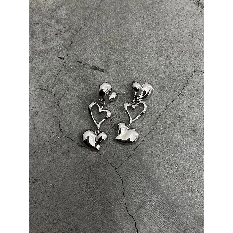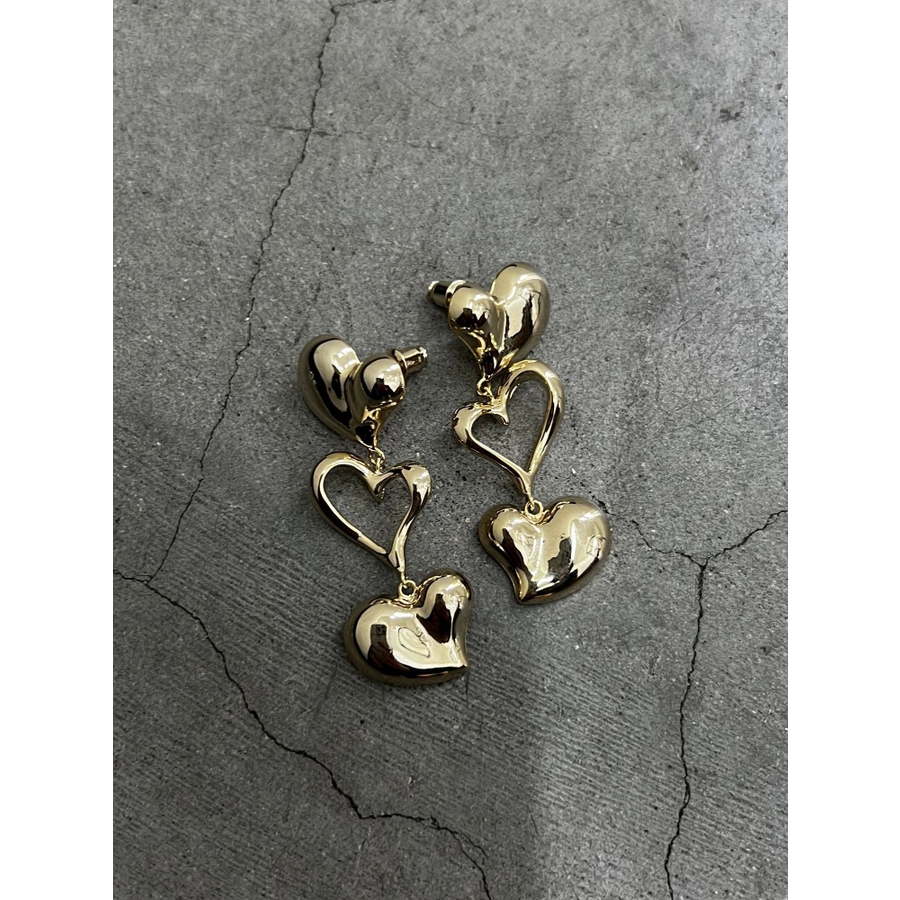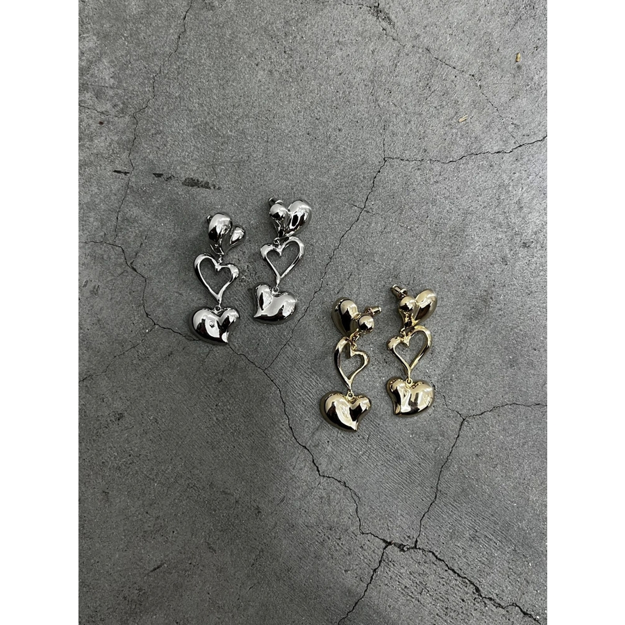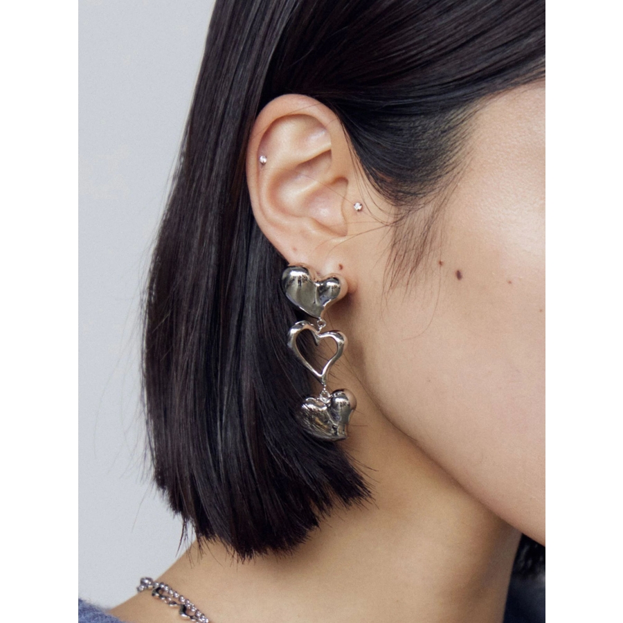 ハートが三つ連なったピアス■デザイン存在感がありコーデのアクセントになります。丸みがありながらも一癖ある形のハート型が、甘くなりすぎずモードな雰囲気を演出。大ぶりで重厚感がある見た目ですが、軽いのでストレスフリーにお使いいただけます。※着用画像はフラッシュの加減で実際の製品と色味等が異なる場合がございますので、生地のズームアップ画像をご確認ください。 ※ご利用の端末画面の設定により実際の商品と色味が異なる場合がございます。