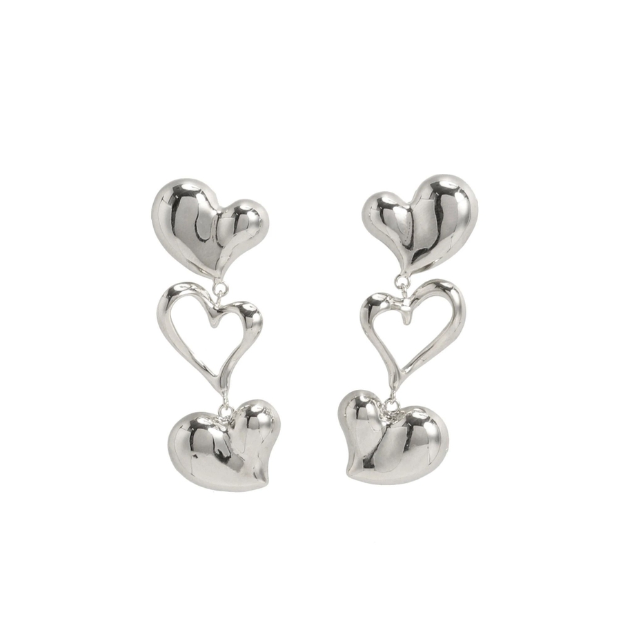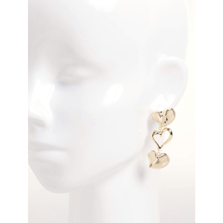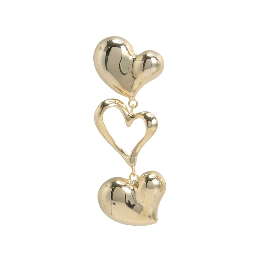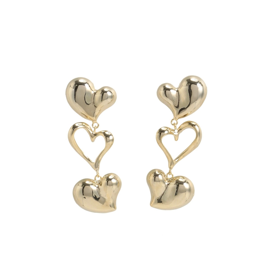 ハートが三つ連なったピアス■デザイン存在感がありコーデのアクセントになります。丸みがありながらも一癖ある形のハート型が、甘くなりすぎずモードな雰囲気を演出。大ぶりで重厚感がある見た目ですが、軽いのでストレスフリーにお使いいただけます。※着用画像はフラッシュの加減で実際の製品と色味等が異なる場合がございますので、生地のズームアップ画像をご確認ください。 ※ご利用の端末画面の設定により実際の商品と色味が異なる場合がございます。