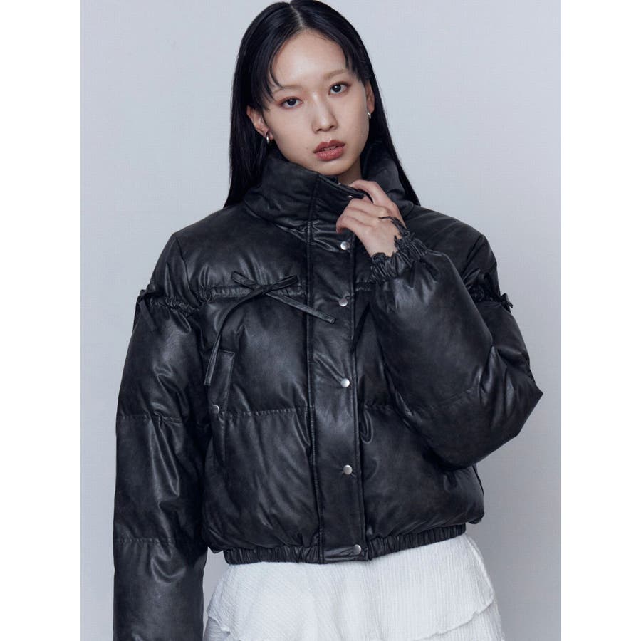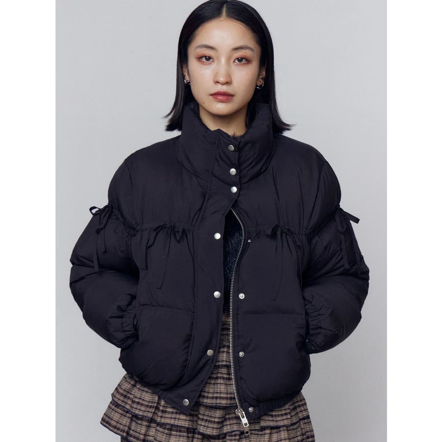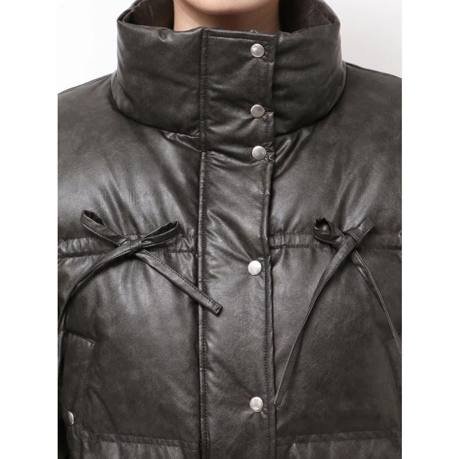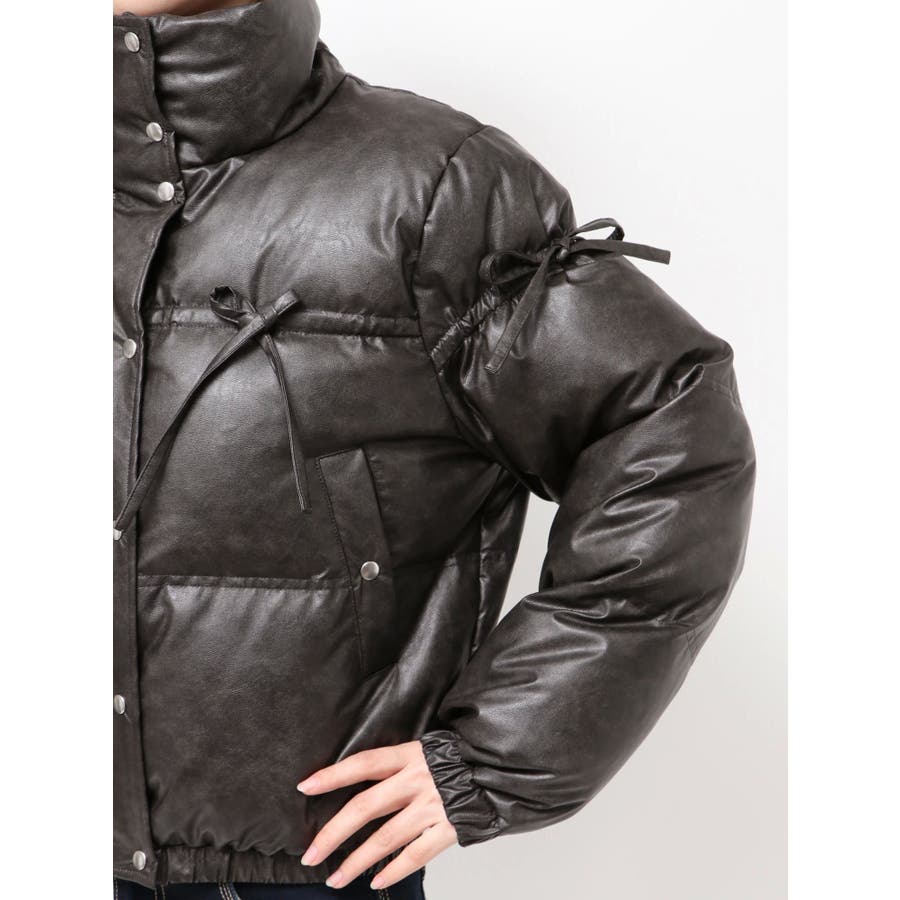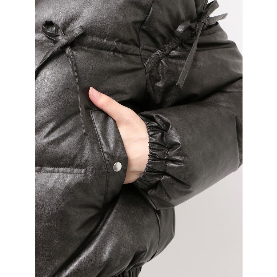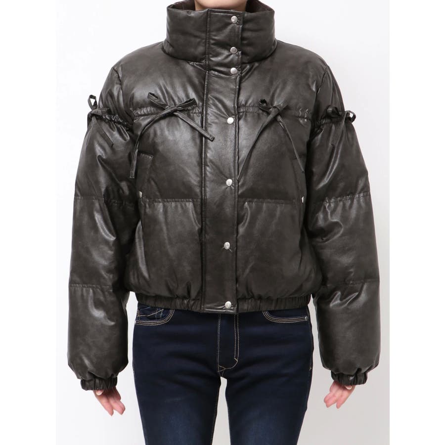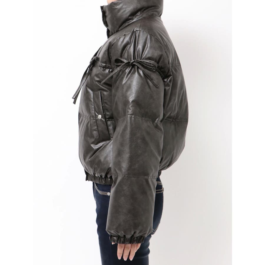 リボンストリングがポイントのダウンブルゾン■デザインリボンは絞ることが出来るので少しギャザーを加えたバランスで着用するのがおすすめです。シルキーな風合いのナイロン素材と、柔らかい風合いのフェイクレザーの展開になります。ダウンならではのボリュームと程よい丸みのあるシルエットが特徴です。ハイネックなので、防寒効果も抜群。■スタイリング骨盤にかかる位の丈なので、ボトムはミニ丈からフルレングスまで幅広く合わせていただけます。今季はティアードショートパンツと合わせるスタイリングがイチオシです。※着用画像はフラッシュの加減で実際の製品と色味等が異なる場合がございますので、生地のズームアップ画像をご確認ください。※ご利用の端末画面の設定により実際の商品と色味が異なる場合がございます。【商品特徴】透け感:なし伸縮性:なし生地の厚さ:普通サイズ感:普通裏地:なしポケット:あり
