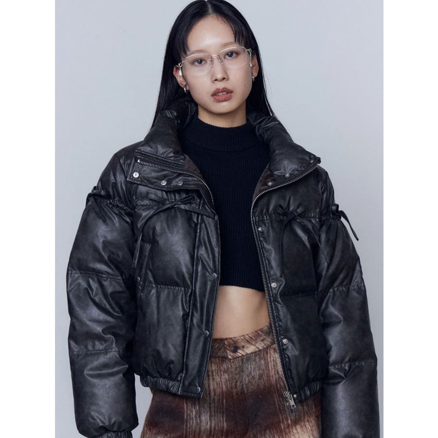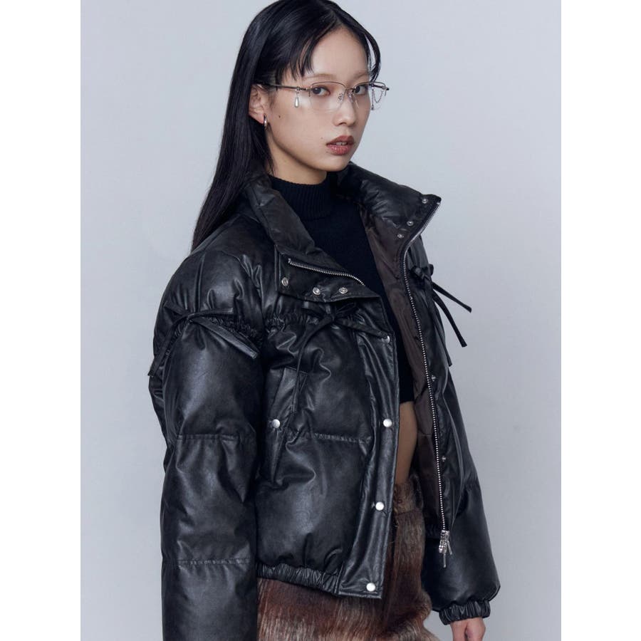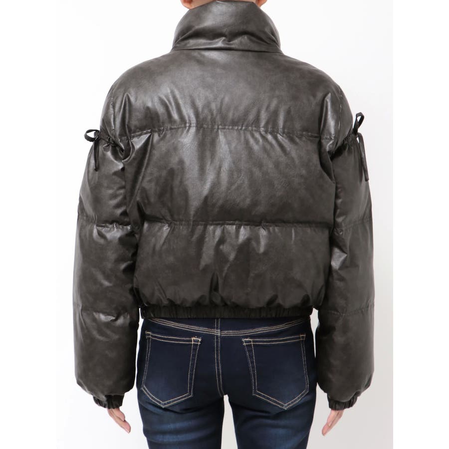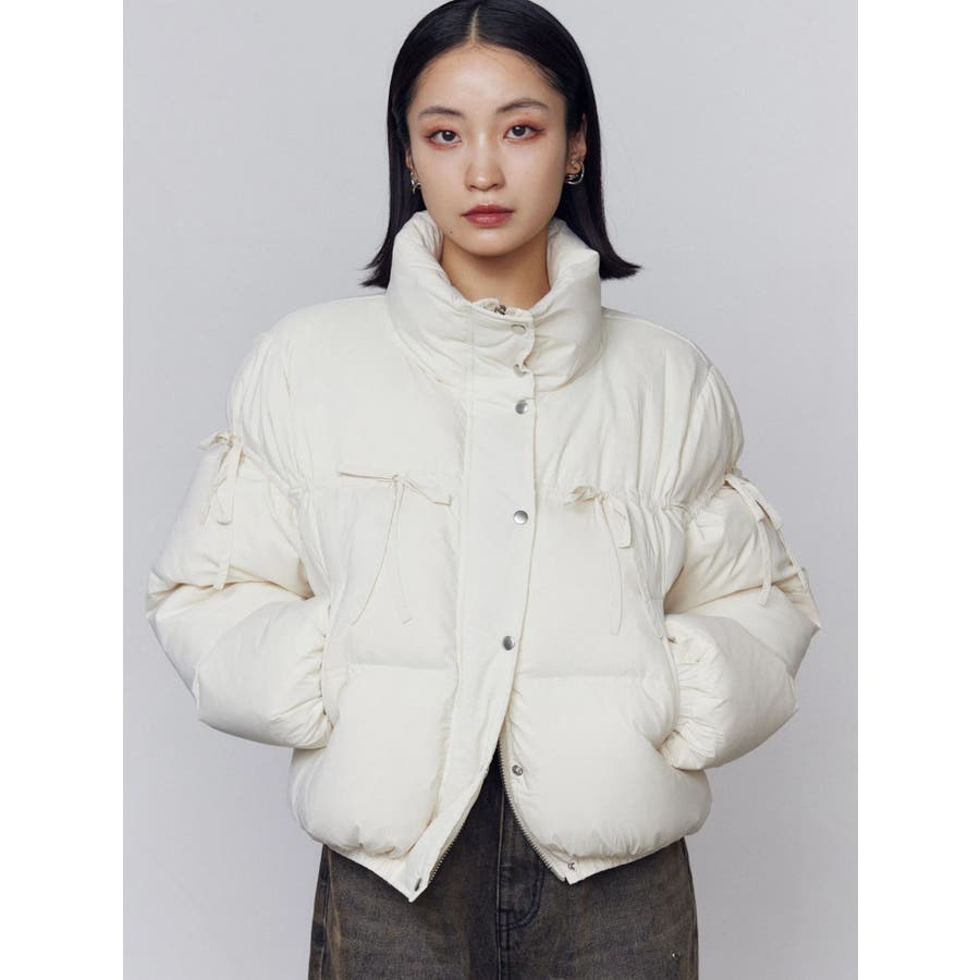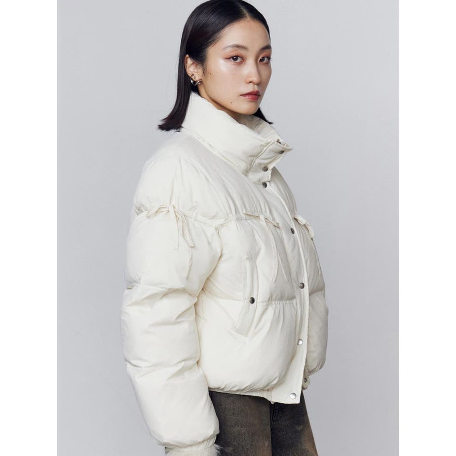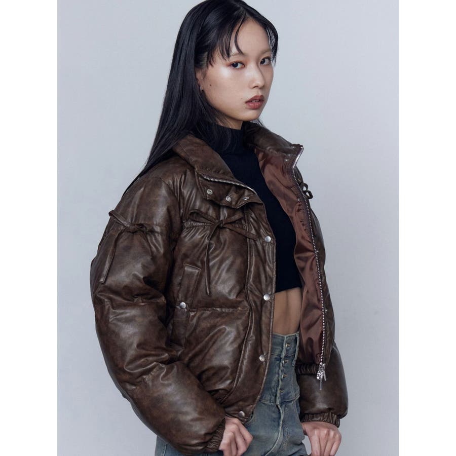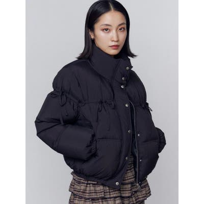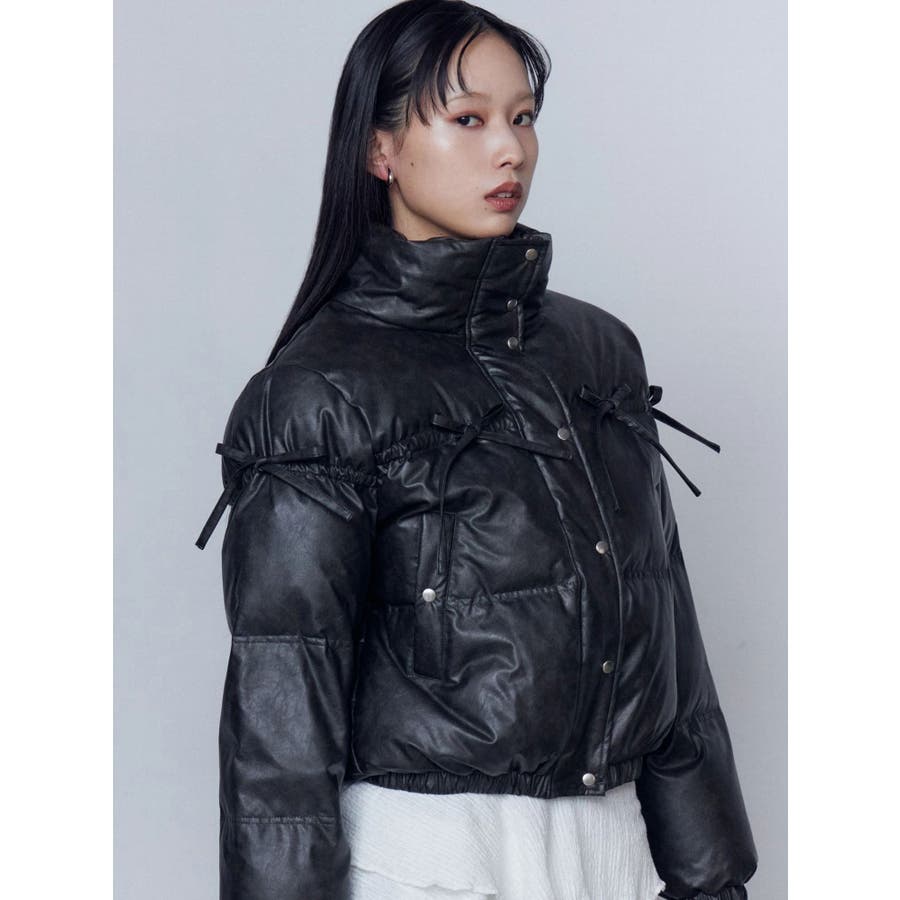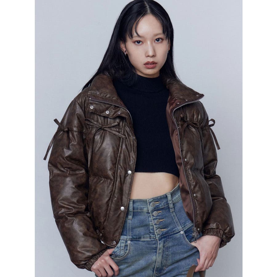 リボンストリングがポイントのダウンブルゾン■デザインリボンは絞ることが出来るので少しギャザーを加えたバランスで着用するのがおすすめです。シルキーな風合いのナイロン素材と、柔らかい風合いのフェイクレザーの展開になります。ダウンならではのボリュームと程よい丸みのあるシルエットが特徴です。ハイネックなので、防寒効果も抜群。■スタイリング骨盤にかかる位の丈なので、ボトムはミニ丈からフルレングスまで幅広く合わせていただけます。今季はティアードショートパンツと合わせるスタイリングがイチオシです。※着用画像はフラッシュの加減で実際の製品と色味等が異なる場合がございますので、生地のズームアップ画像をご確認ください。※ご利用の端末画面の設定により実際の商品と色味が異なる場合がございます。【商品特徴】透け感:なし伸縮性:なし生地の厚さ:普通サイズ感:普通裏地:なしポケット:あり
